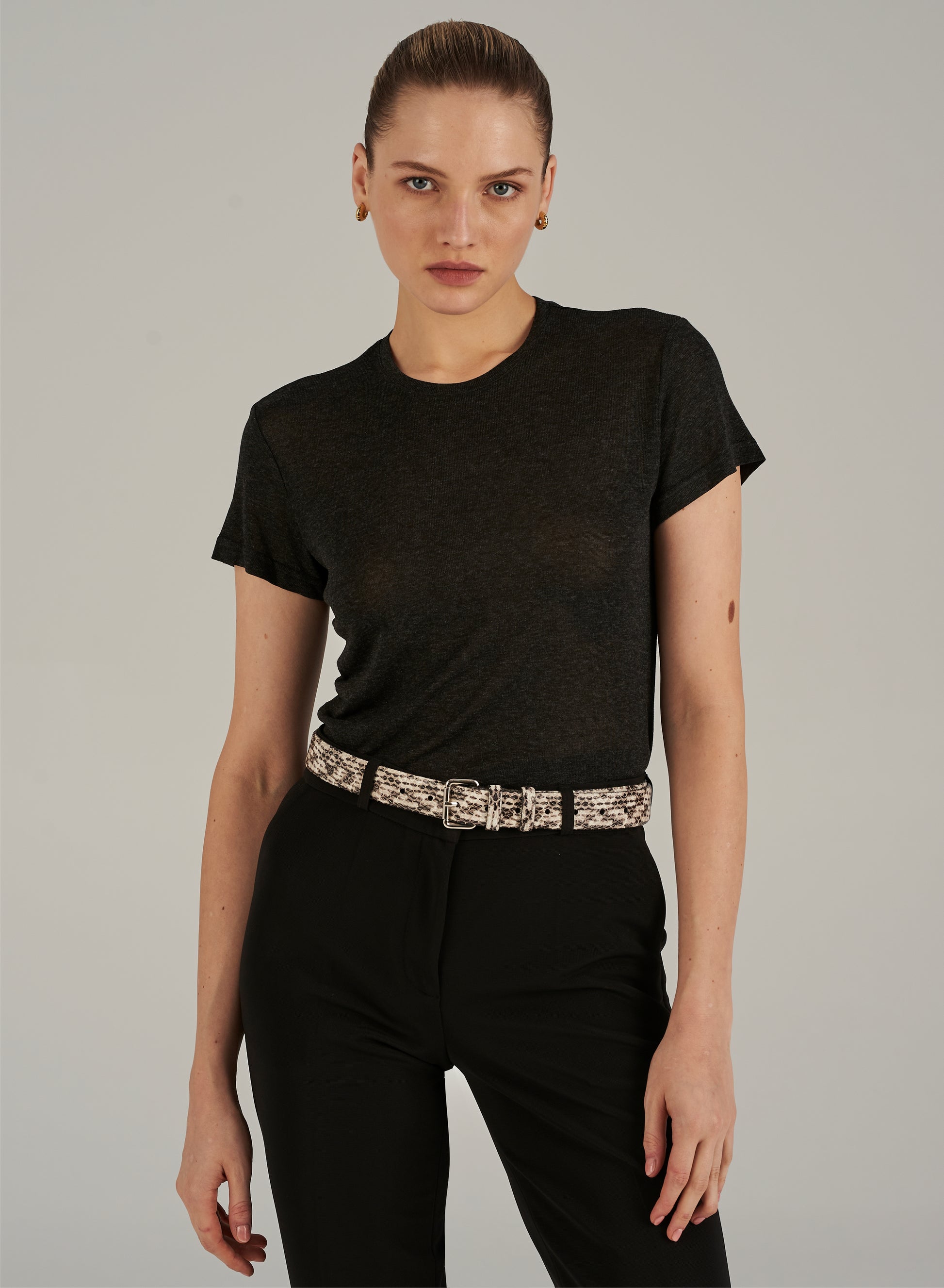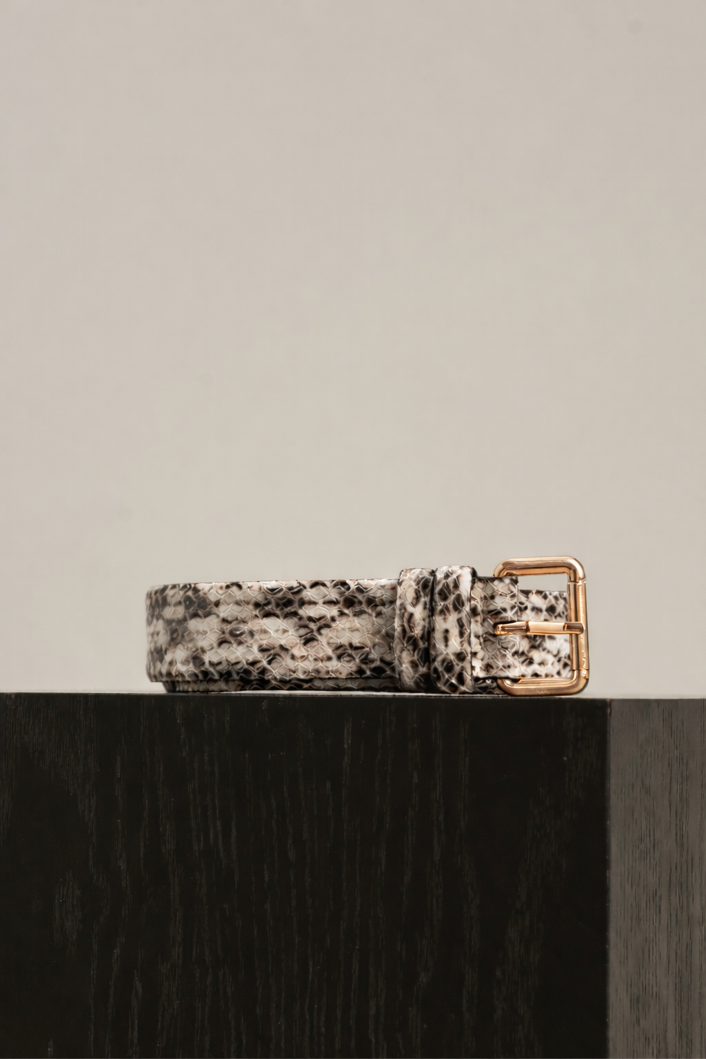 Klasyczny pasek wykonany ze skóry, tłoczonej we wzór węża. Posiada kwadratową klamrę w srebrnym kolorze.