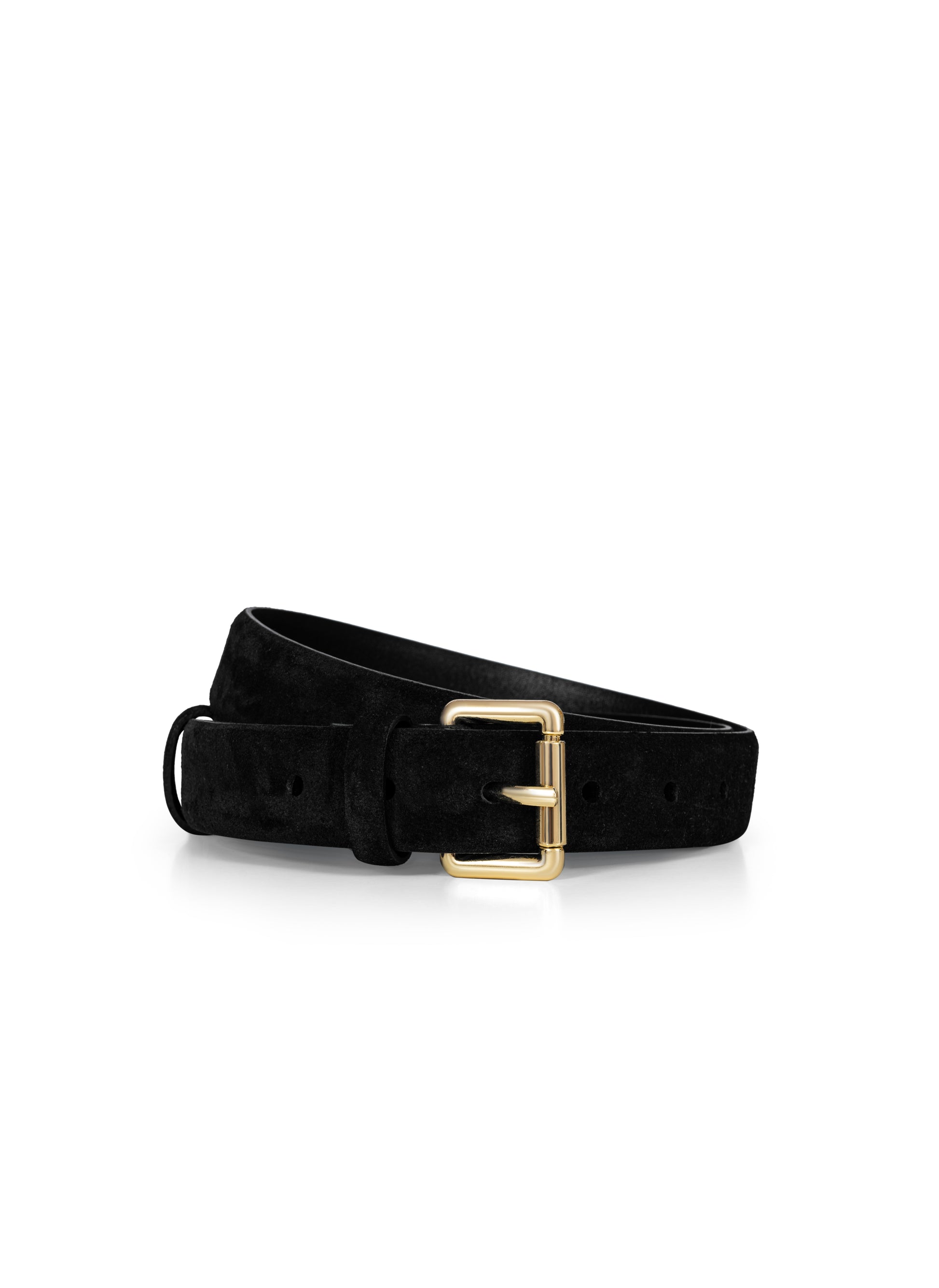 Klasyczny pasek wykonany w 100% z delikatnego zamszu w czarnym odcieniu. Posiada kwadratową klamrę w złotym kolorze.