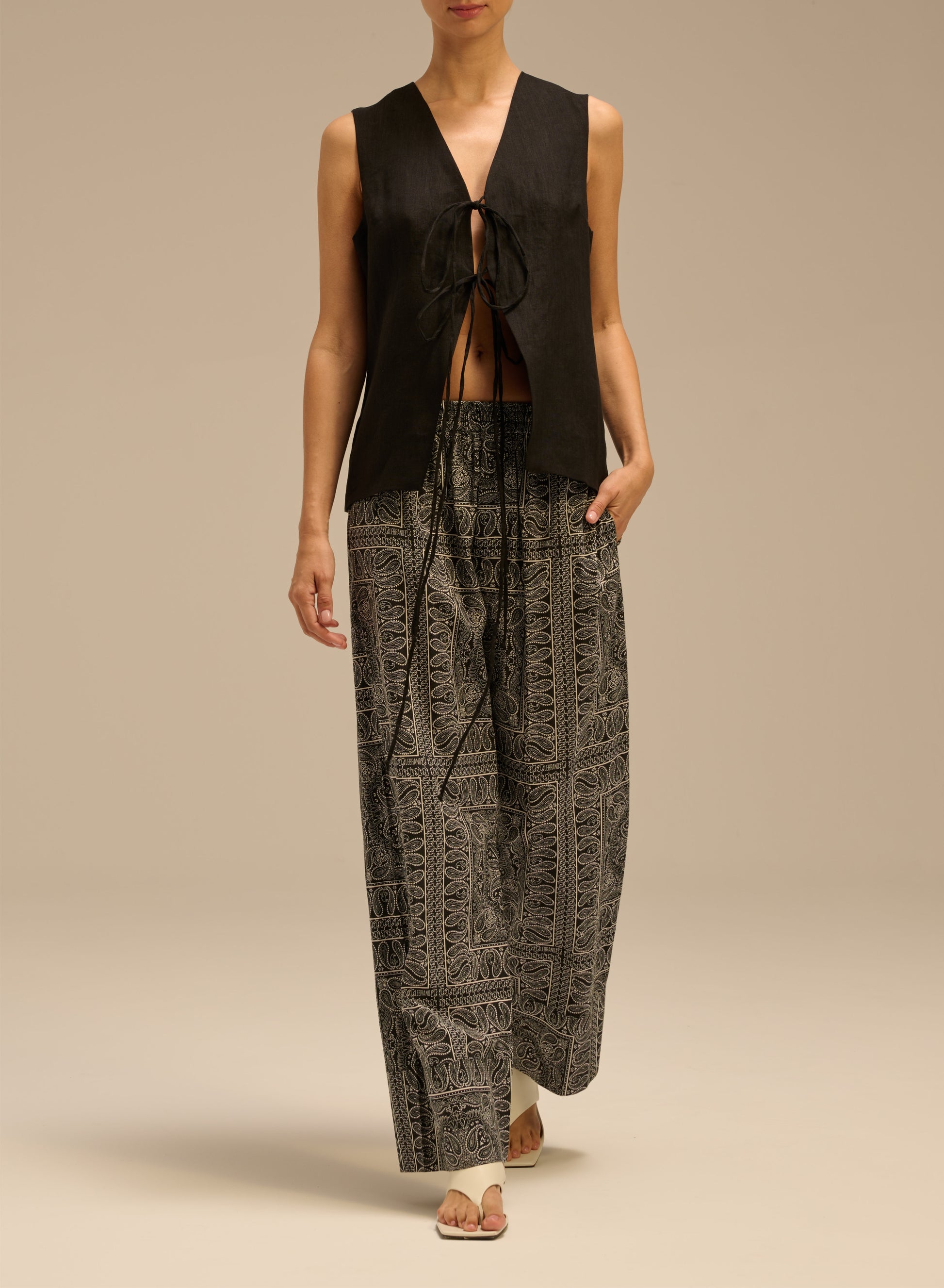 Luźna kamizelka wykonana z lekkiego lnu, zawiązywana na troczki.