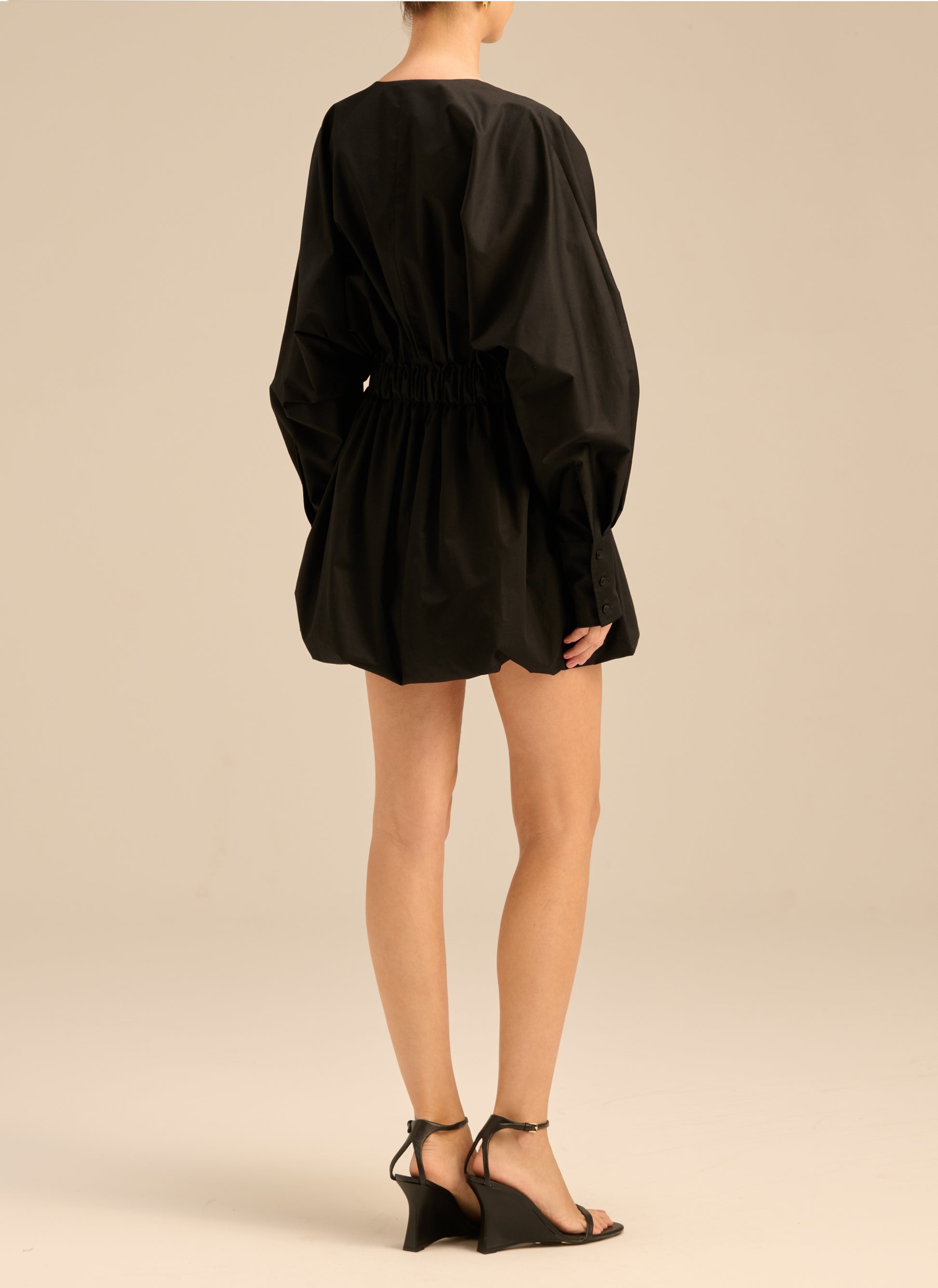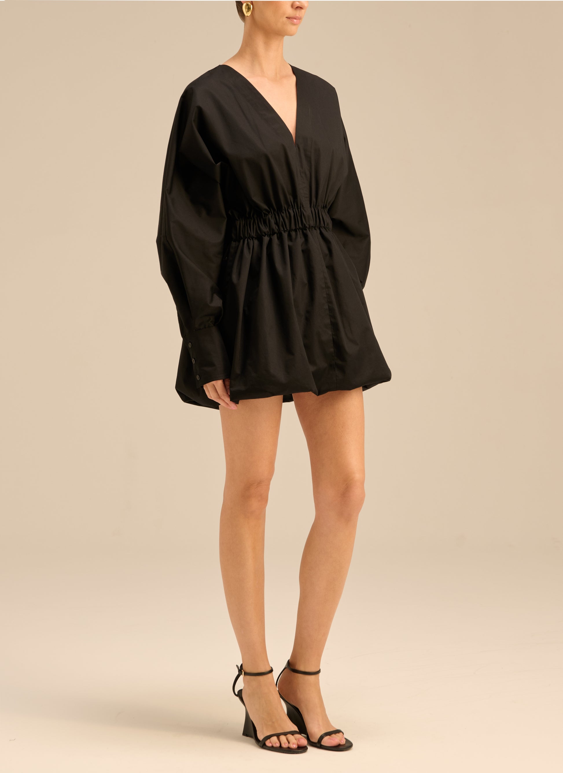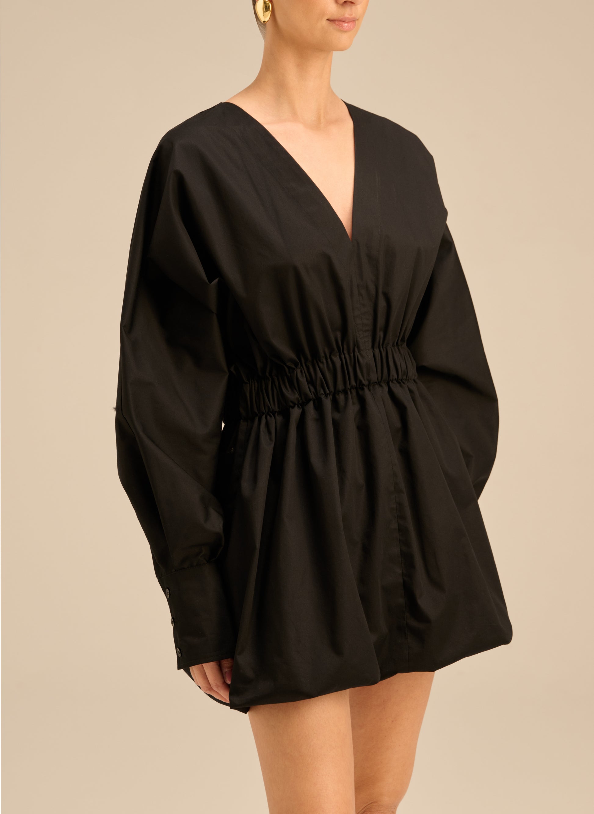 Sukienka o długości mini i kroju oversize wykonana z lekkiej bawełny w czarnym kolorze. Posiada gumę w talii, długie mankiety zapinane na 3 guziki, elastyczny dół oraz dekolt w serek.