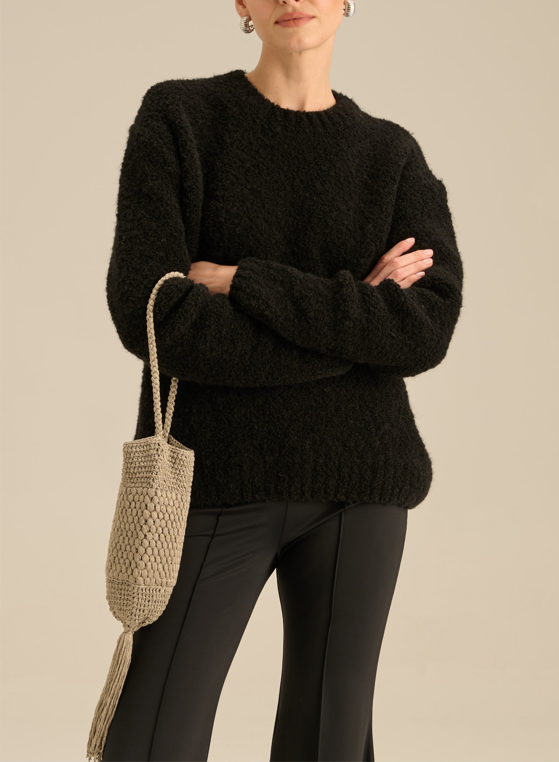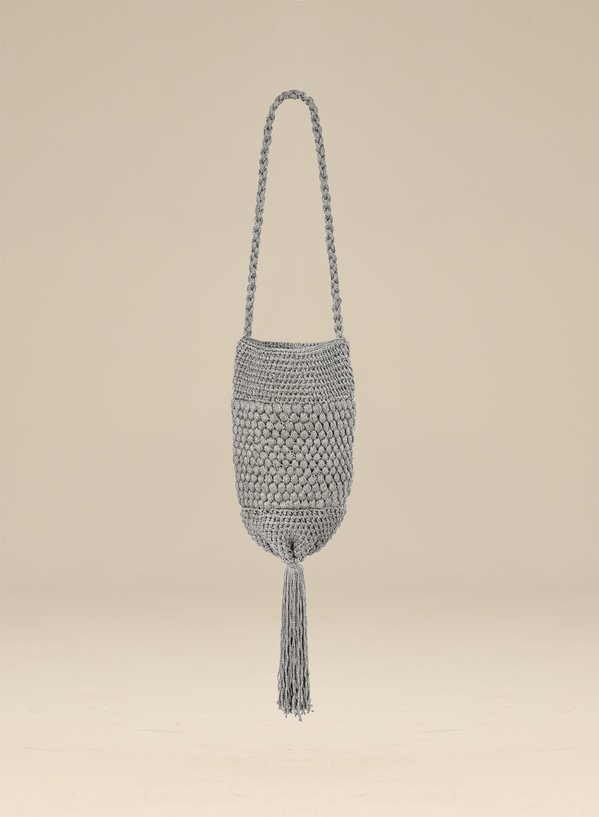 Lekka torebka z ręcznie plecionej bawełny, zdobiona długimi troczkami.