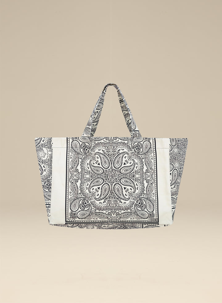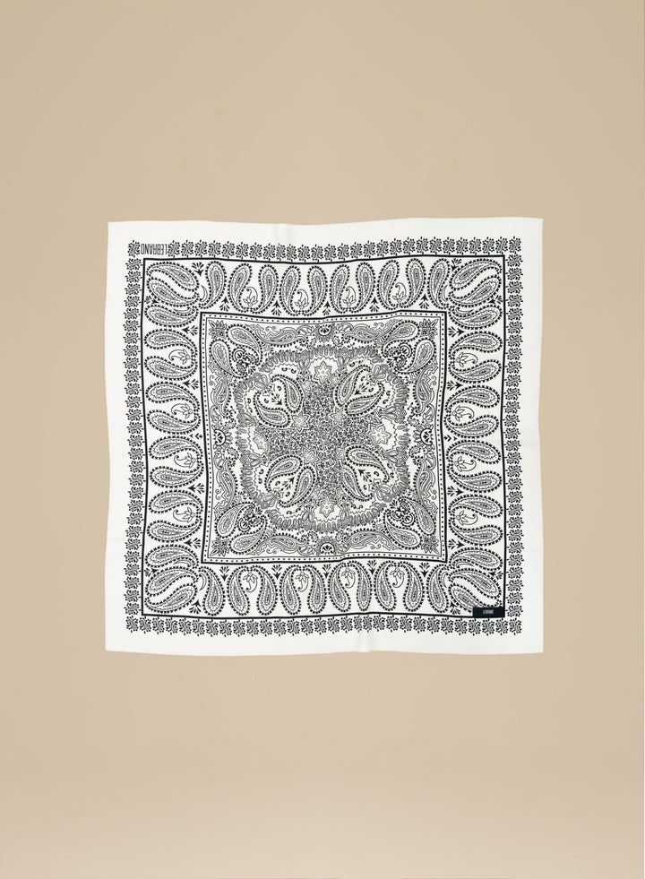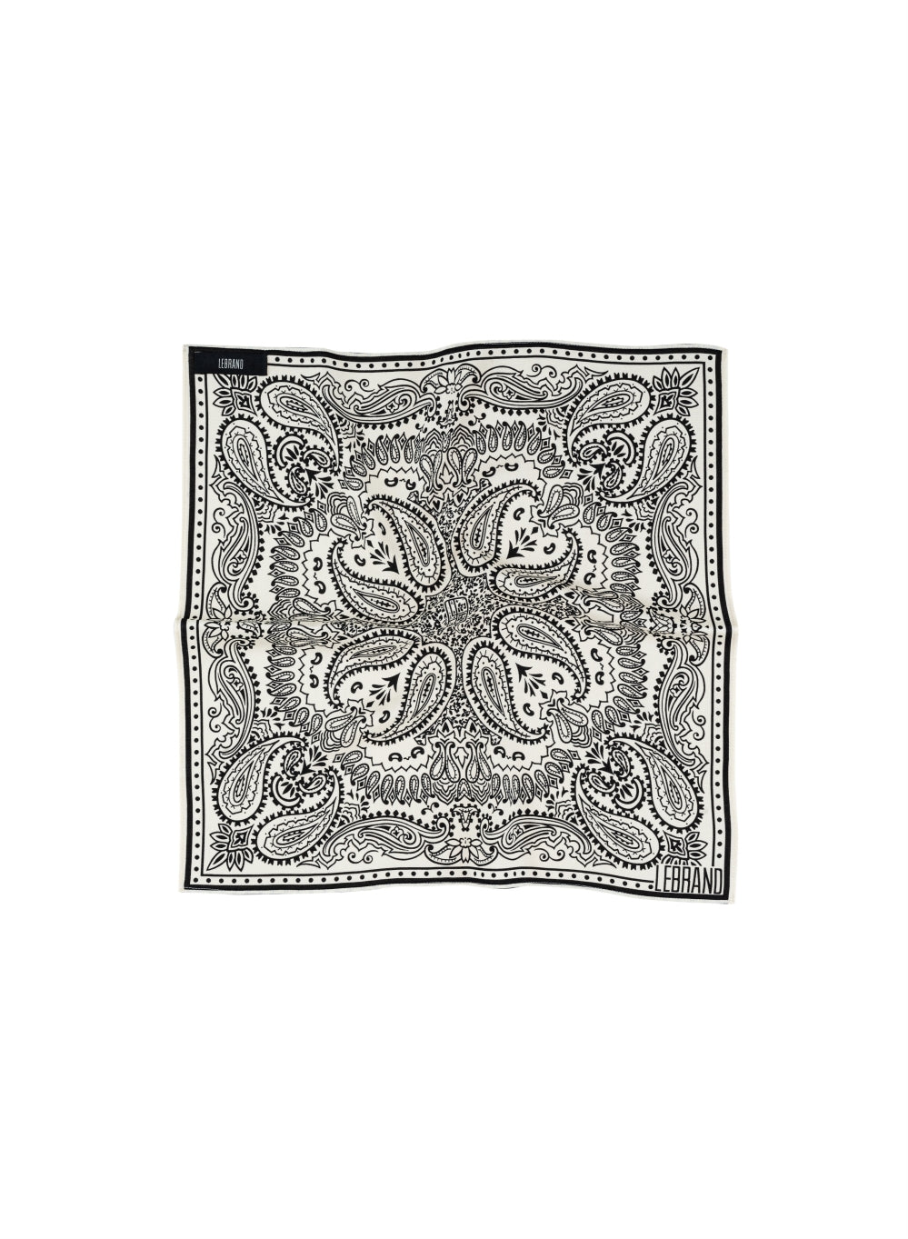 Uniwersalna bandana w rozmiarze mini, ręcznie wykończona, wykonana z miękkiej wiskozy w kolorze ecru-czarnym.