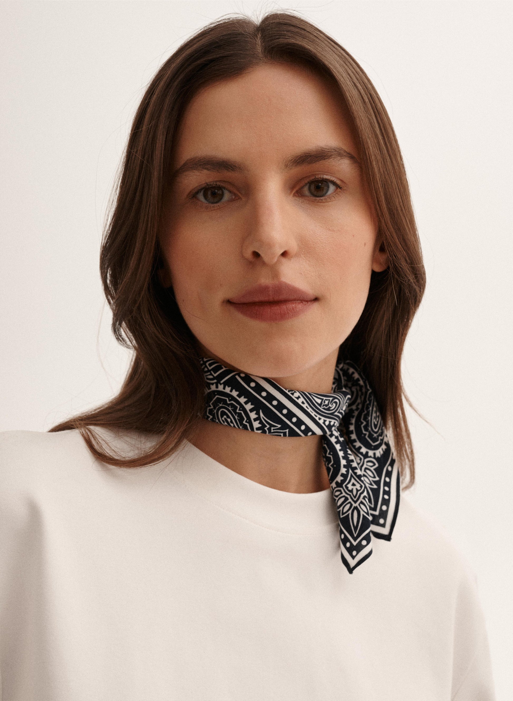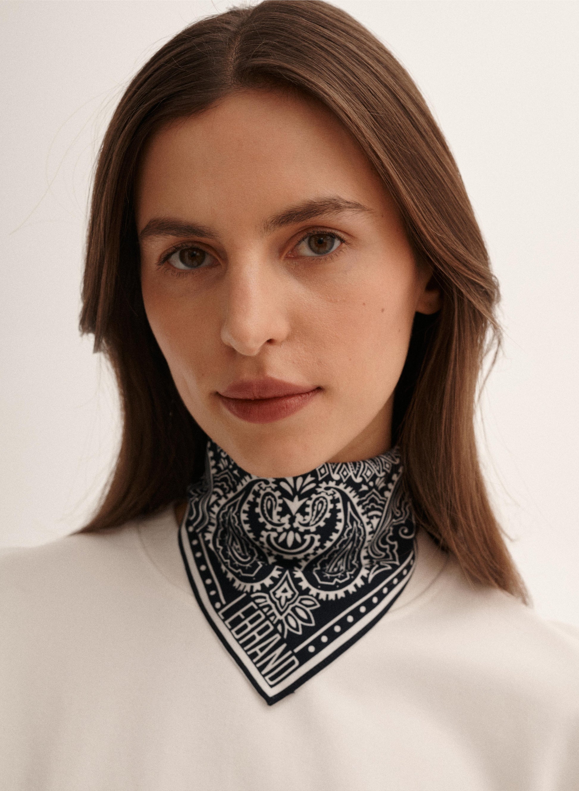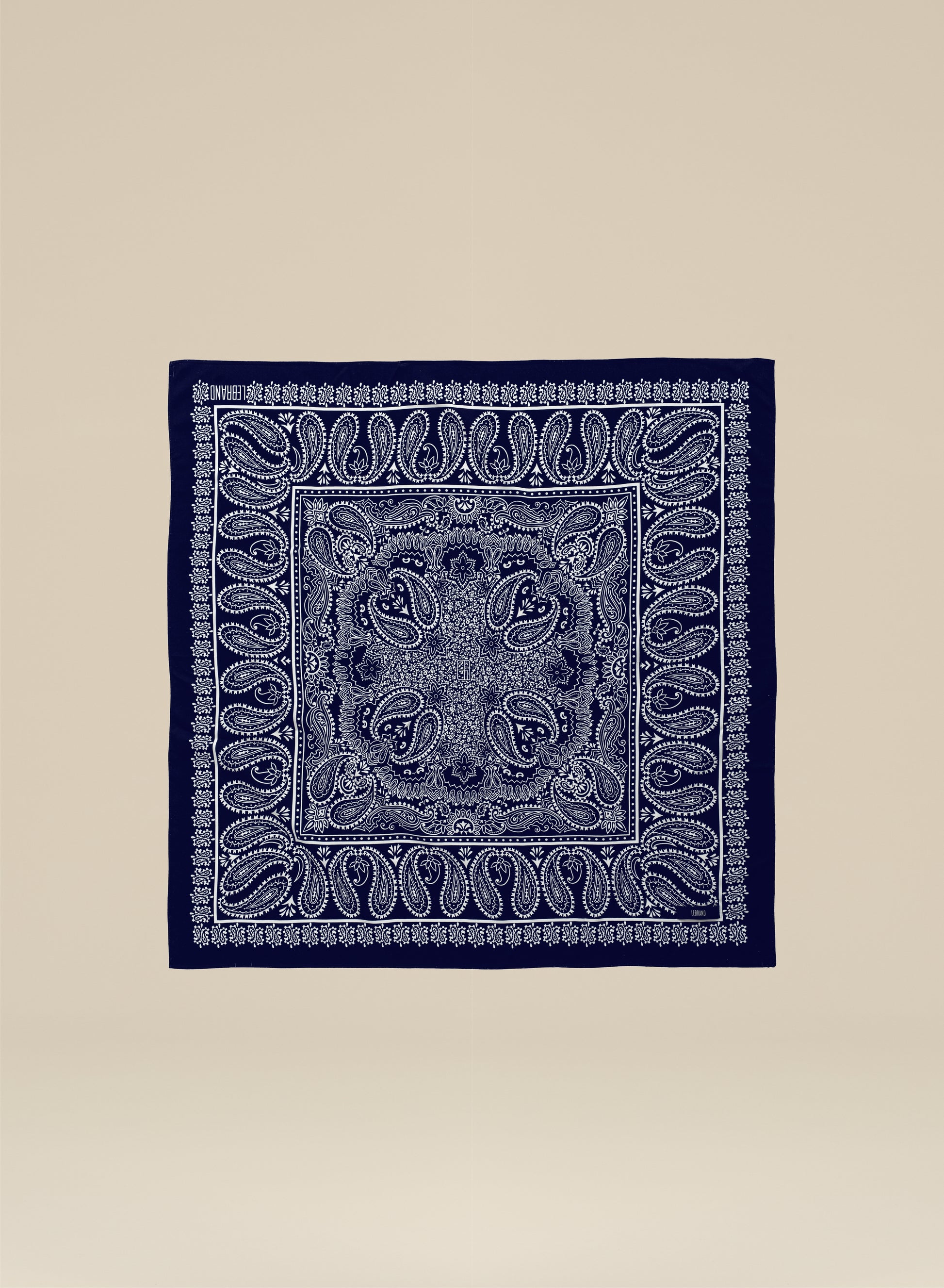 Uniwersalna bandana w rozmiarze mini, ręcznie wykończona, wykonana z miękkiej wiskozy w kolorze głębokiego granatu z białym nadrukiem.