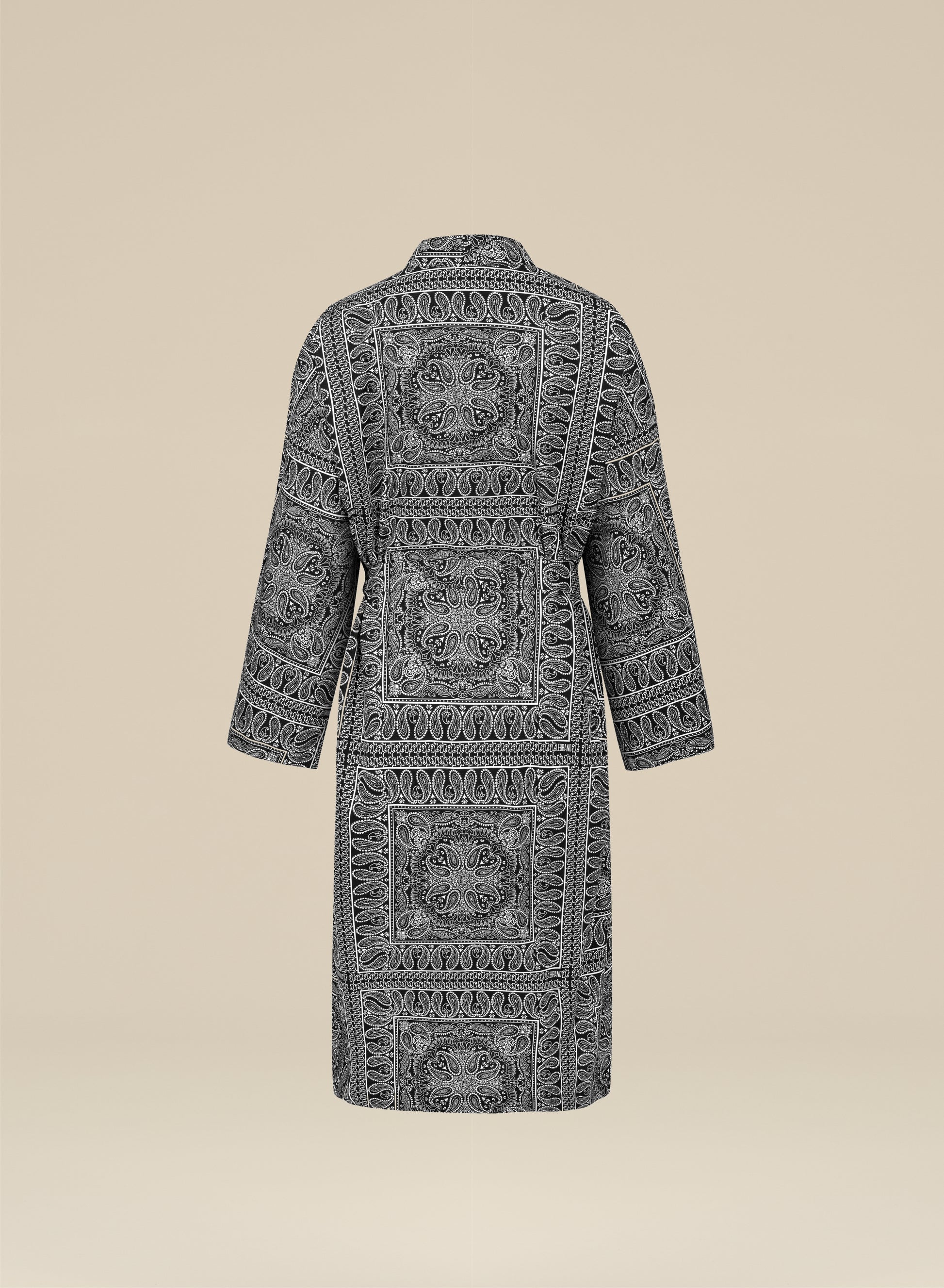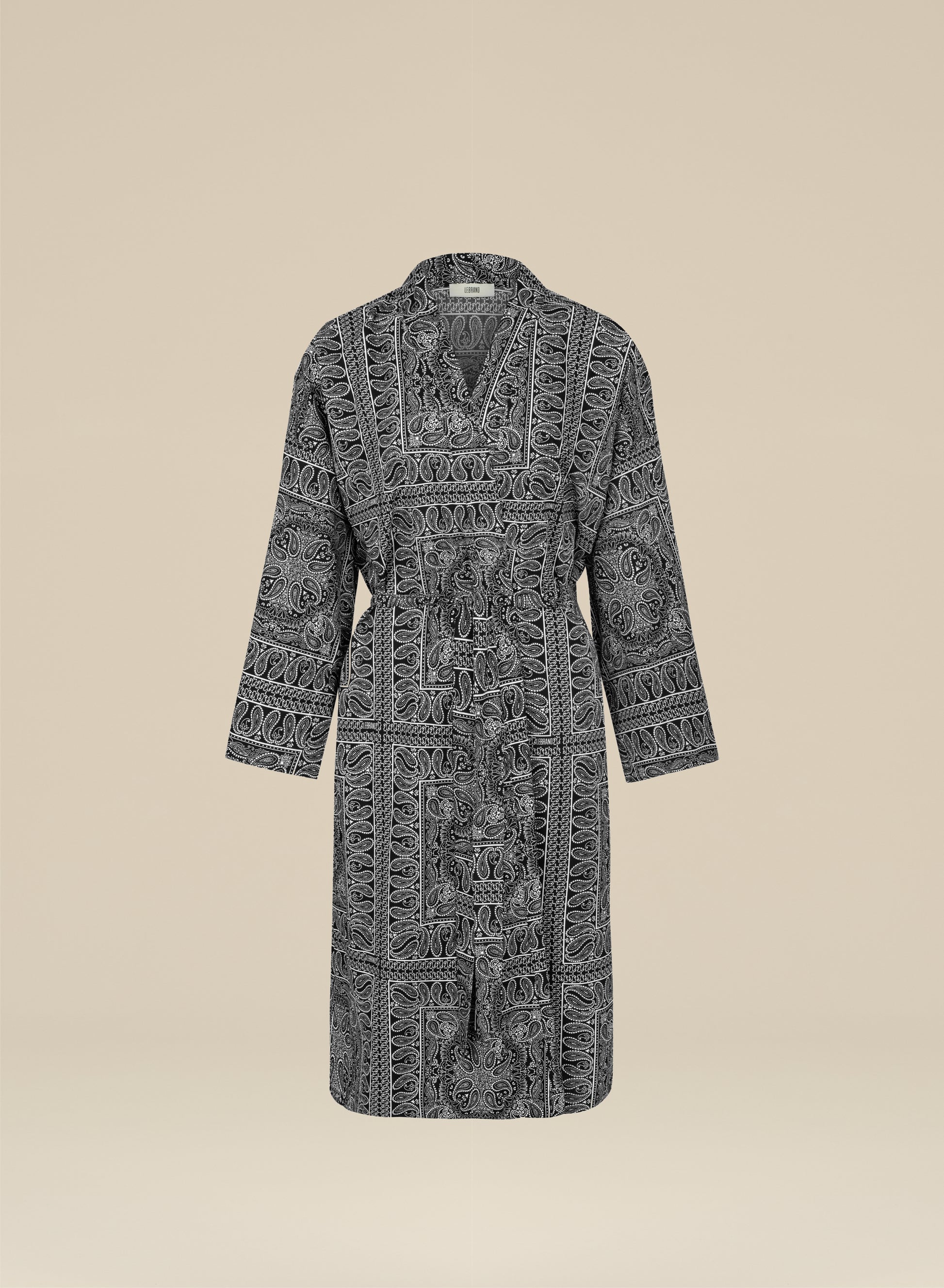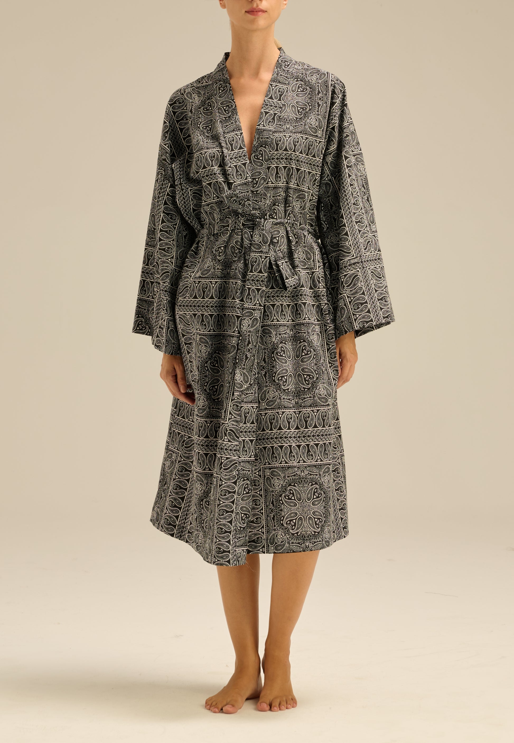 Lekkie, wielofunkcyjne kimono o prostym kroju i długości do połowy łydki. Posiada szerokie rękawy oraz pasek wiązany w talii, umożliwiający dopasowanie do sylwetki. Wykonane z miękkiej bawełny.