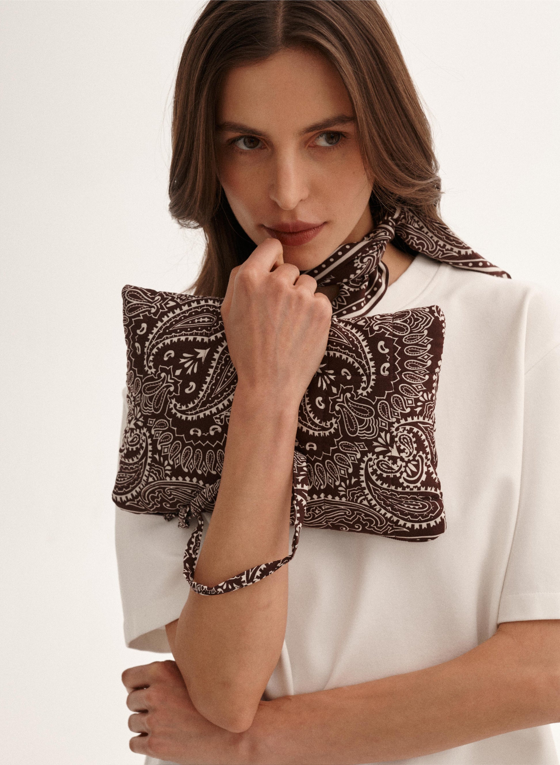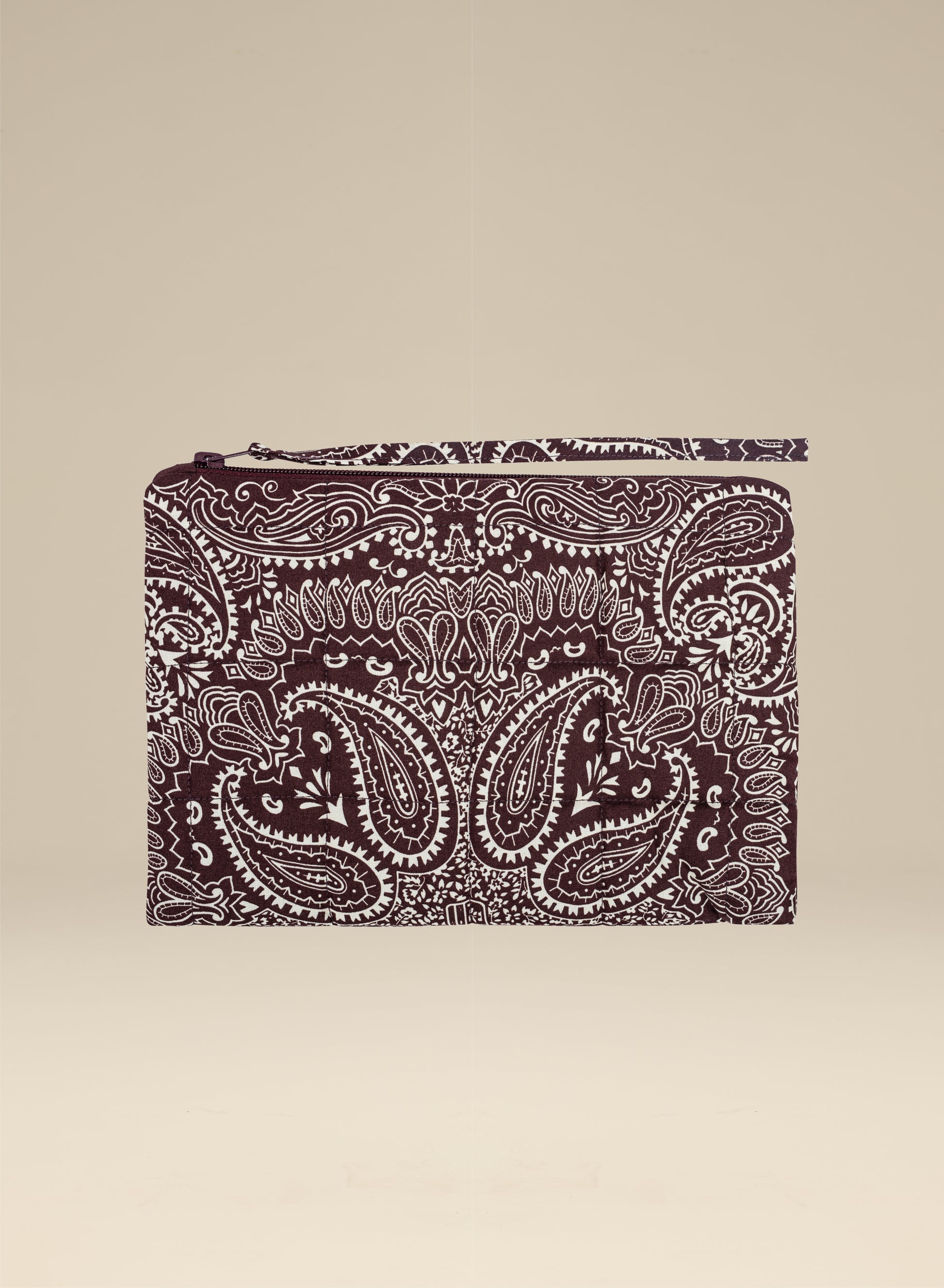 Torebka - kosmetyczka wykonana z miękkiej wiskozy w kolorze burgudowo-ecru. Zapinana na zamek, posiada małą kieszonkę wewnątrz.