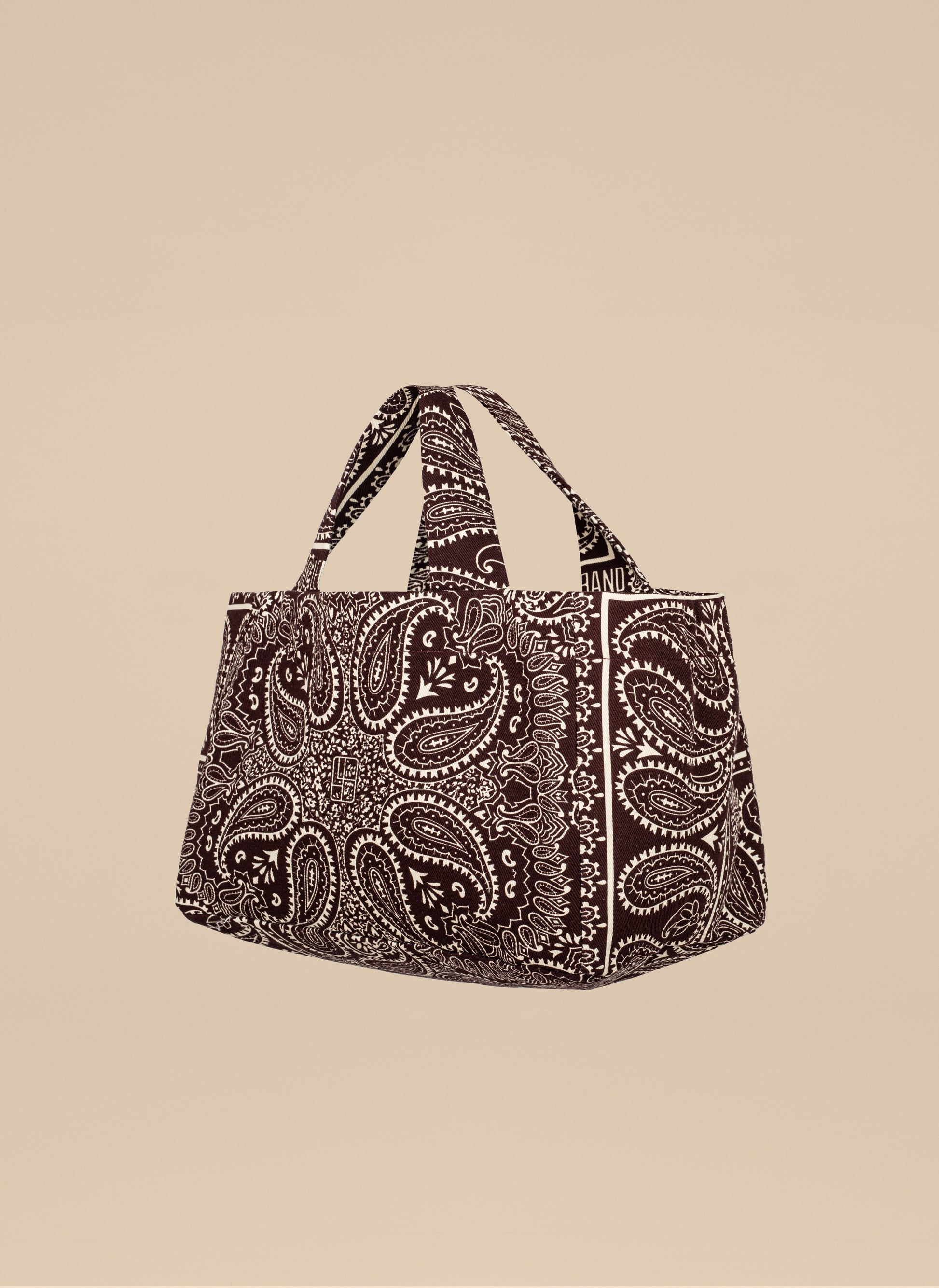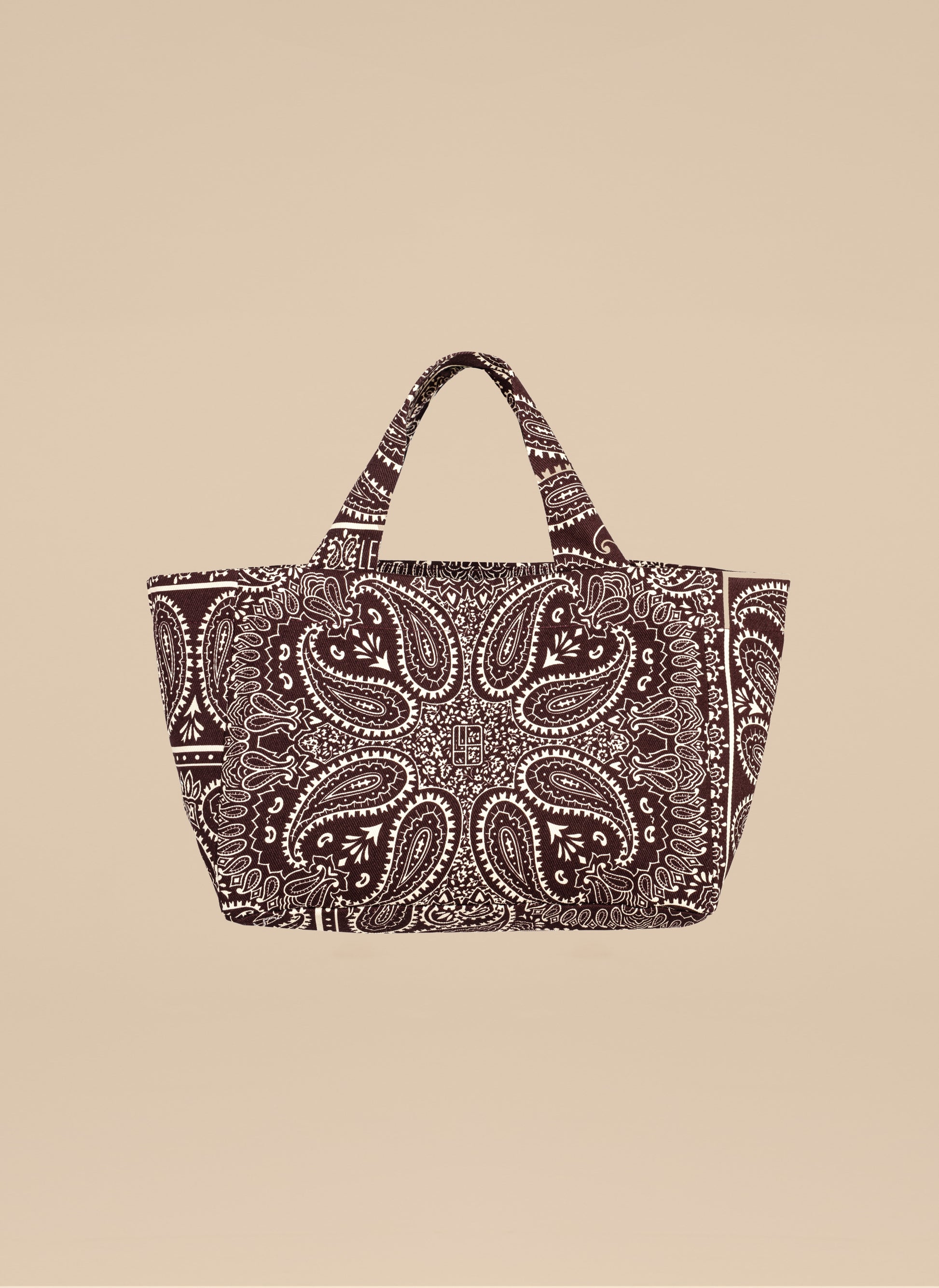 Mała torba typu mini shopper wykonana z grubego bawełnianego płótna z nadrukiem bandany w kolorze bordo i ecru. Bez zapięcia, posiada jedną wewnętrzną kieszonkę.