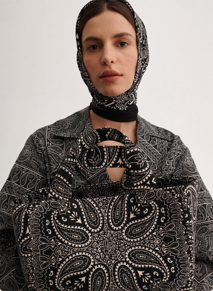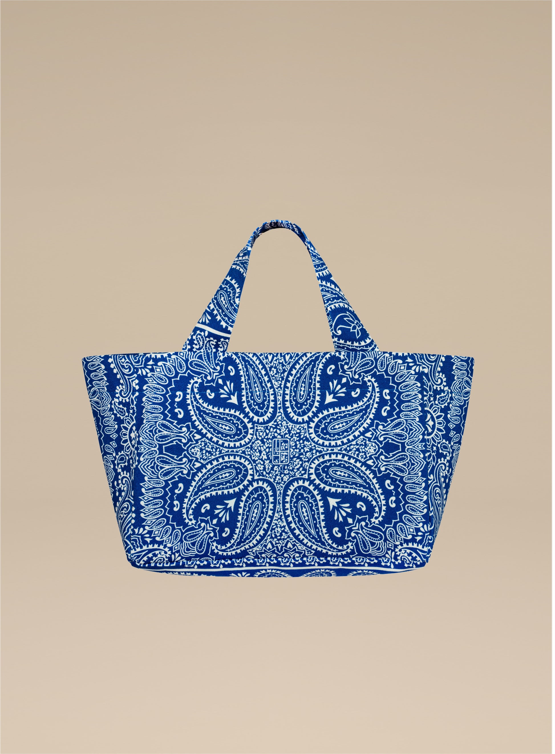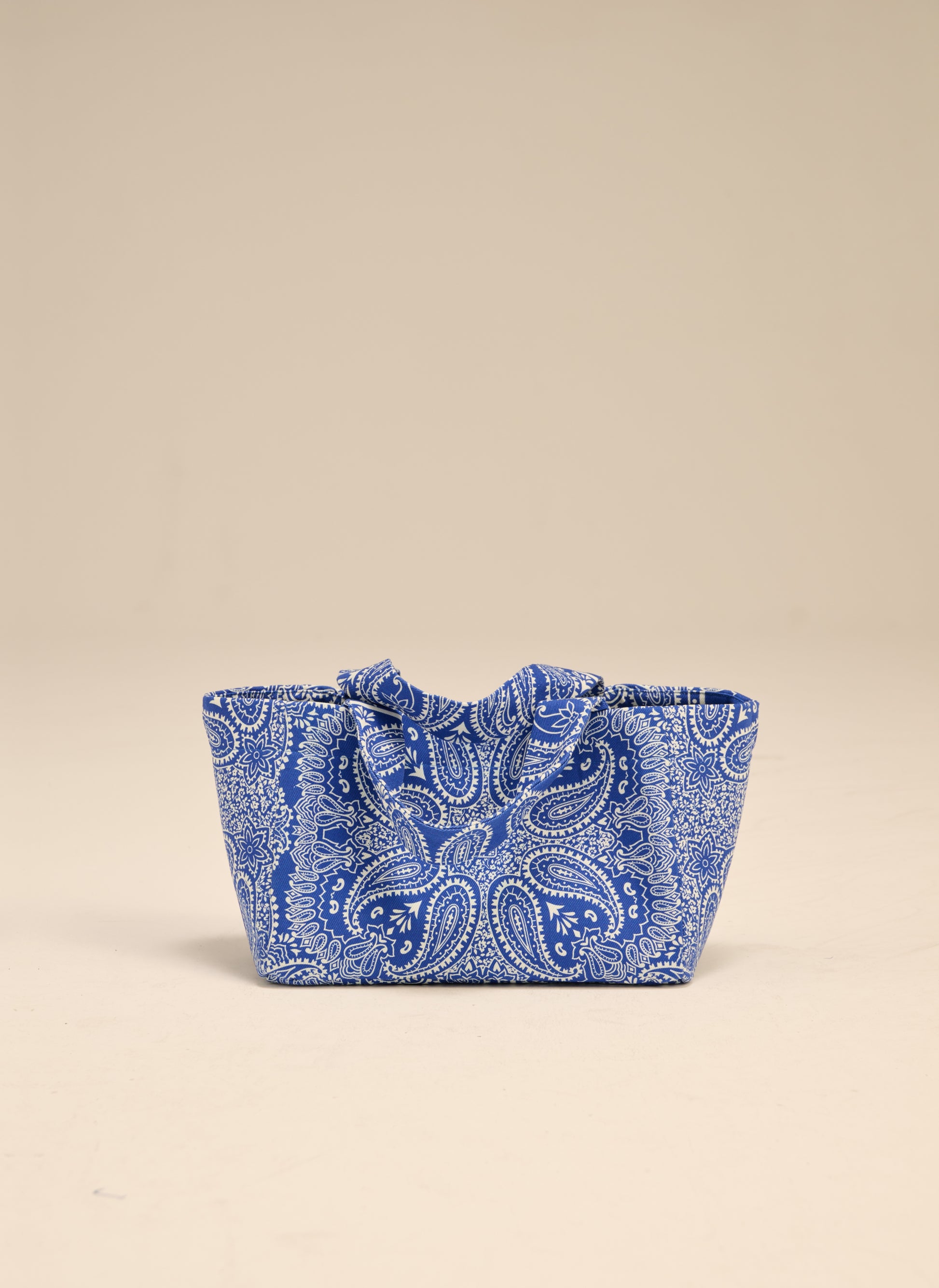 Mała torba typu mini shopper wykonana z grubego bawełnianego płótna z nadrukiem bandany w kolorze chabrowym i ecru. Bez zapięcia, posiada jedną wewnętrzną kieszonkę.