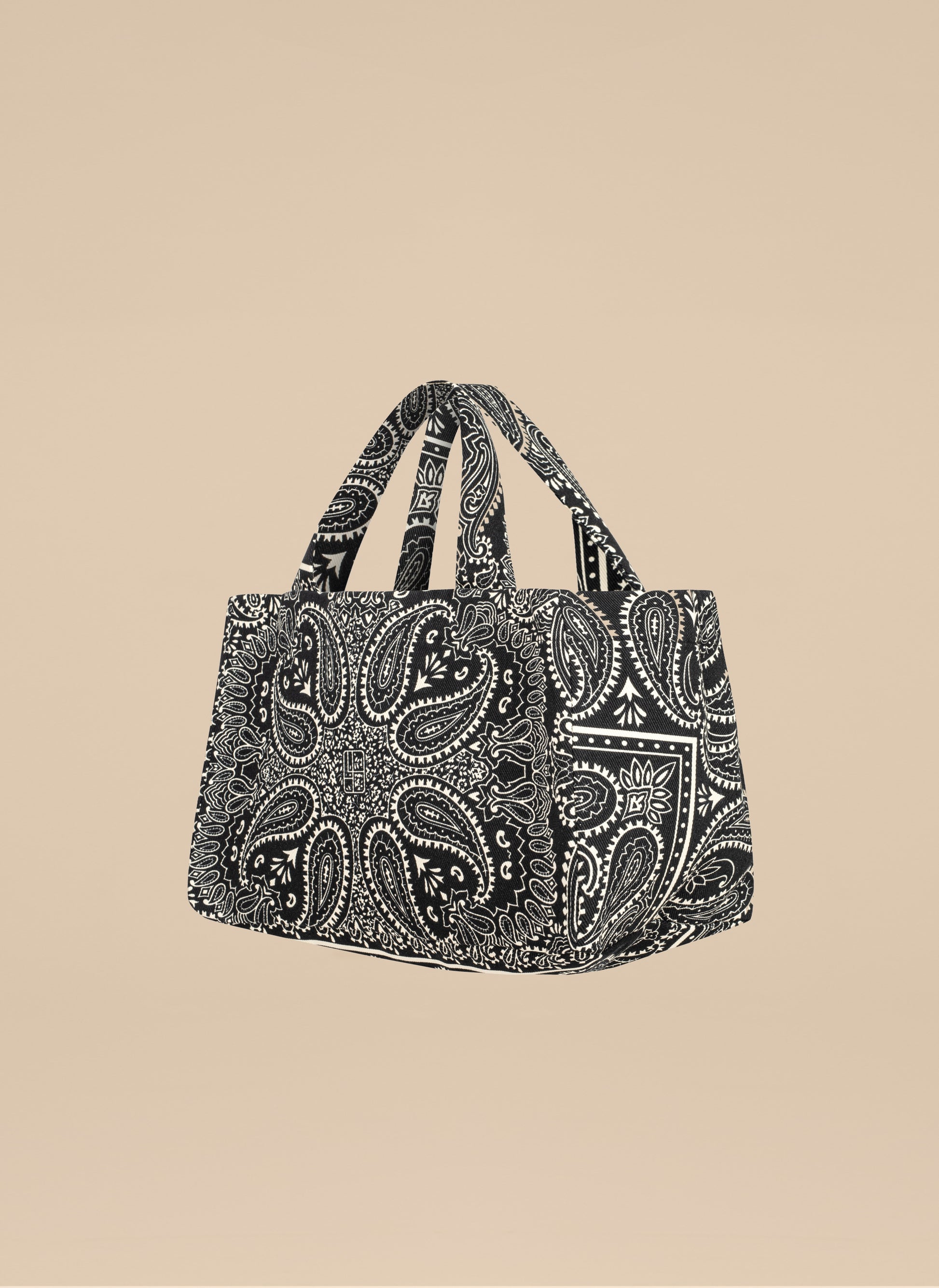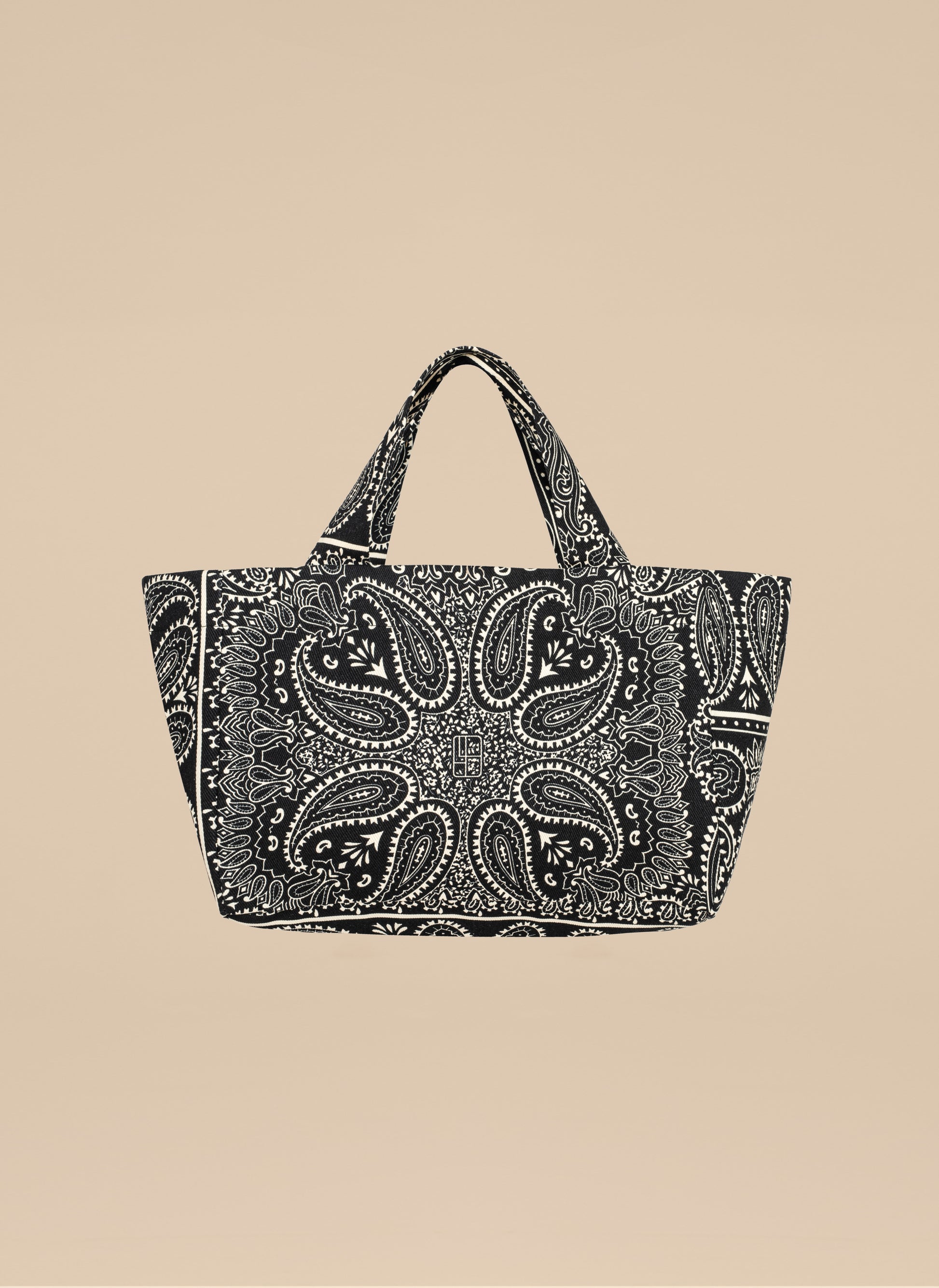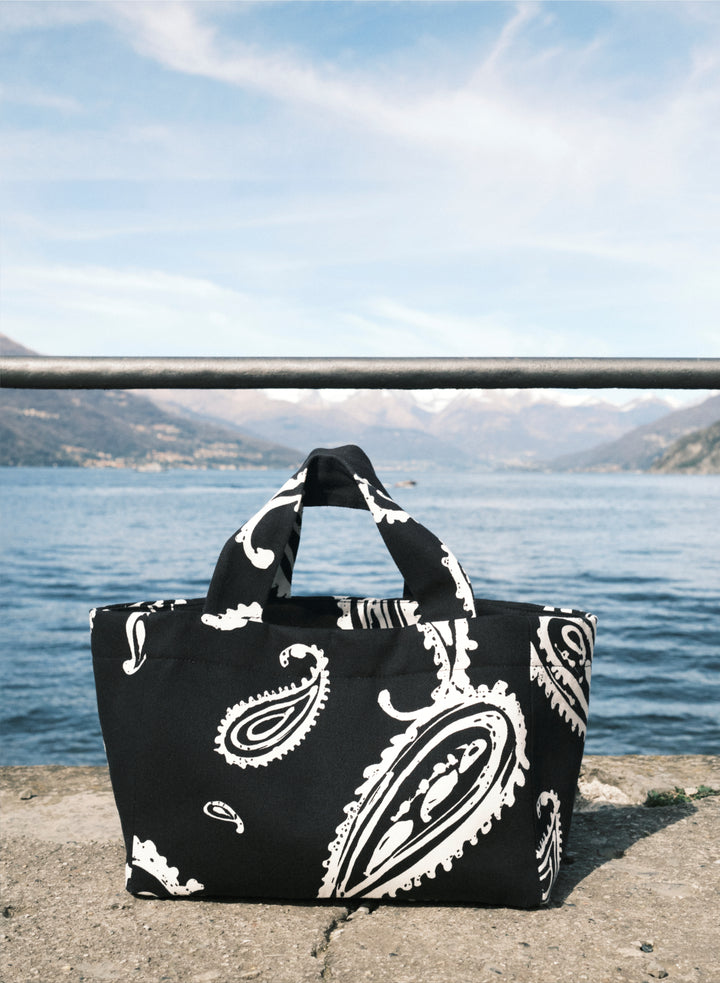 Mała torba typu mini shopper wykonana z grubego bawełnianego płótna z nadrukiem bandany w kolorze czarnym i ecru. Bez zapięcia, posiada jedną wewnętrzną kieszonkę.
