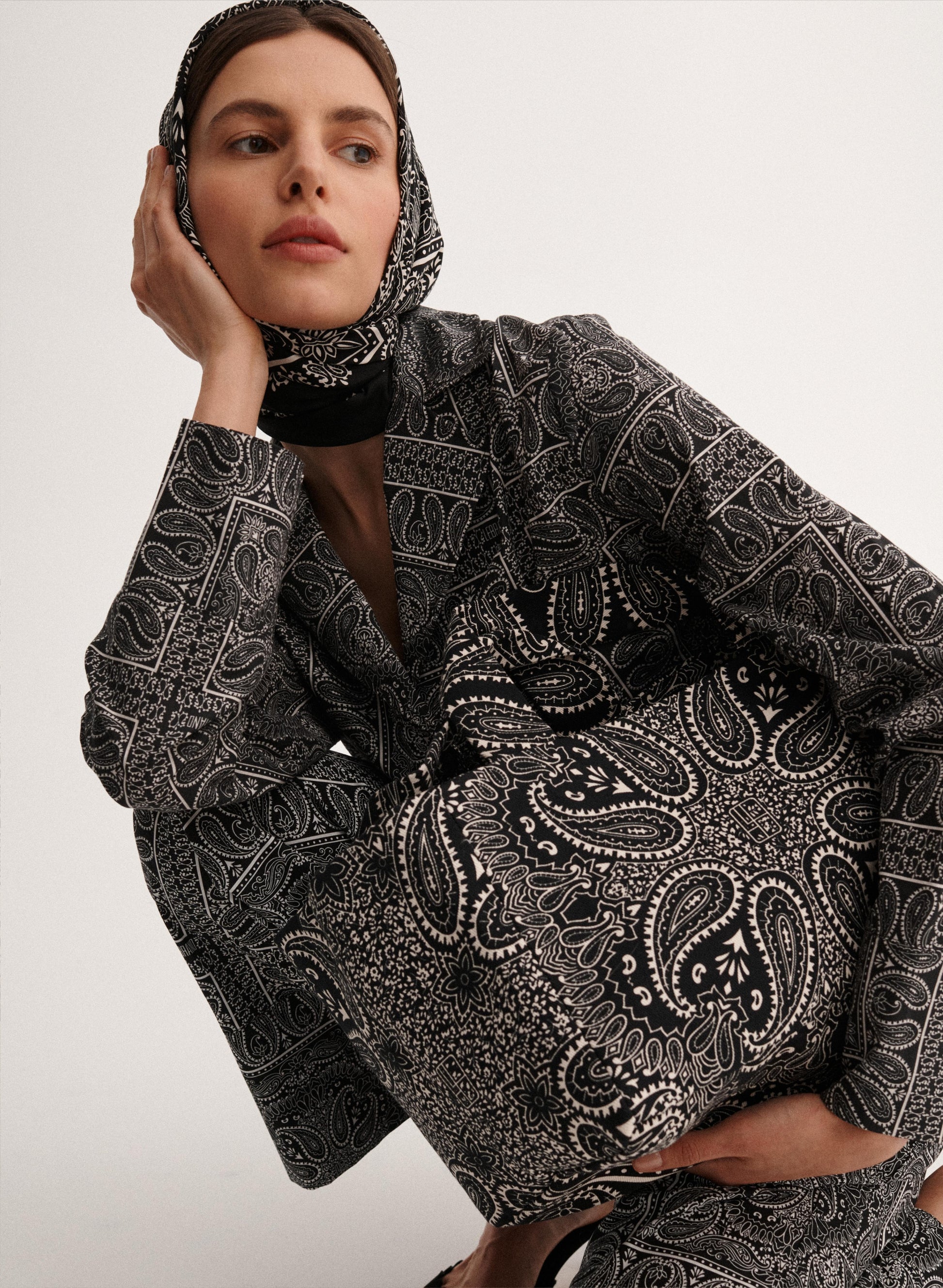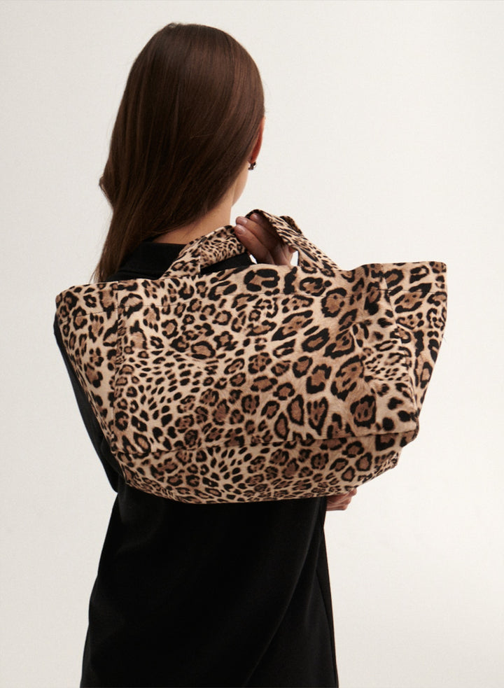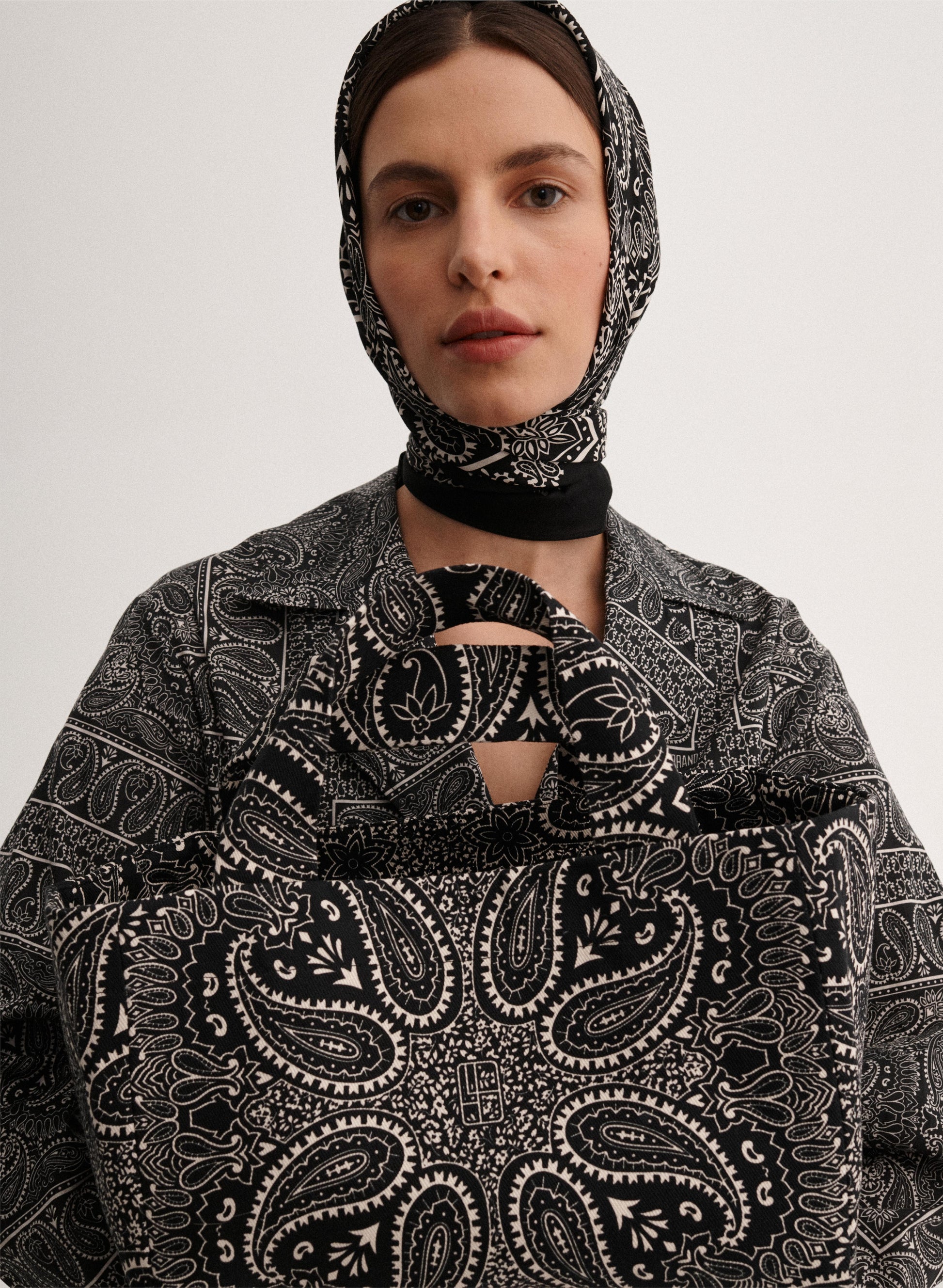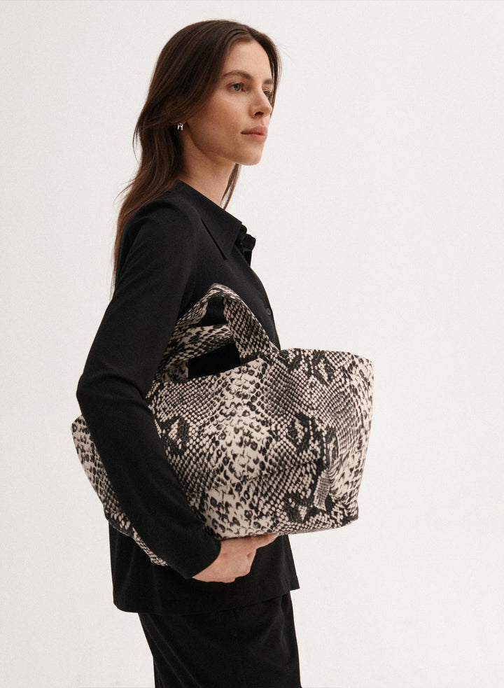 Mała torba typu mini shopper wykonana z grubego bawełnianego płótna z nadrukiem bandany w kolorze czarnym i ecru. Bez zapięcia, posiada jedną wewnętrzną kieszonkę.