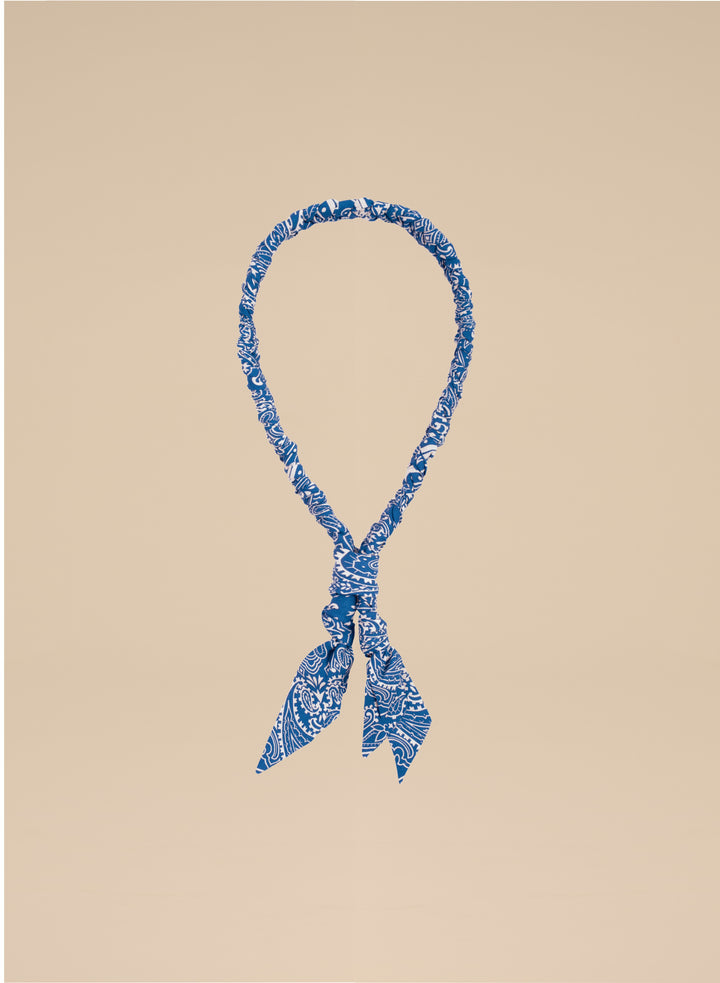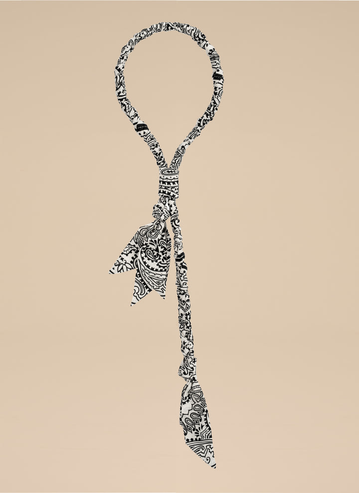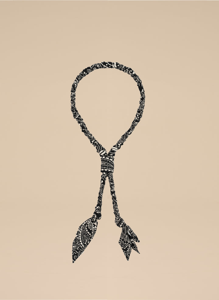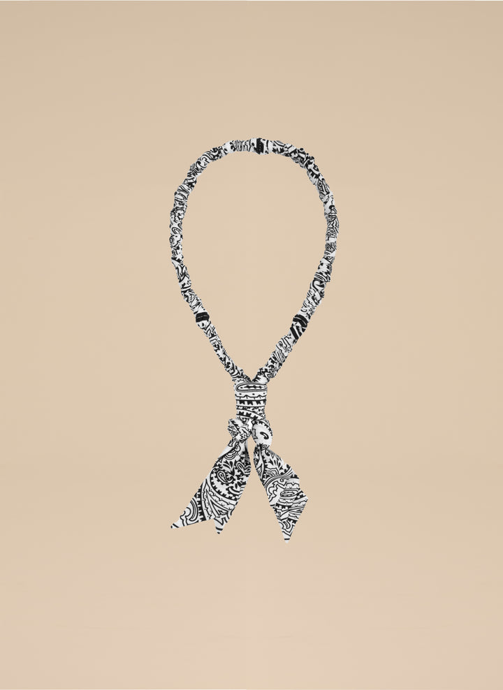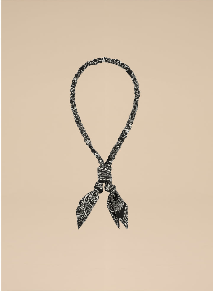 Naszyjnik wykonany z delikatnego materiału w charakterystyczny wzór bandany w kolorze czerwonym. Posiada ściągacz do regulacji długości.