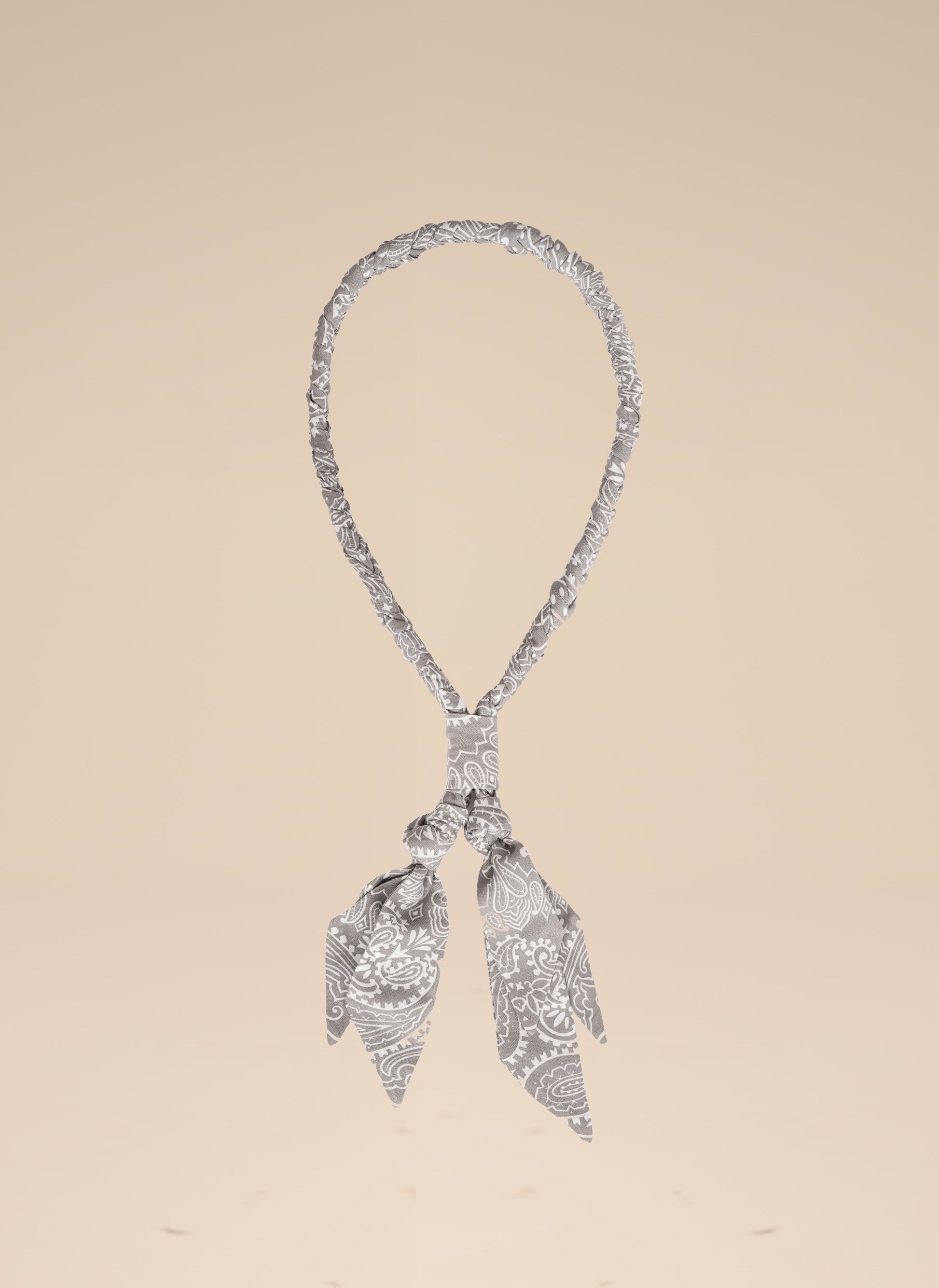 Naszyjnik wykonany z delikatnego materiału w charakterystyczny wzór bandany w szarym kolorze. Posiada ściągacz do regulacji długości.