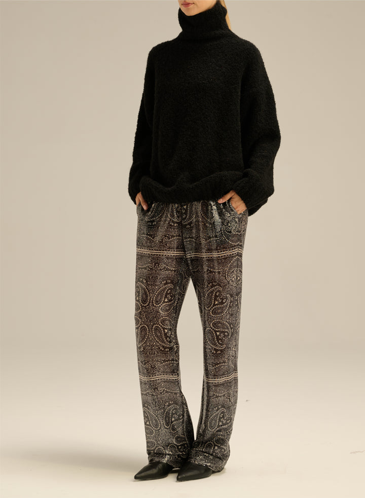 Szerokie spodnie z długimi nogawkami, wykonane z lekkiej bawełny drukowanej w rozpoznawalny print bandany. Posiadają elastyczny pas oraz dwie boczne kieszenie.