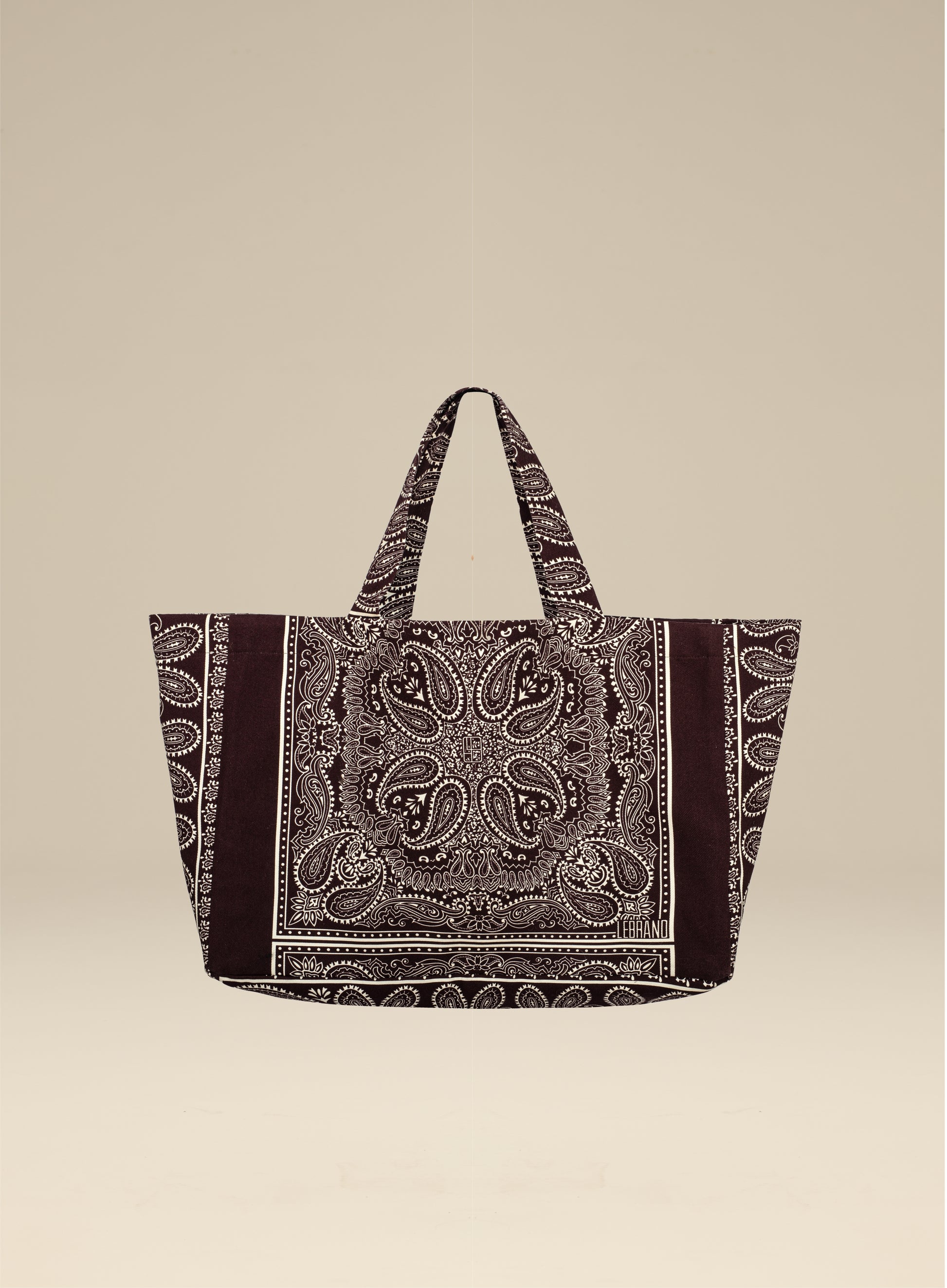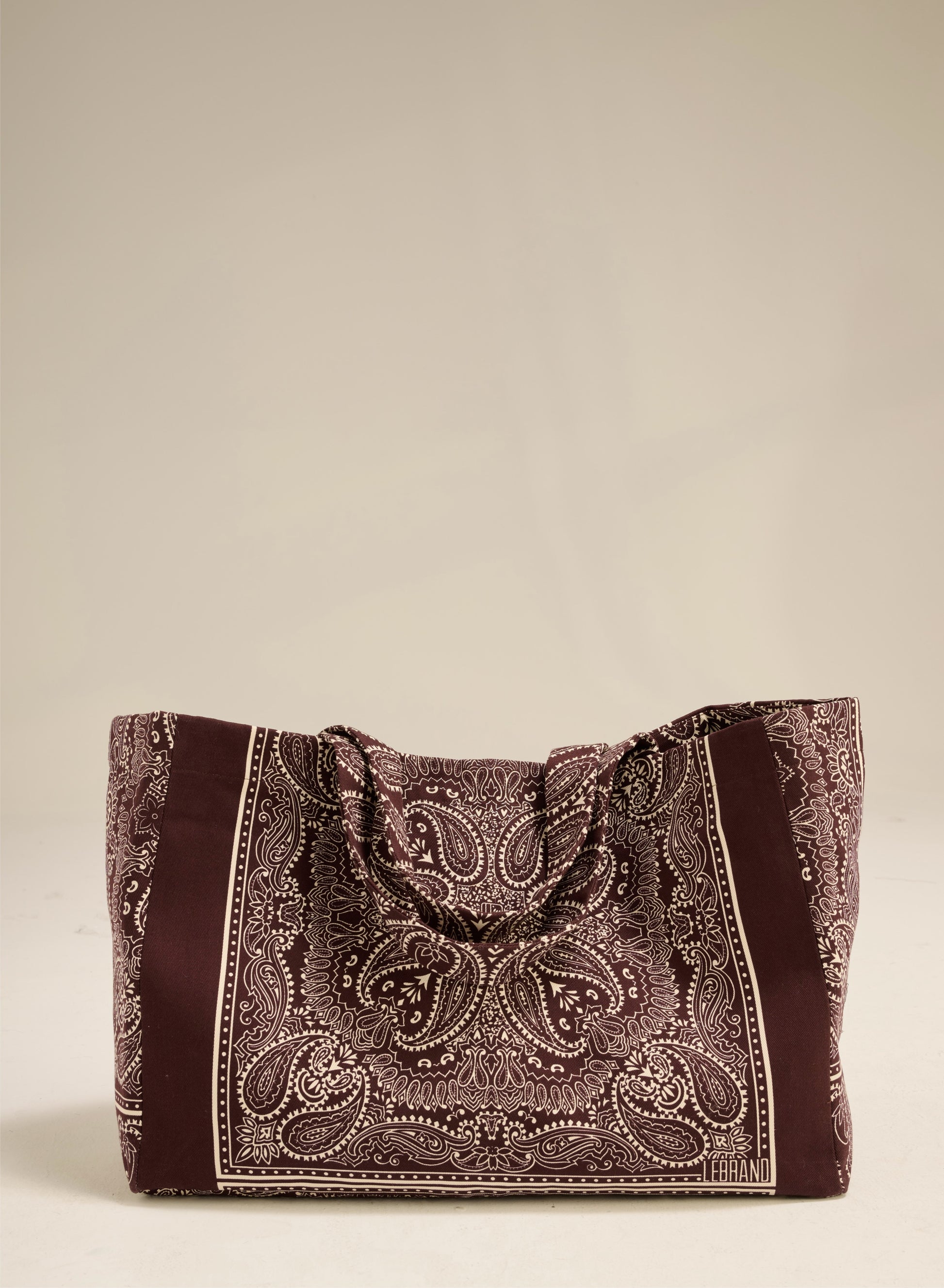 Torba oversize typu shopper wykonana z grubego bawełnianego płótna z nadrukiem bandany w kolorze burgundowym i ecru.