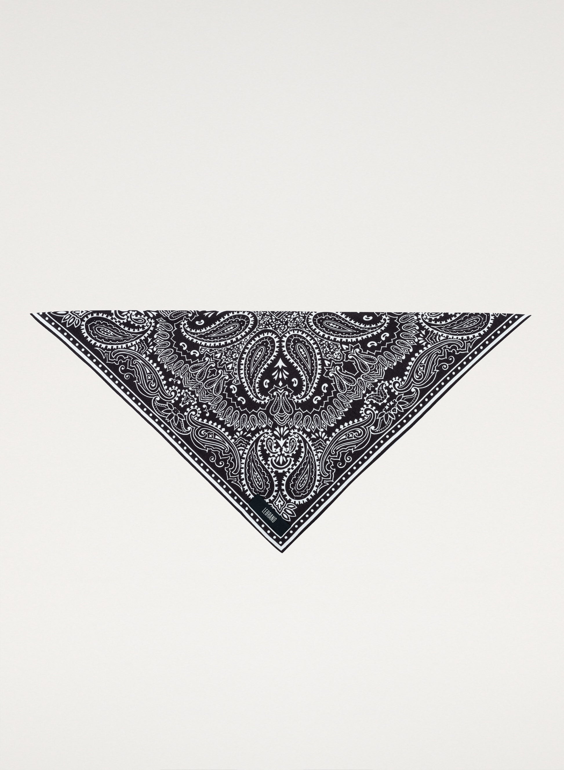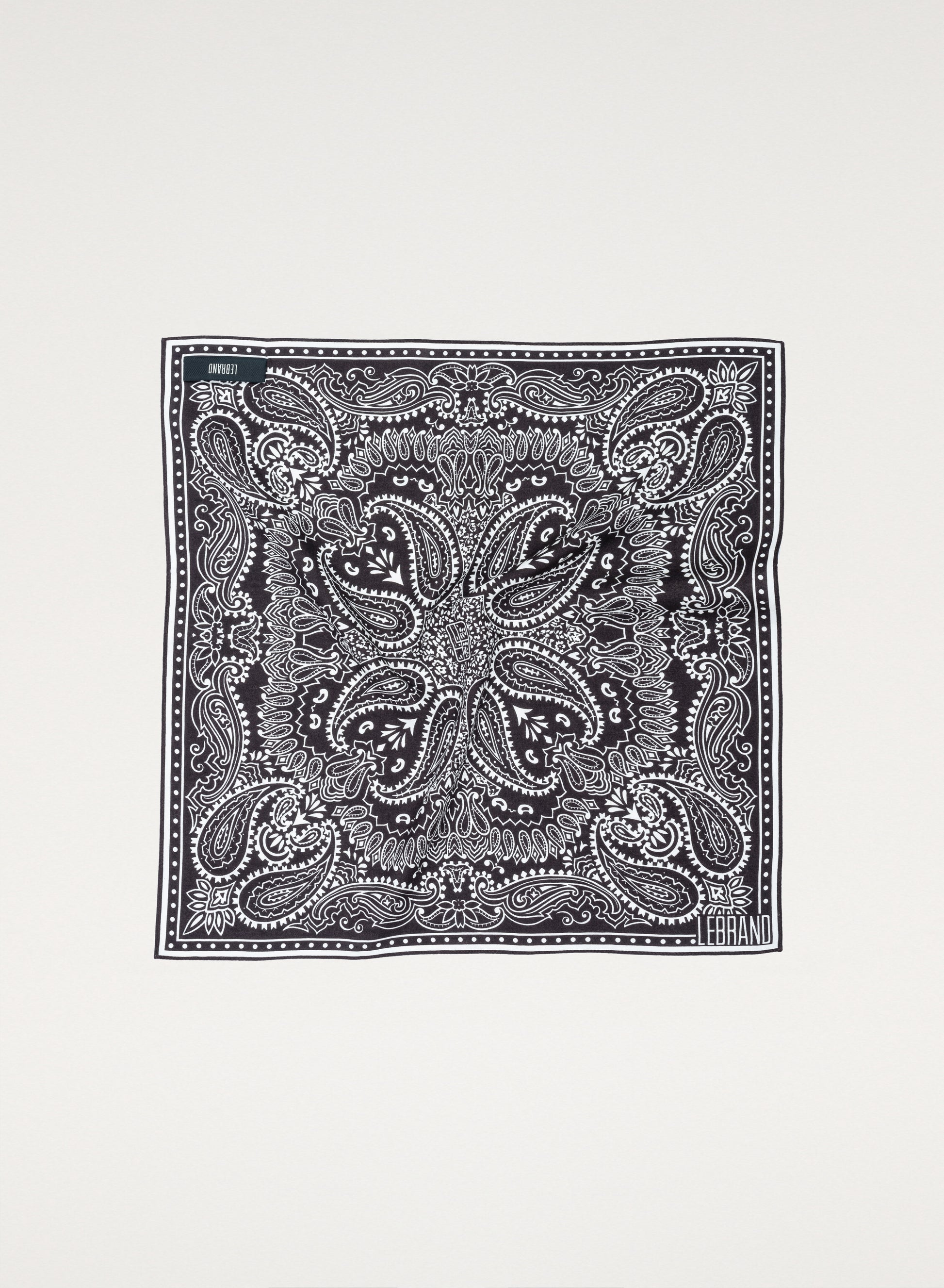 Uniwersalna bandana, ręcznie wykończona, wykonana z miękkiej wiskozy w kolorze głębokiego brązu z nadrukiem w kolorze ecru.