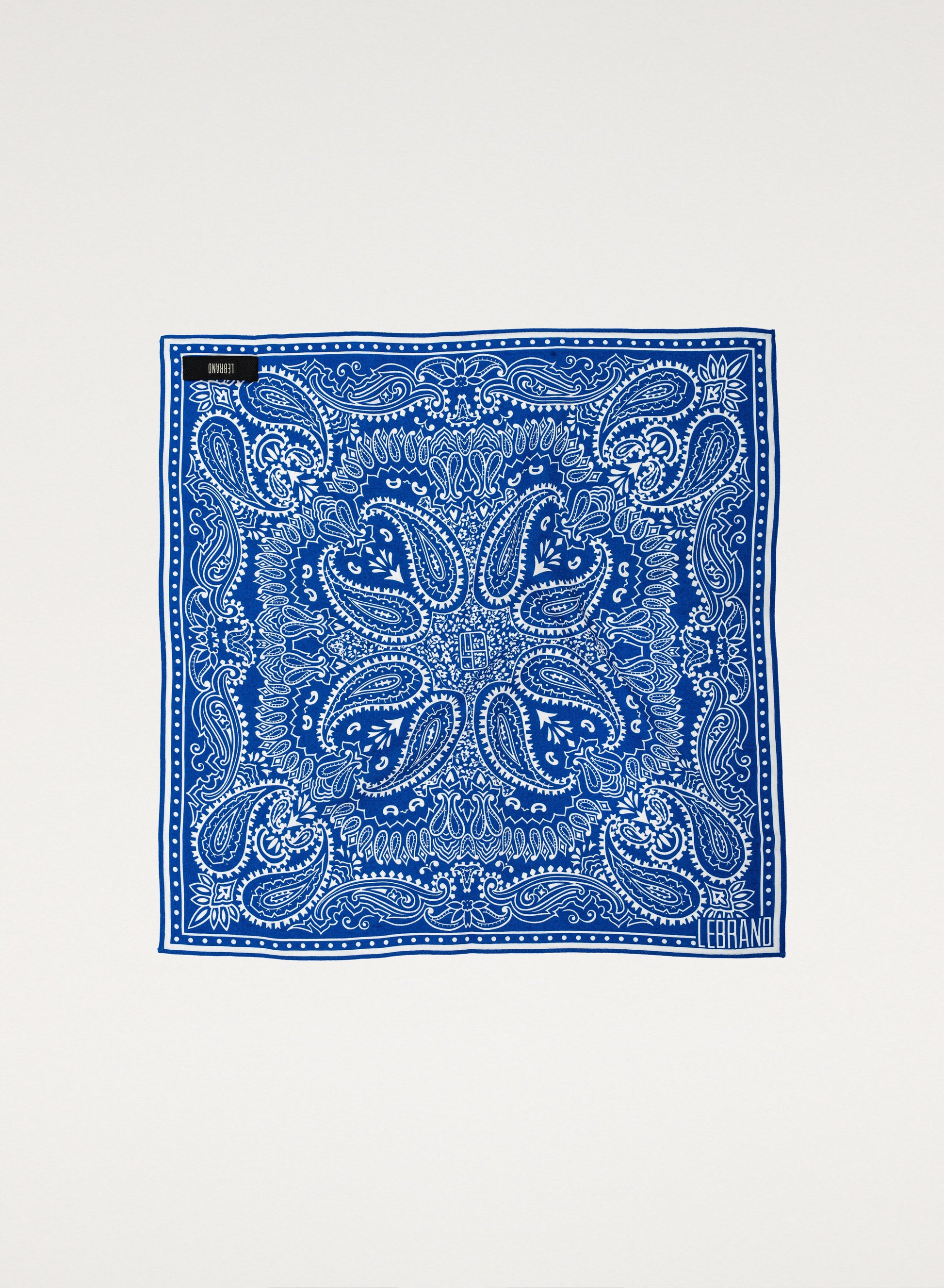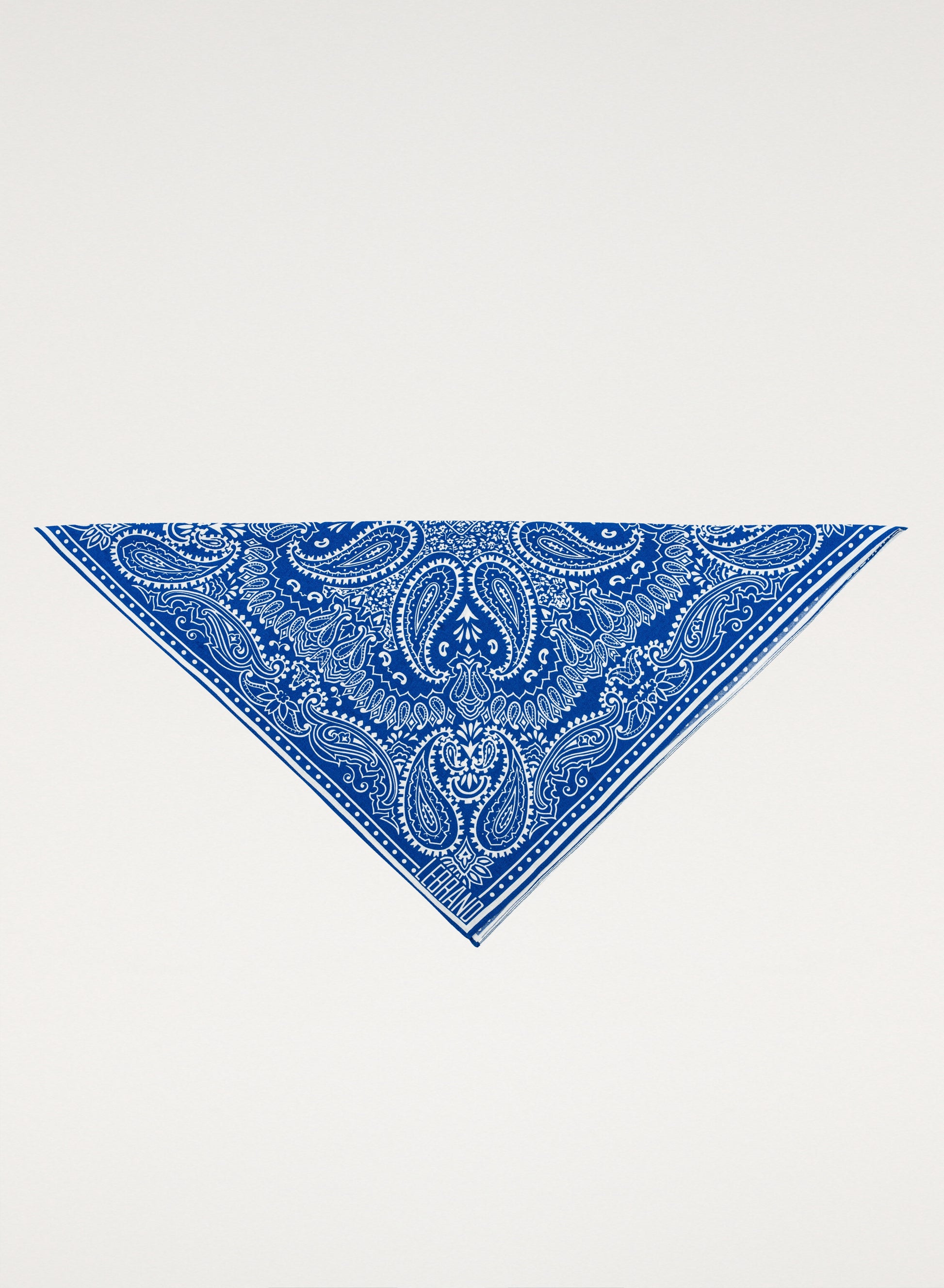 Uniwersalna bandana, ręcznie wykończona, wykonana z miękkiej wiskozy w kolorze chabrowym z nadrukiem w białym kolorze.