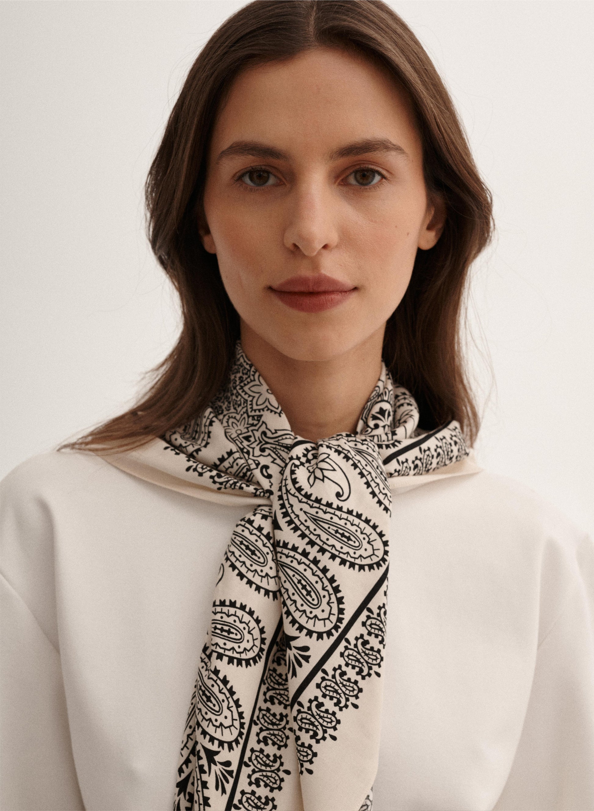 Uniwersalna bandana, ręcznie wykończona, wykonana z miękkiej wiskozy w kolorze ecru-czarnym.