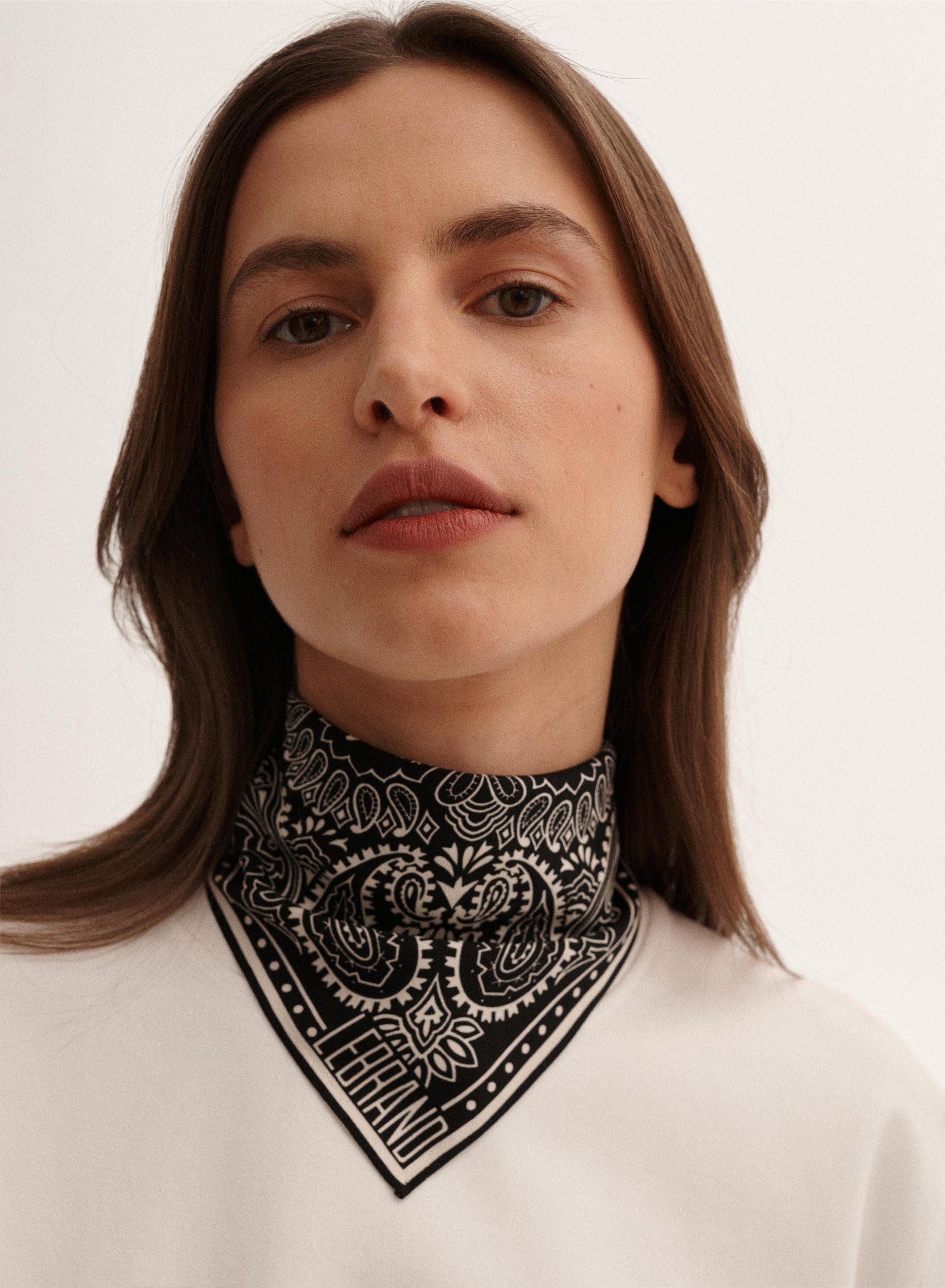 Uniwersalna bandana w rozmiarze mini, ręcznie wykończona, wykonana z miękkiej wiskozy w kolorze czarno-ecru.