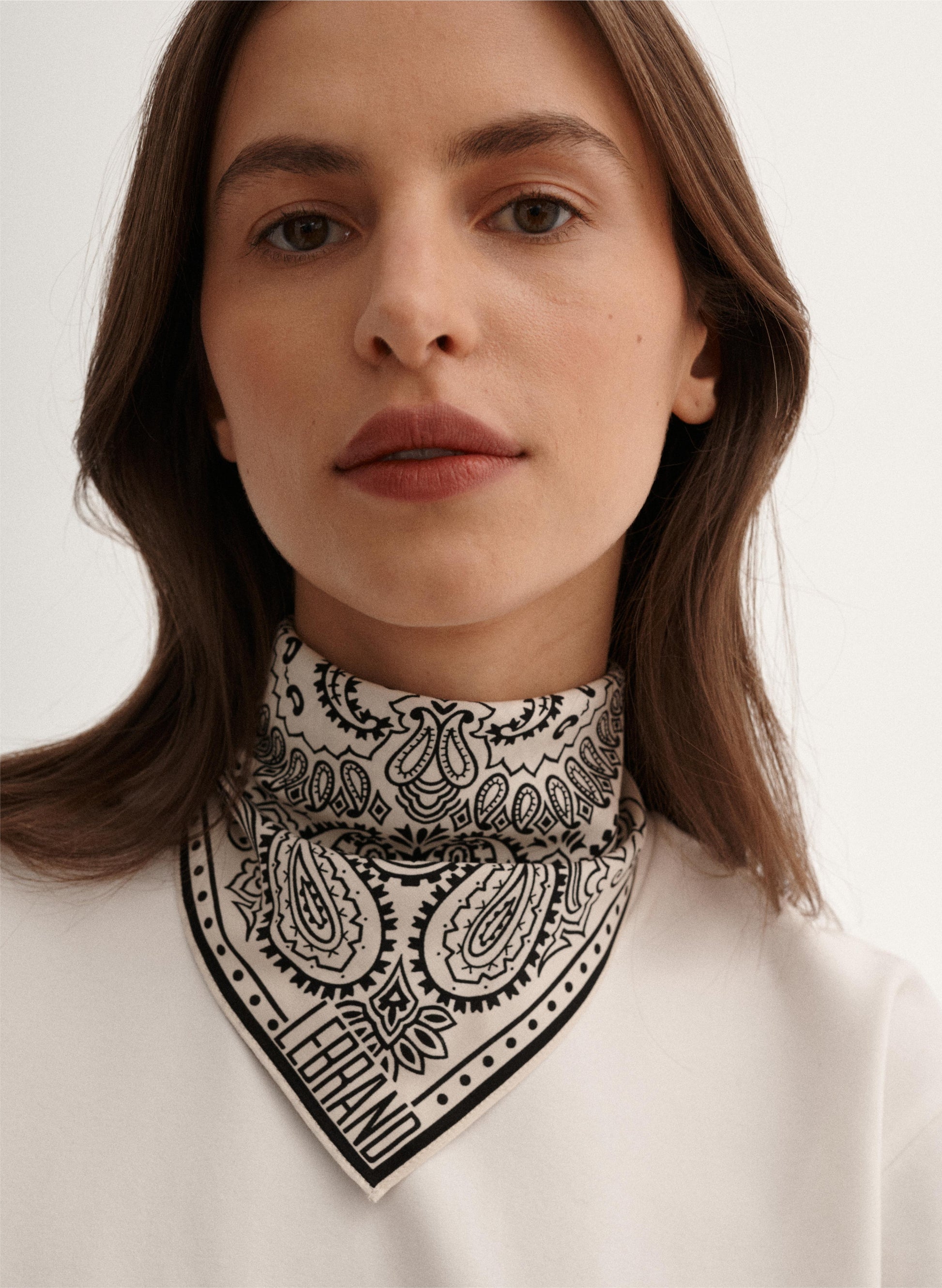 Uniwersalna bandana w rozmiarze mini, ręcznie wykończona, wykonana z miękkiej wiskozy w kolorze ecru-czarnym.