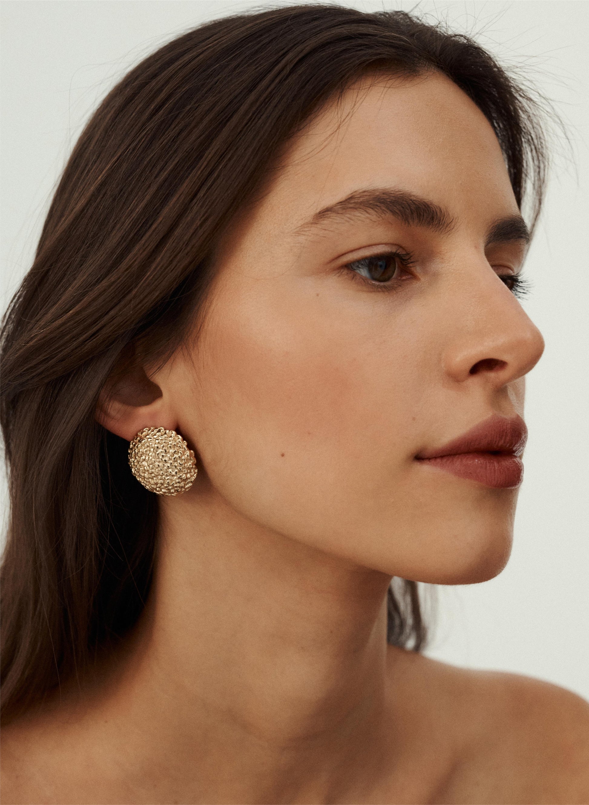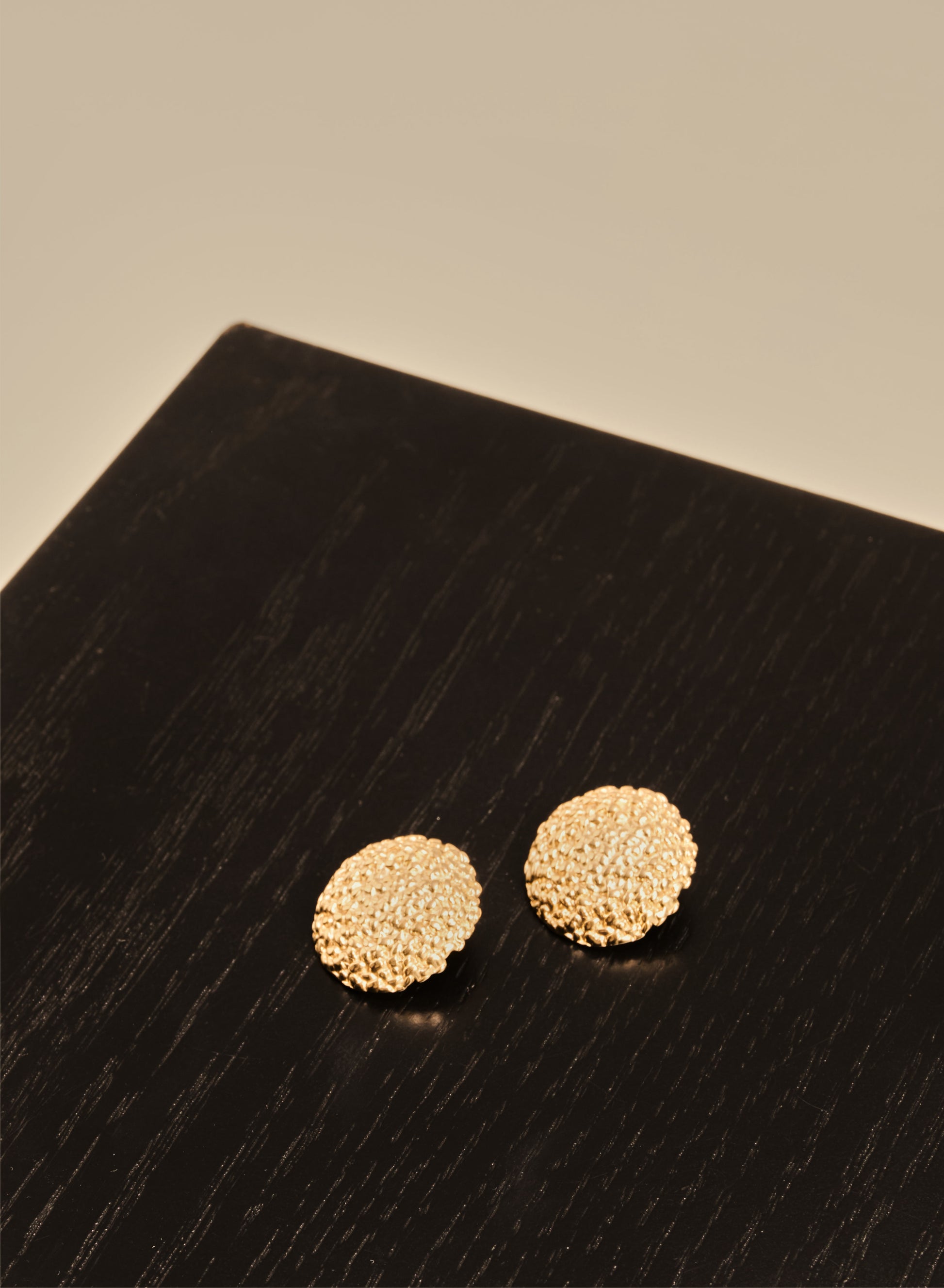 Okrągłe, płaskie kolczyki o żłobionej, nieregularnej fakturze, wykonane ze stali chirurgicznej w złotym kolorze. Ze względów higienicznych produkt nie podlega zwrotowi. Należy pamiętać, że przy intensywnym użytkowaniu biżuteria pozłacana może stracić swój pierwotny kolor. Unikaj wody i perfum, aby jak najdłużej zachowała swój najlepszy wygląd.