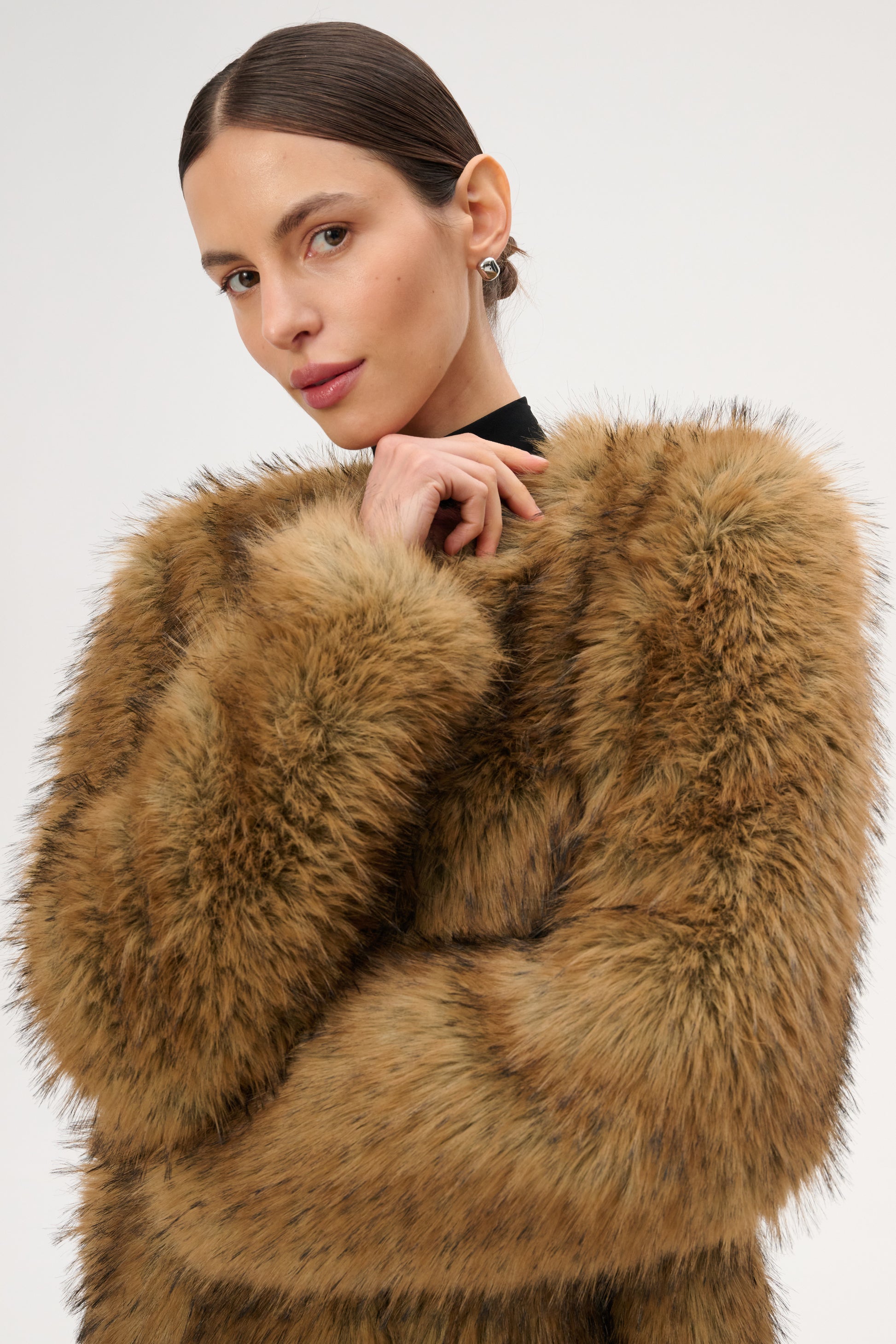 Płaszcz o luźnym, pudełkowym kroju i długości maxi. Wykonany z miękkiego, sztucznego futra w kolorze jasnego brązu. Posiada górne zapięcie na haftki oraz dwie kieszenie.