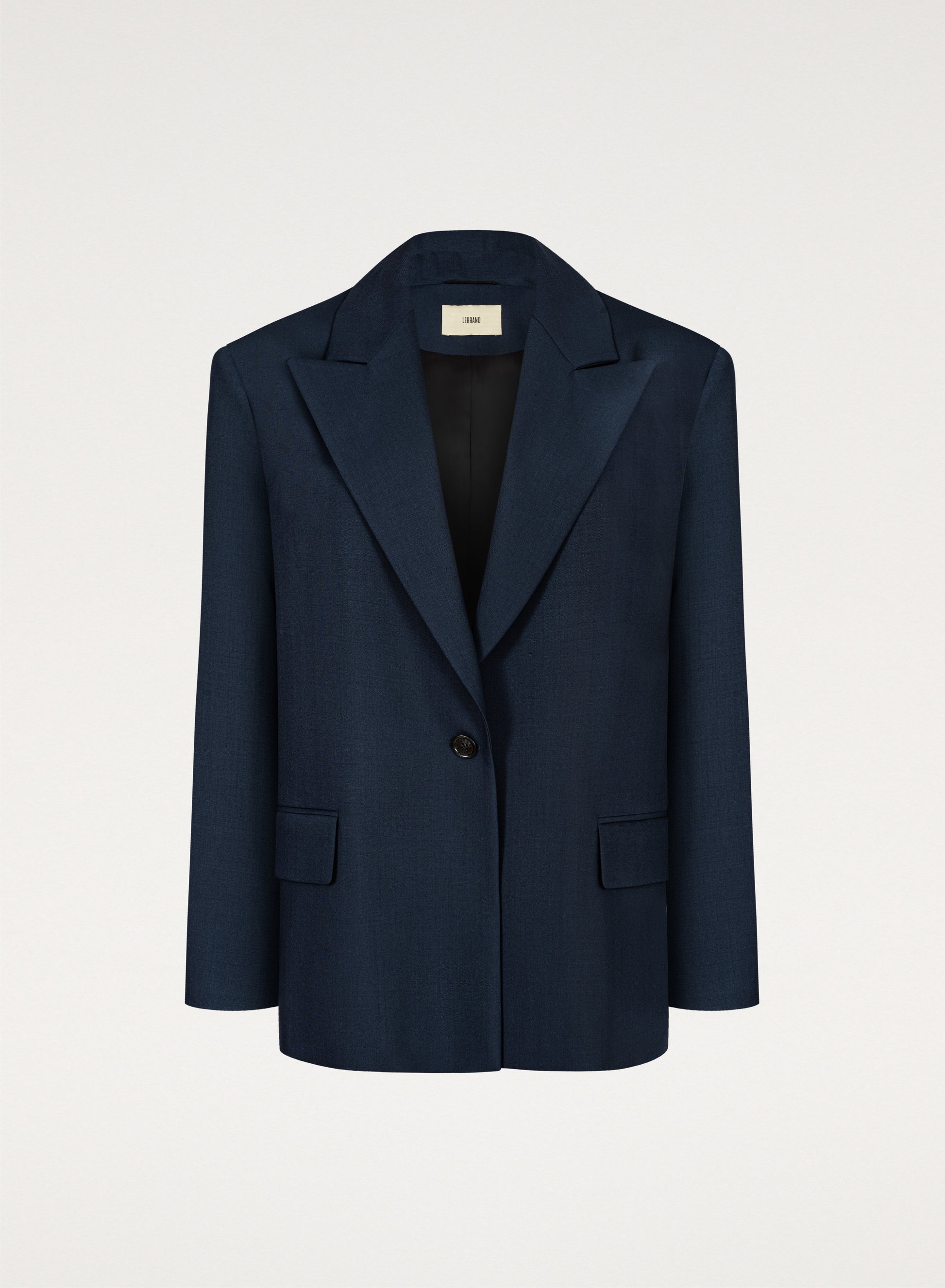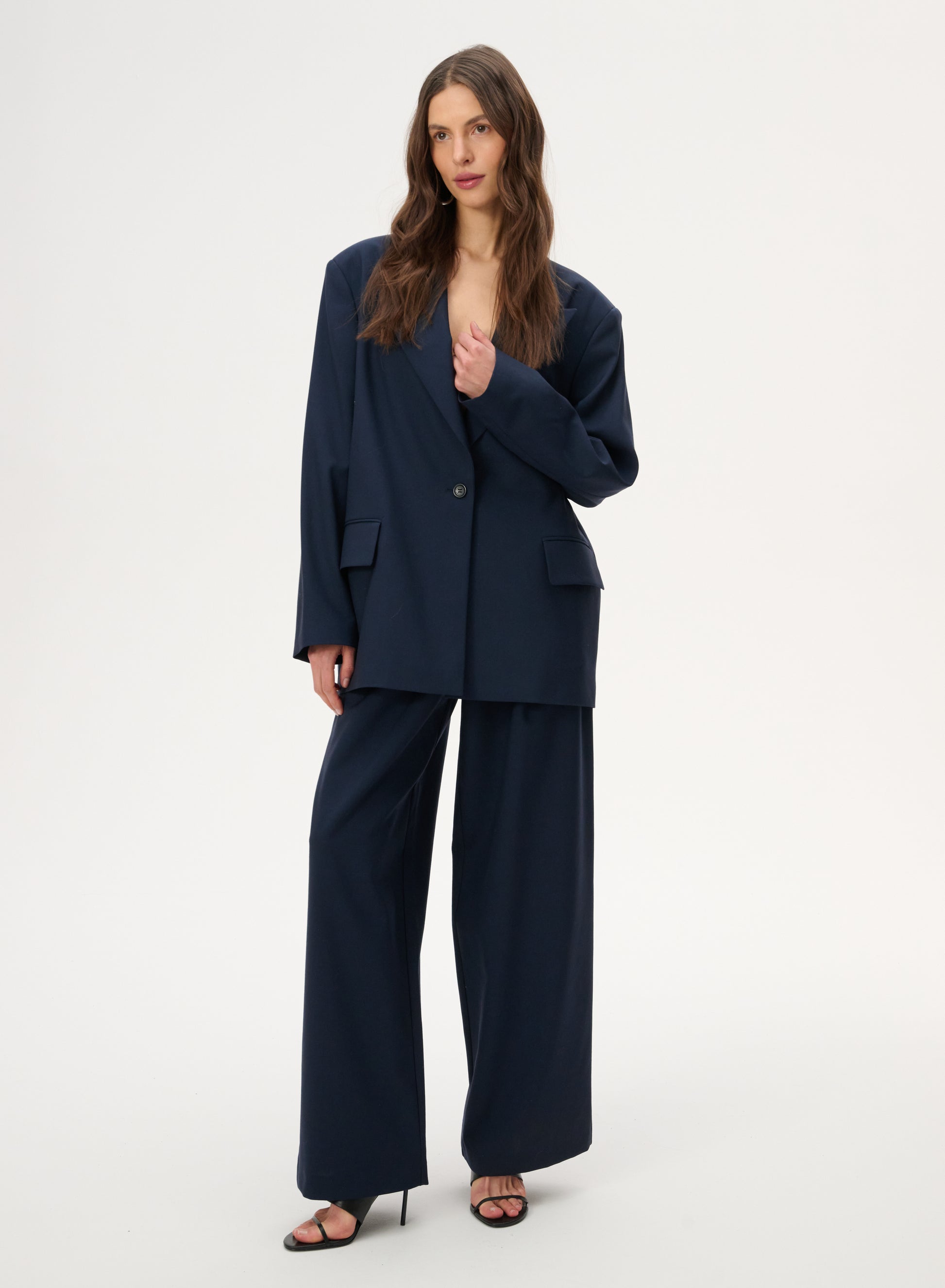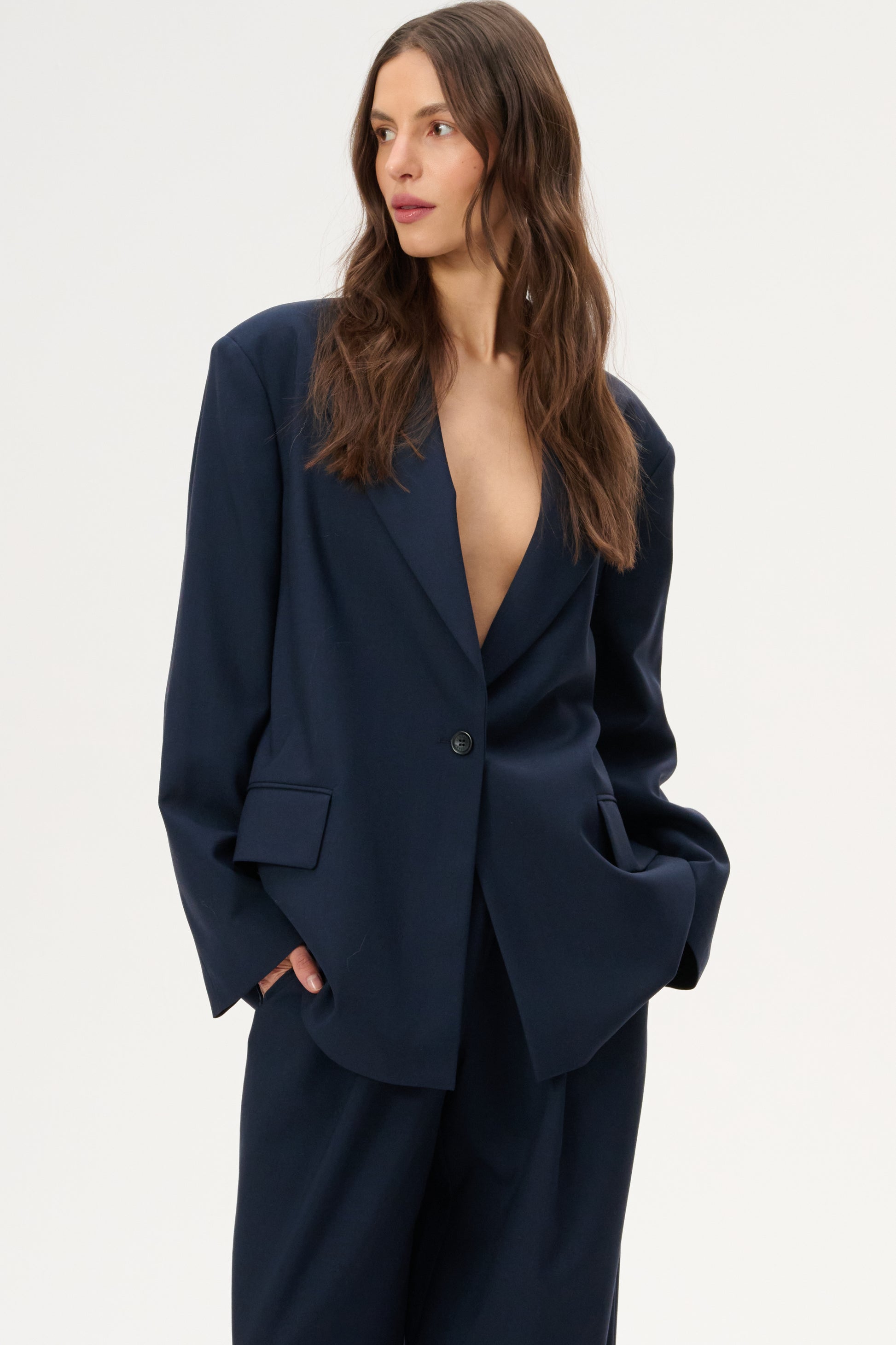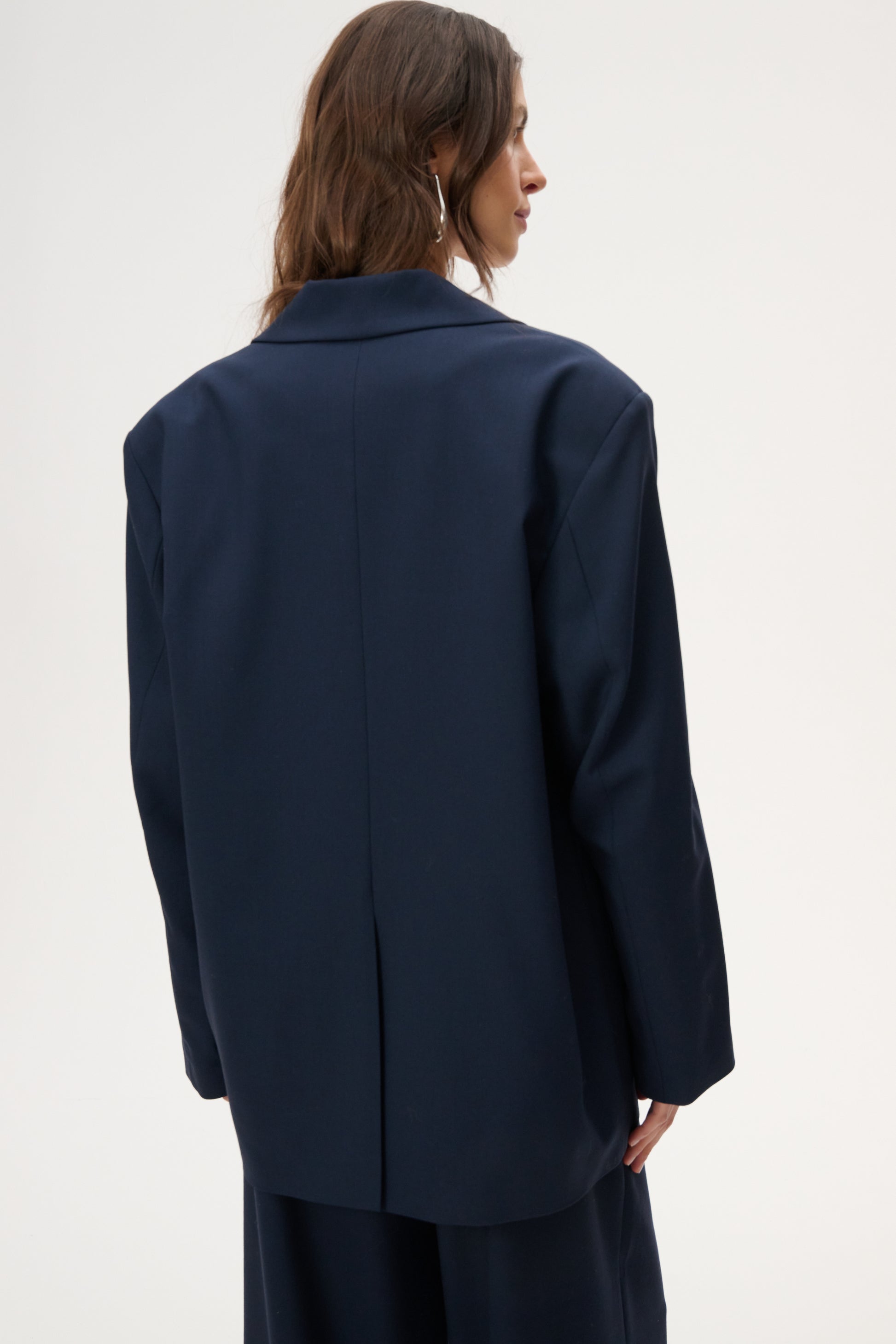 Lekka marynarka o kroju oversize. Posiada długie zamknięte klapy i zapięcie na pojedynczy guzik. Wykonana w całości z miękkiej wełny dziewiczej w kolorze granatowym.