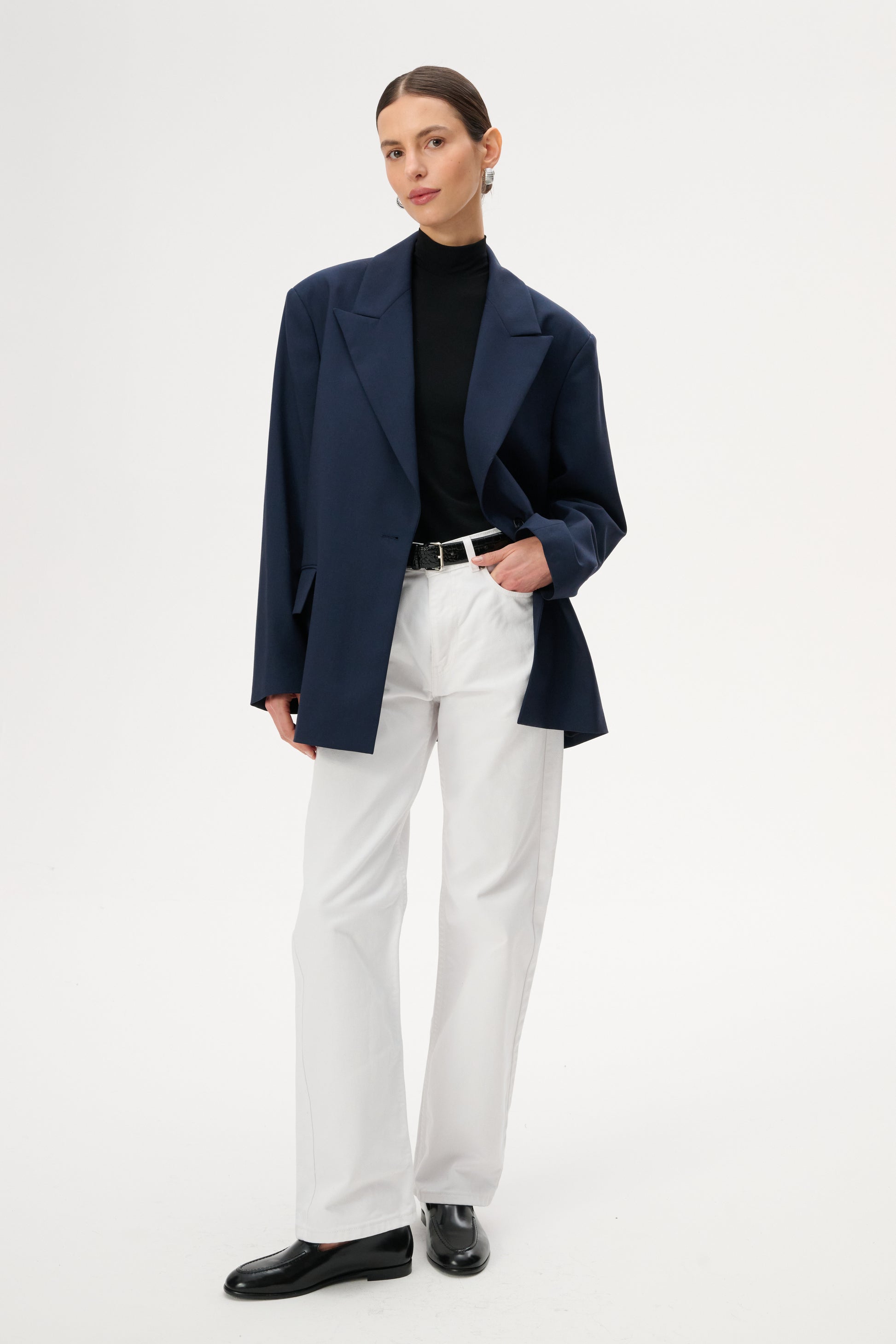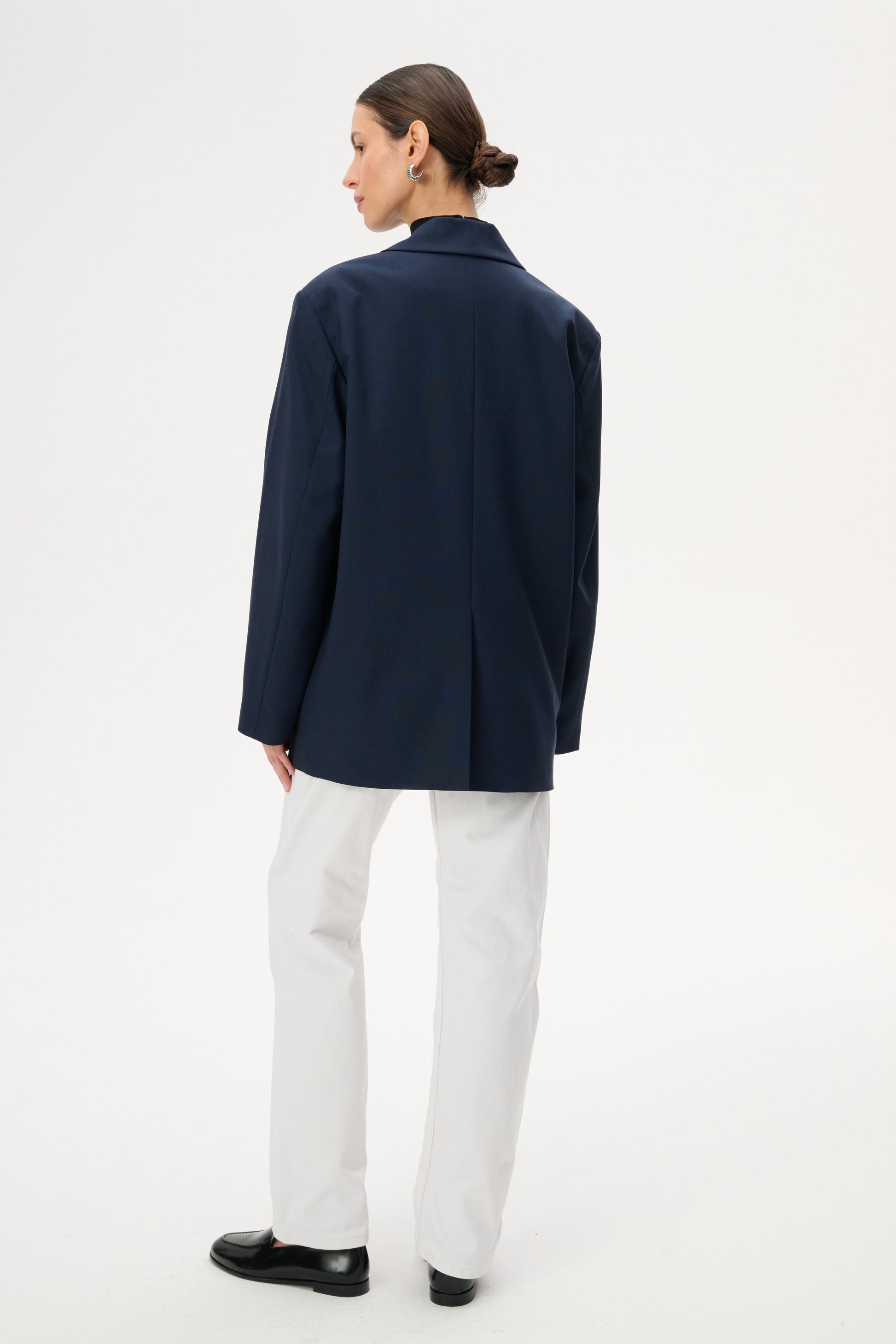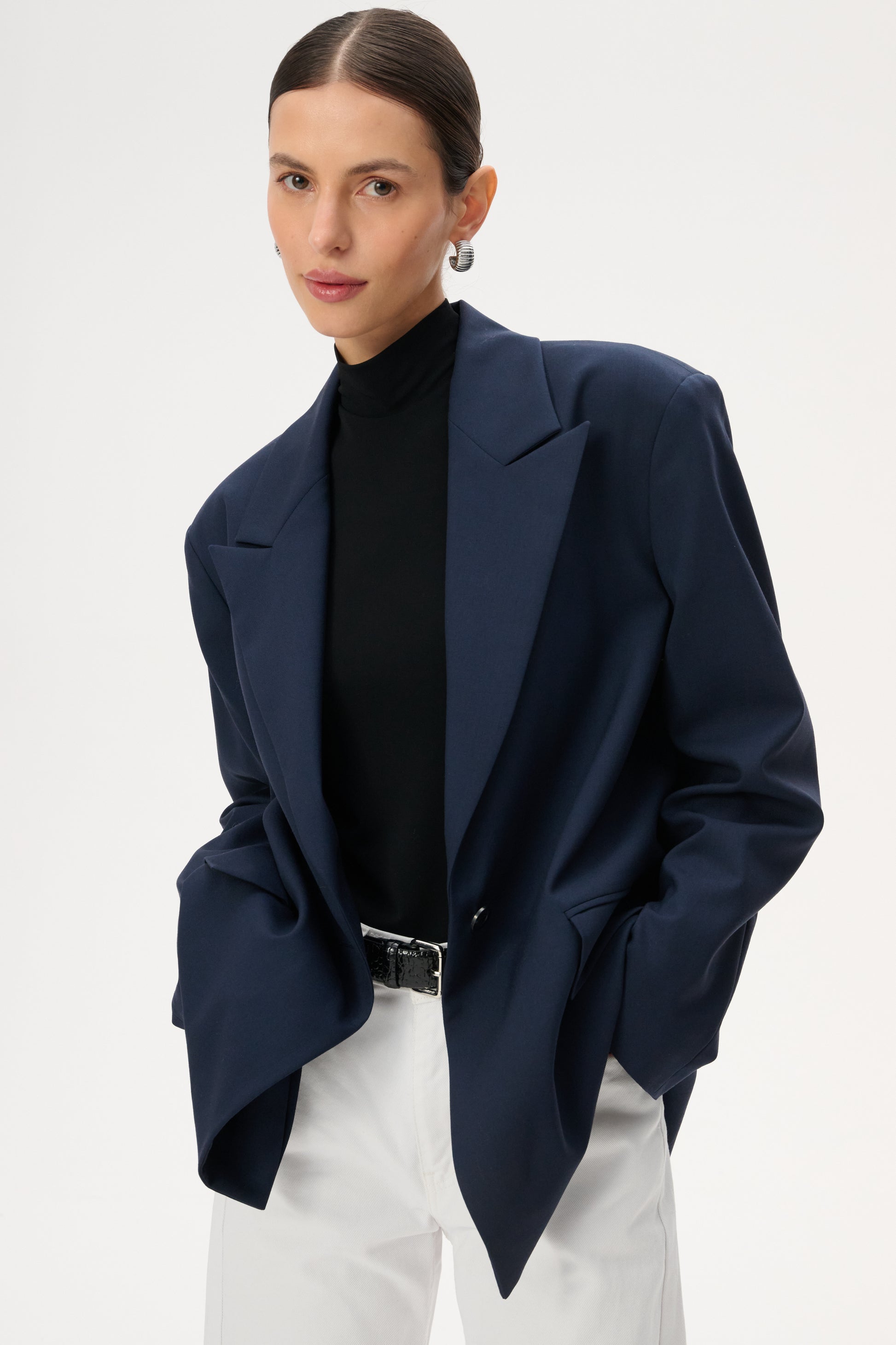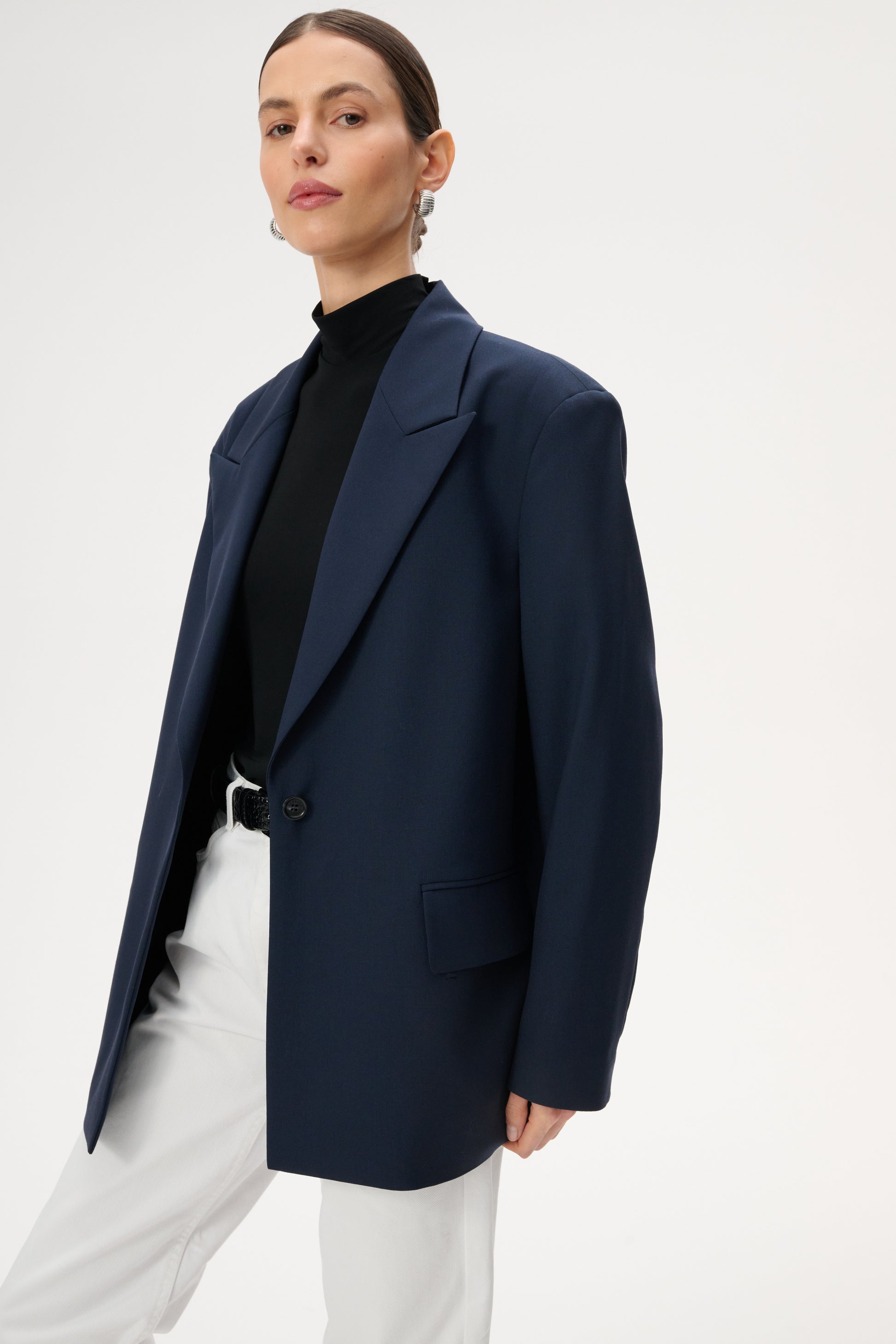Lekka marynarka o kroju oversize. Posiada długie zamknięte klapy i zapięcie na pojedynczy guzik. Wykonana w całości z miękkiej wełny dziewiczej w kolorze granatowym.