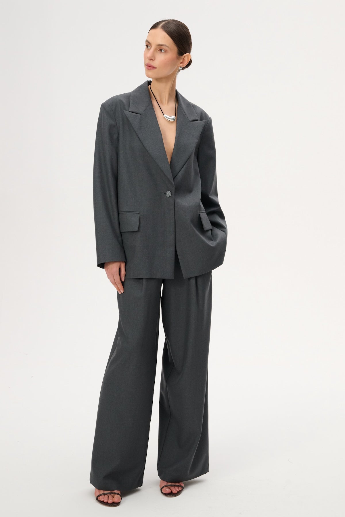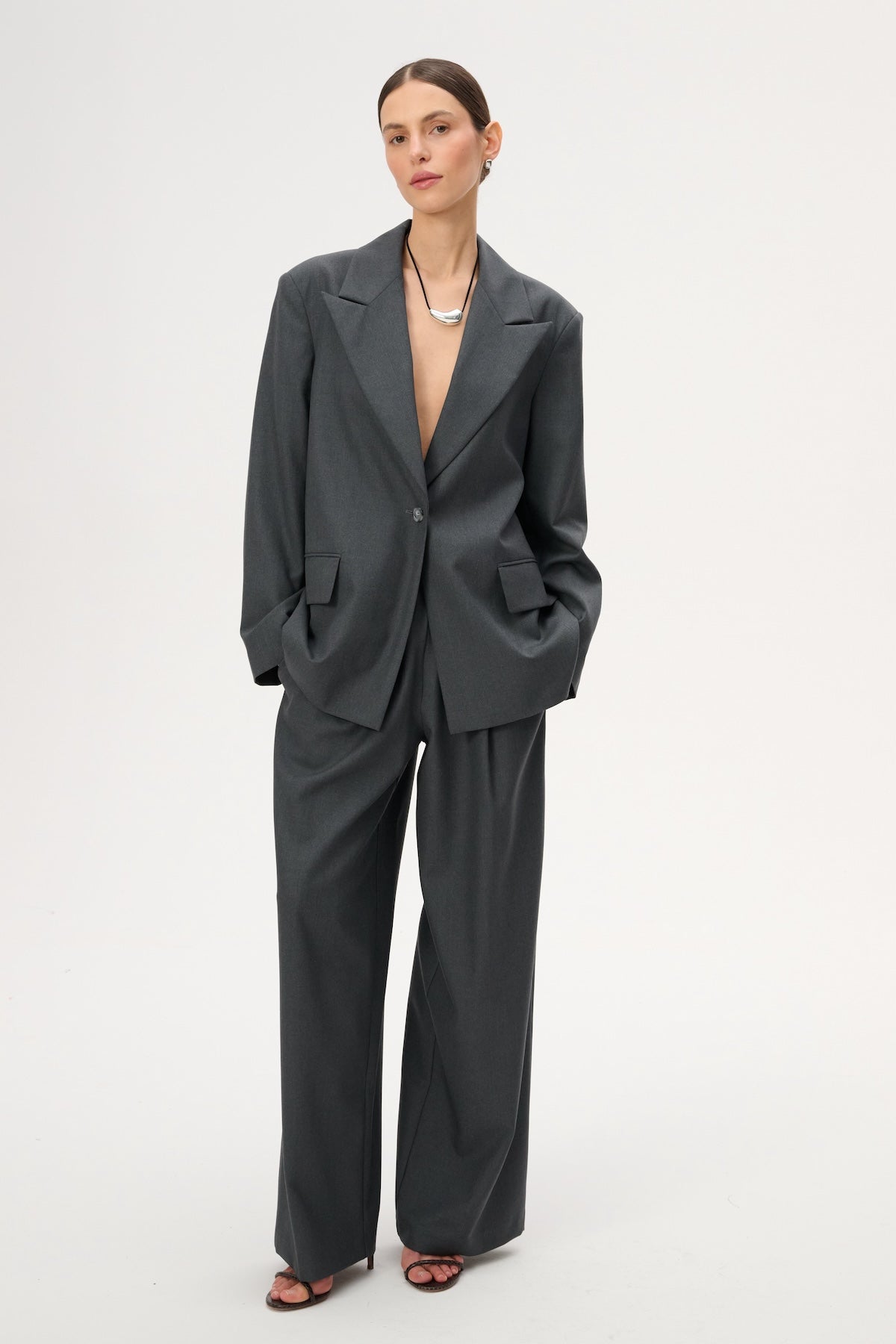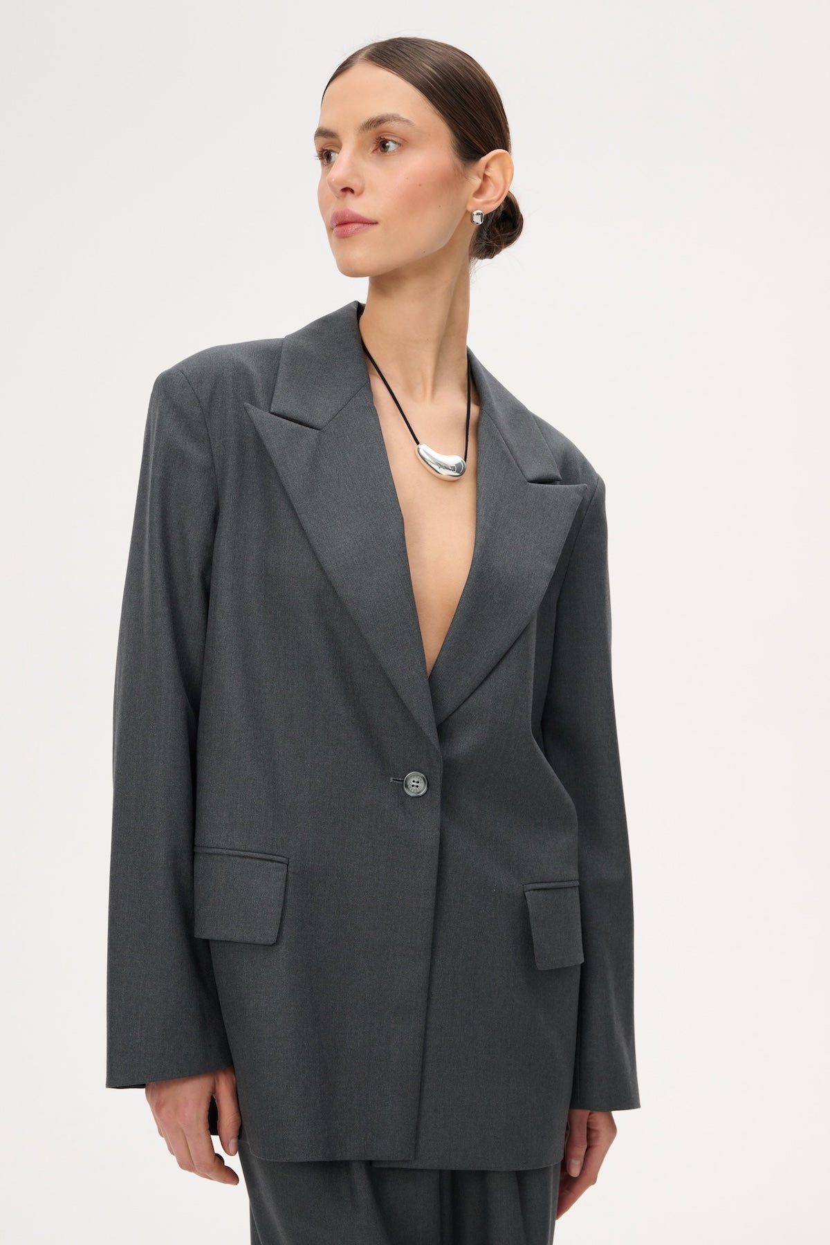 Lekka marynarka o kroju oversize. Posiada długie zamknięte klapy i zapięcie na pojedynczy guzik. Wykonana w całości z miękkiej wełny dziewiczej w kolorze szarym.