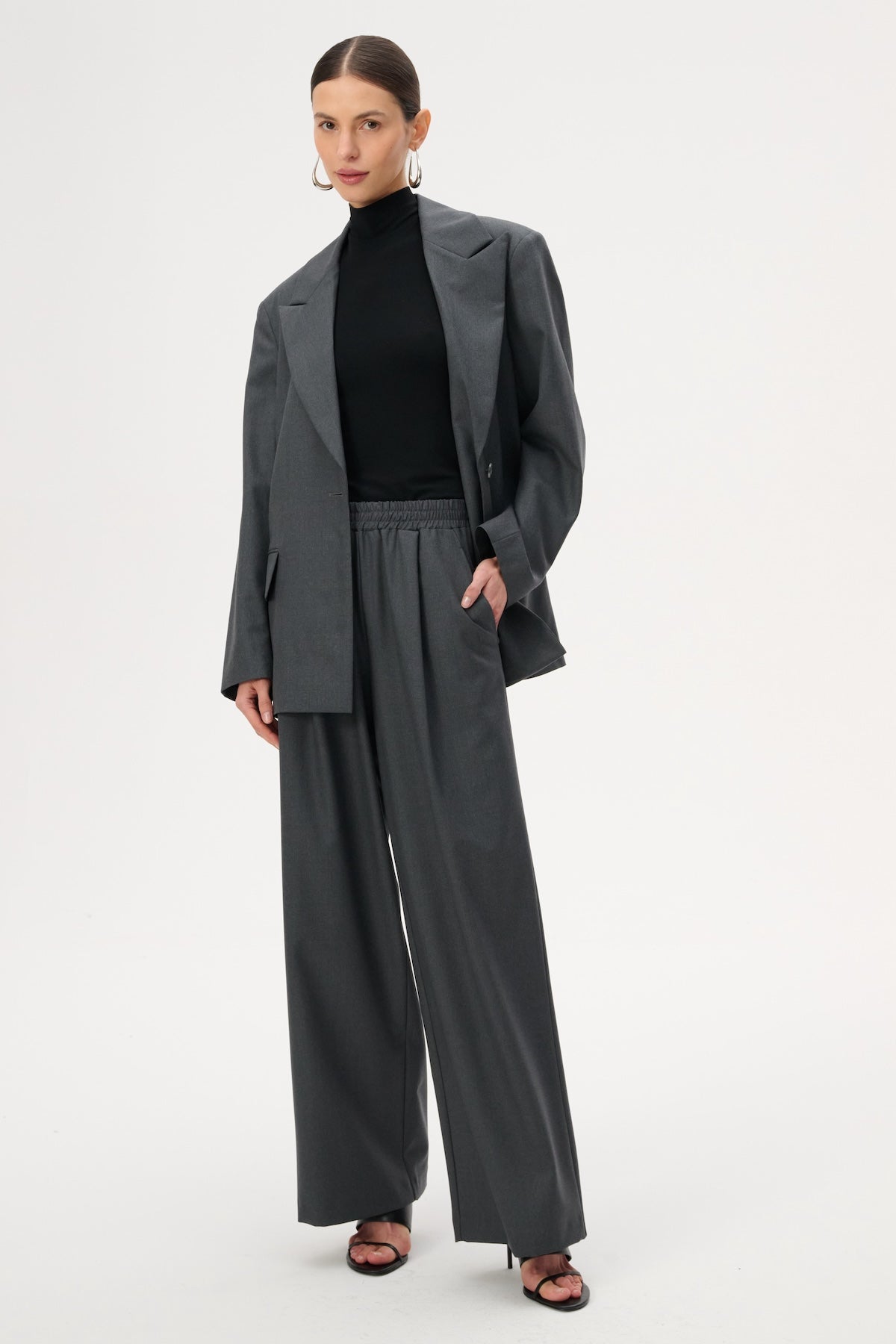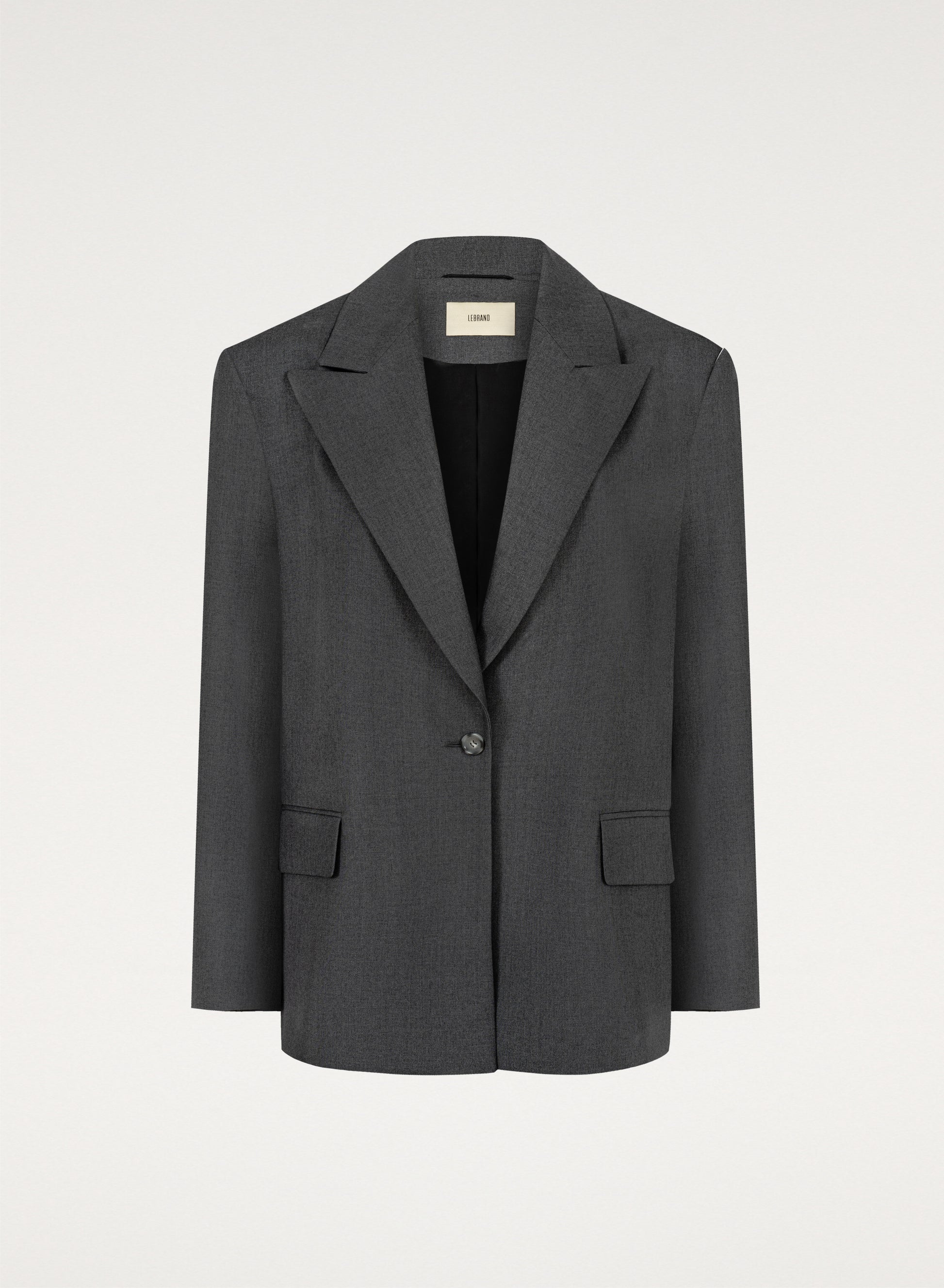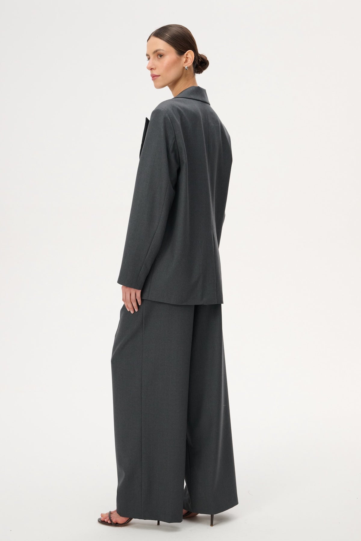 Lekka marynarka o kroju oversize. Posiada długie zamknięte klapy i zapięcie na pojedynczy guzik. Wykonana w całości z miękkiej wełny dziewiczej w kolorze szarym.