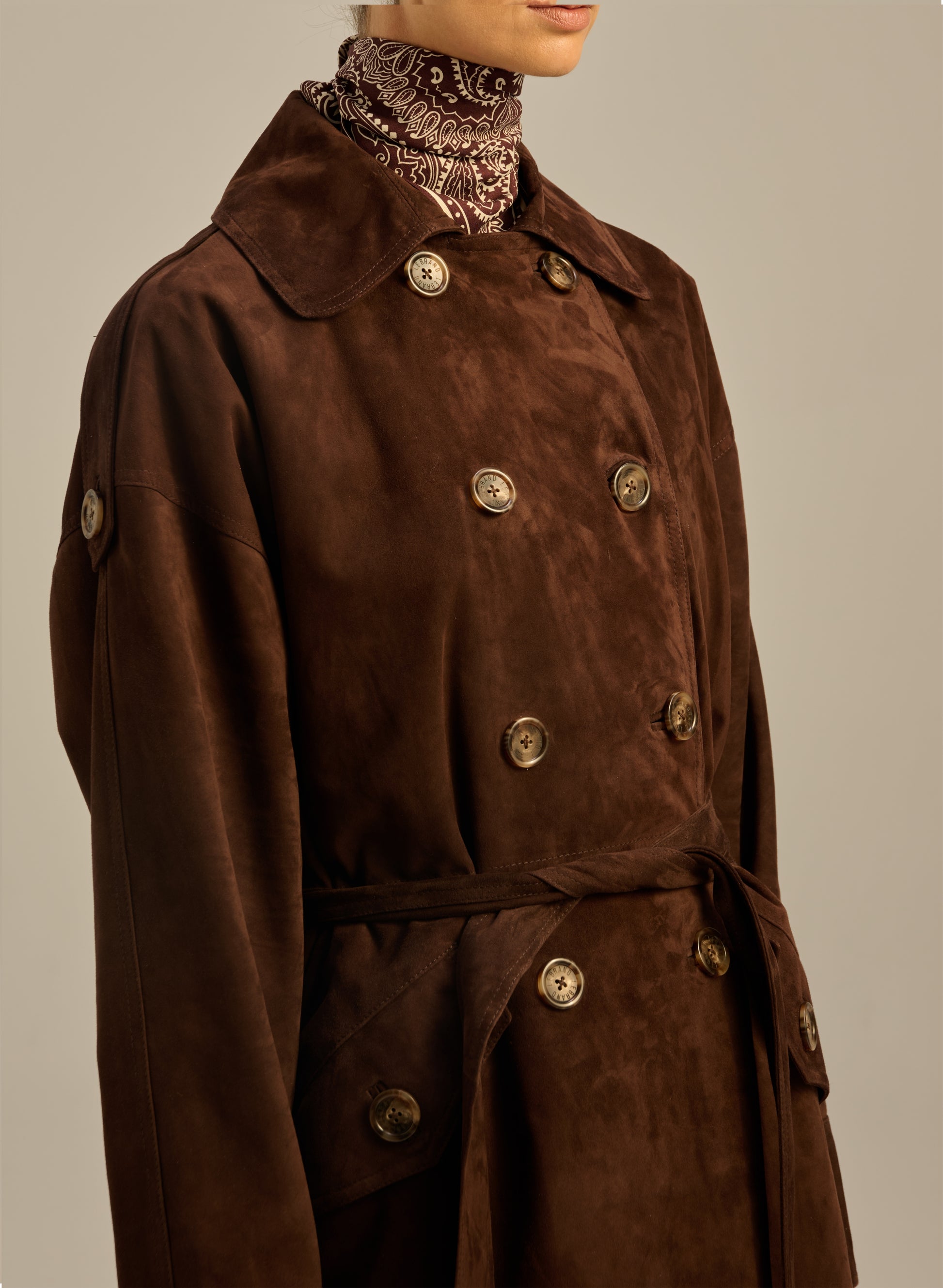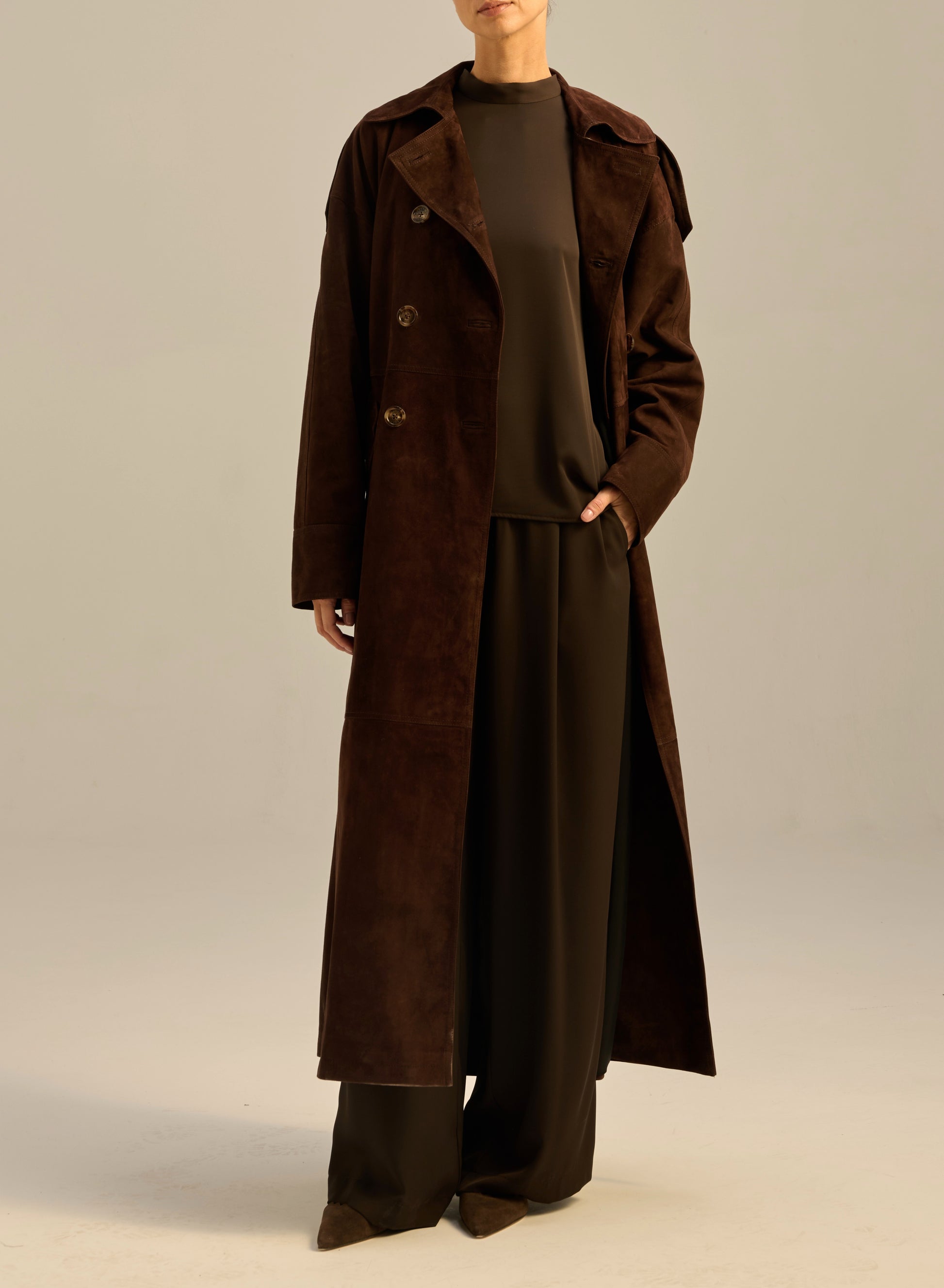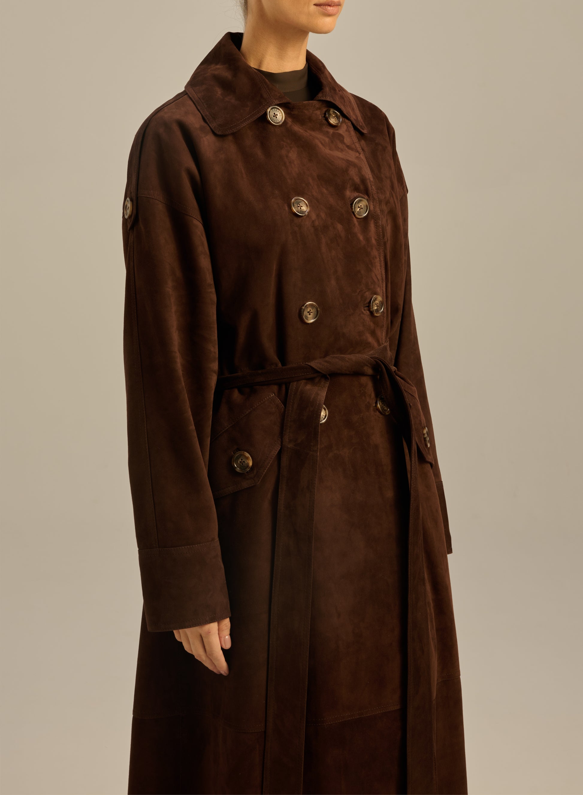Klasyczny, długi trencz o kroju oversize wykonany z miękkiego zamszu w kolorze brązowym. Posiada dwurzędowe zapięcie na guziki, szerokie rękawy zbierane w nadgarstkach, pagony na ramionach oraz długi pasek wiązany w talii. Tył płaszcza dekorowany plisą.