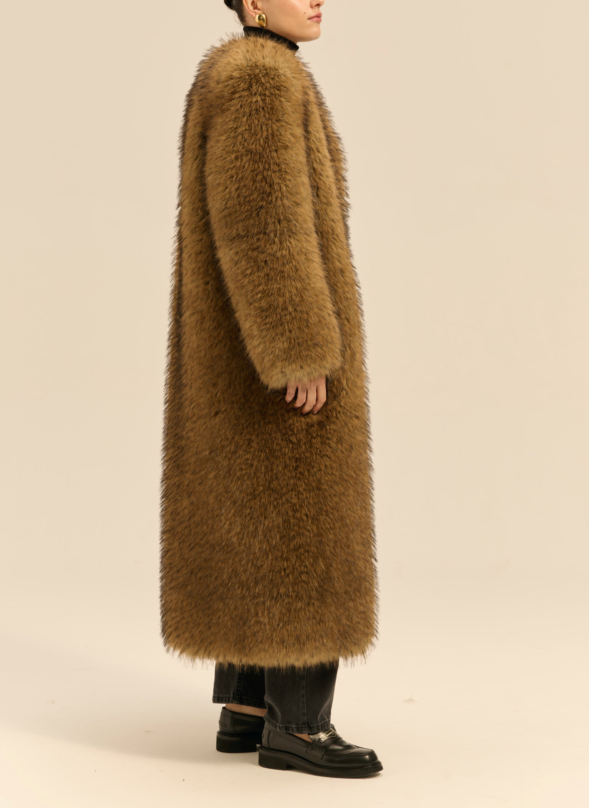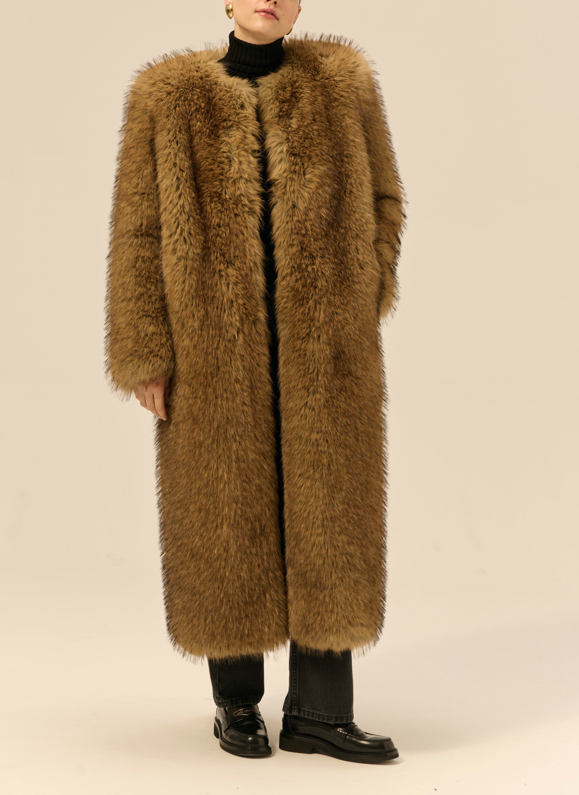 Płaszcz o luźnym, pudełkowym kroju i długości maxi. Wykonany z miękkiego, sztucznego futra w kolorze jasnego brązu. Posiada górne zapięcie na haftki oraz dwie kieszenie.