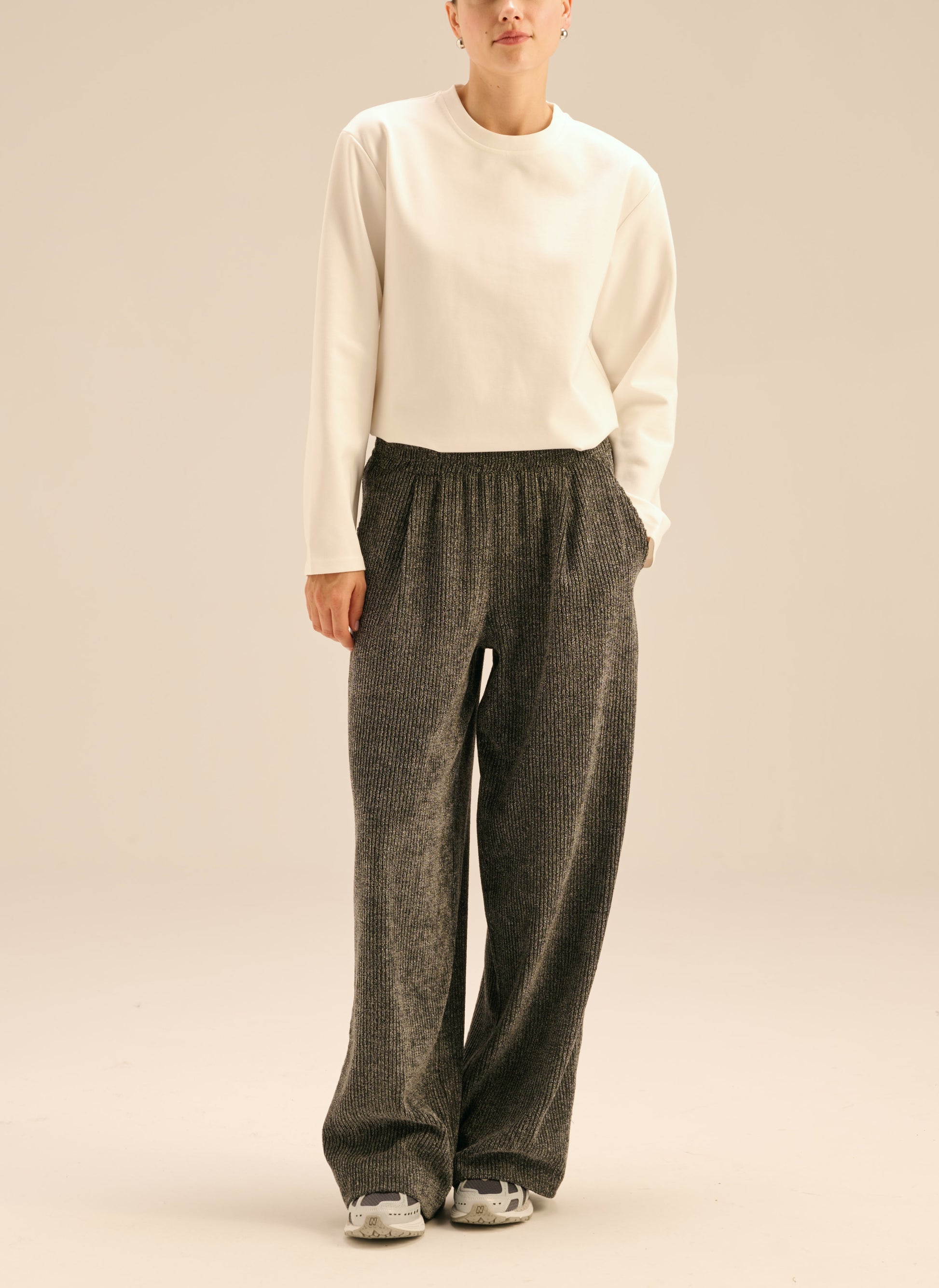 Spodnie o długich, szerokich nogawkach, wykonane z miękkiego, welurowego materiału w kolorze szarym, zdobionego metaliczną nitką. Posiadają regularny stan, delikatne zaszewki i elastyczną talię.