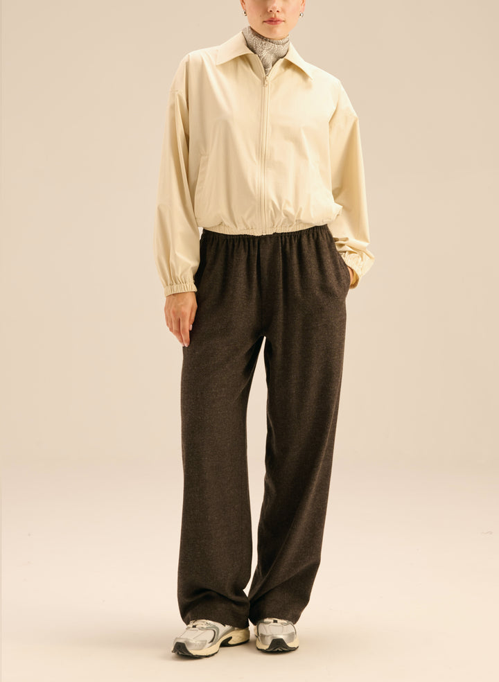 Oversize'owa koszula wykonana z miękkiego, delikatnego materiału w kolorze brązowego melanżu. Posiada klasyczny kołnierzyk i długie rękawy wykończone mankietami.