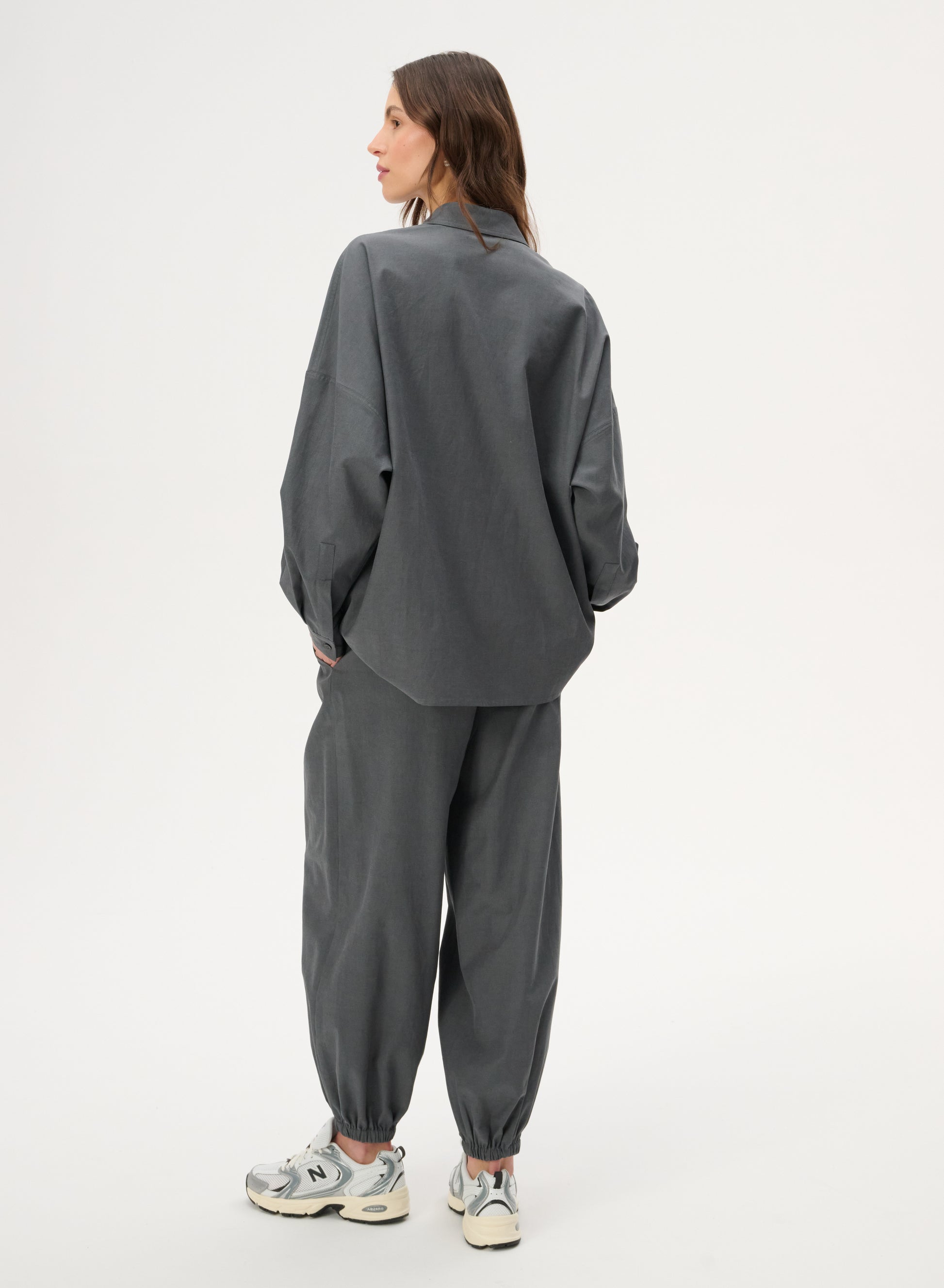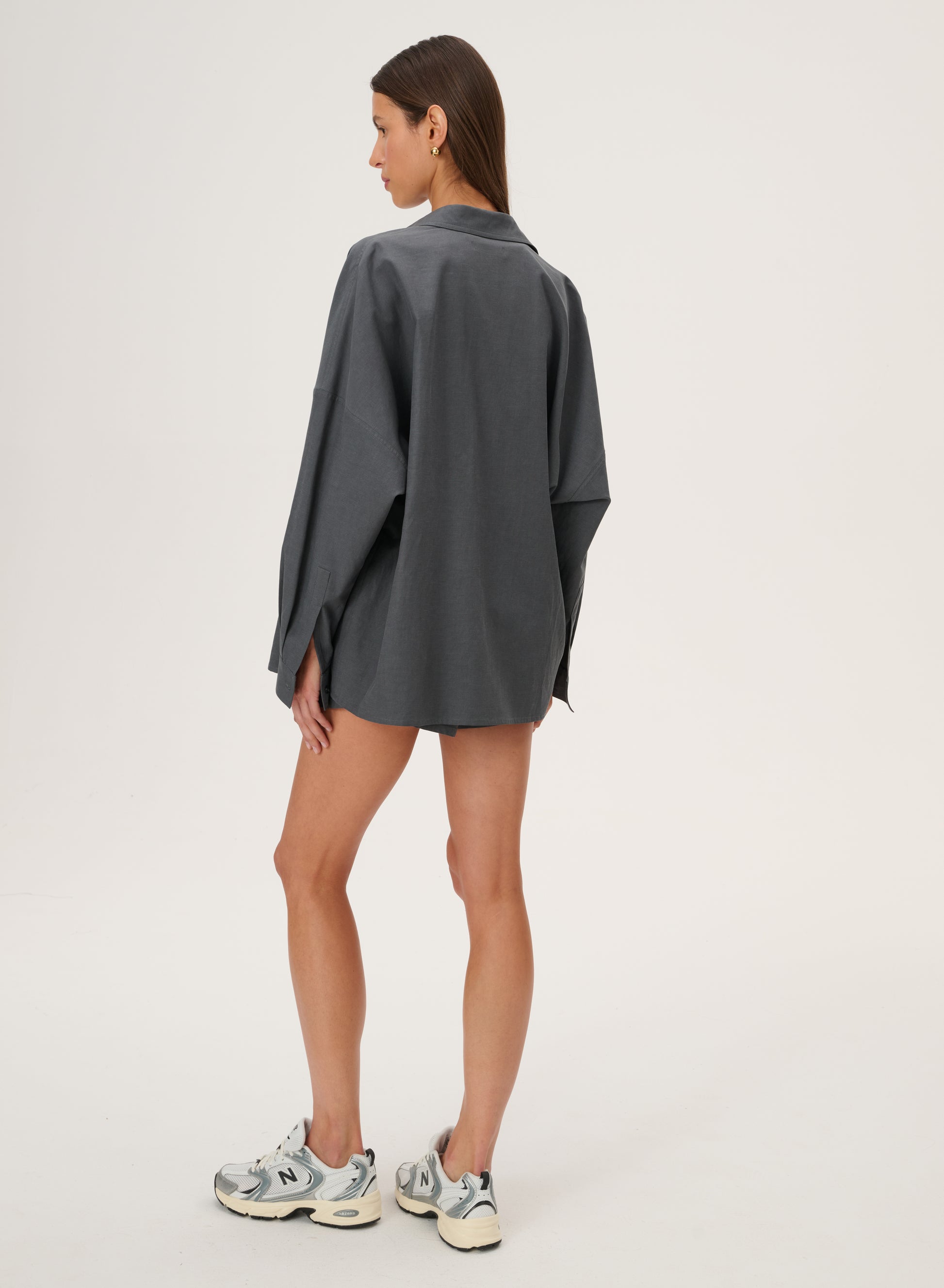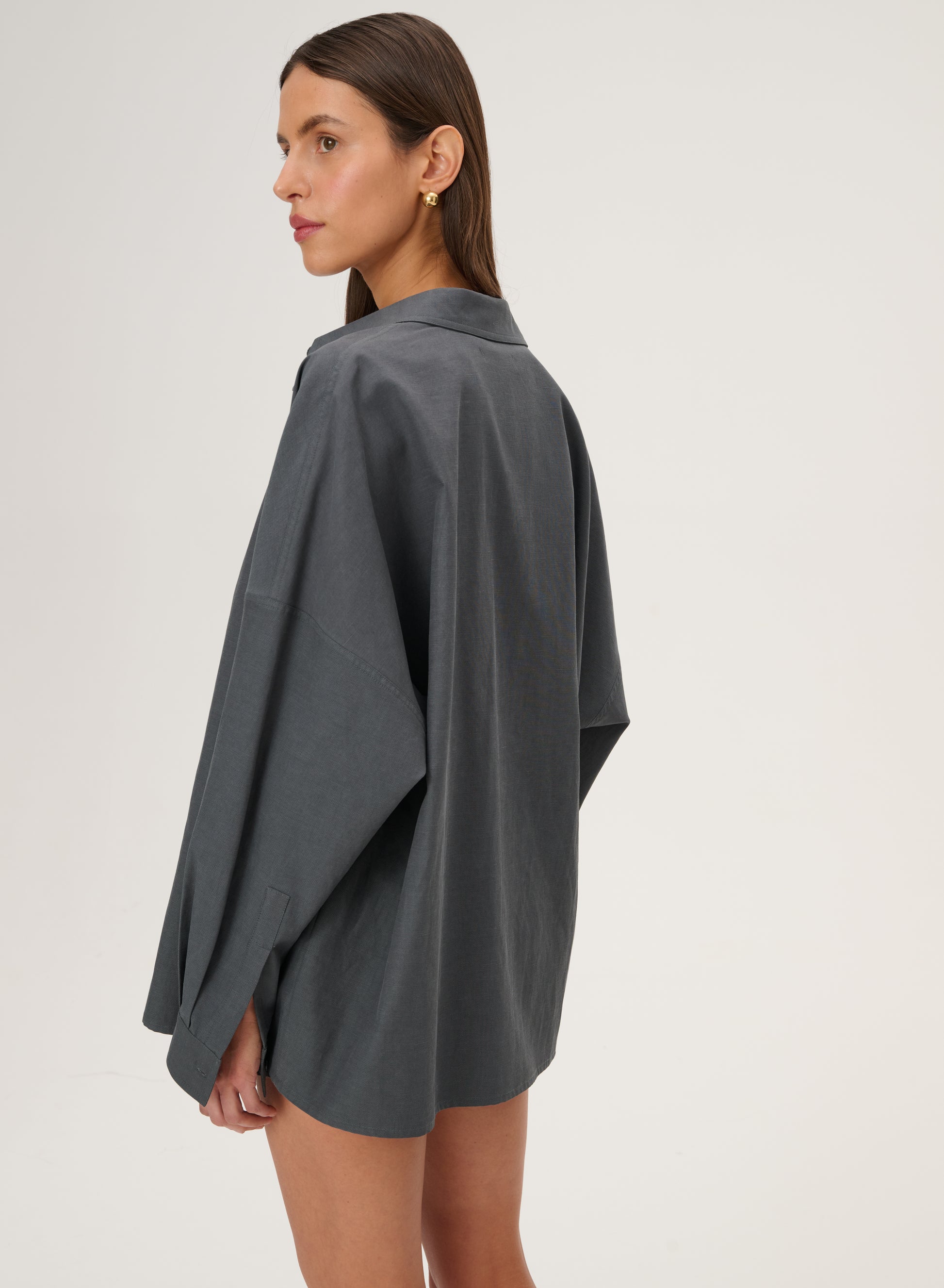 Oversize'owa koszula wykonana z twillu w kolorze grafitowym. Posiada klasyczny kołnierzyk i długie rękawy wykończone mankietami.