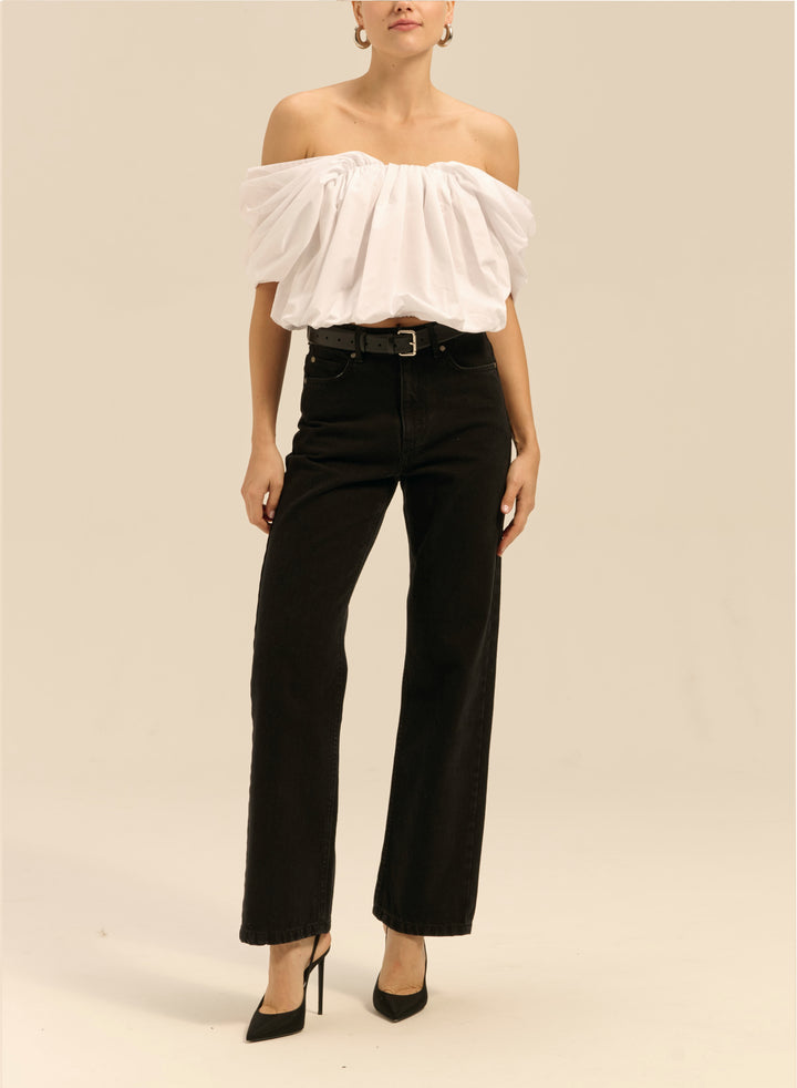 Szeroka koszula wykonana z lekkiej bawełny. Posiada duży kołnierz i długie rękawy z elastycznym ściągaczem i długimi troczkami.
