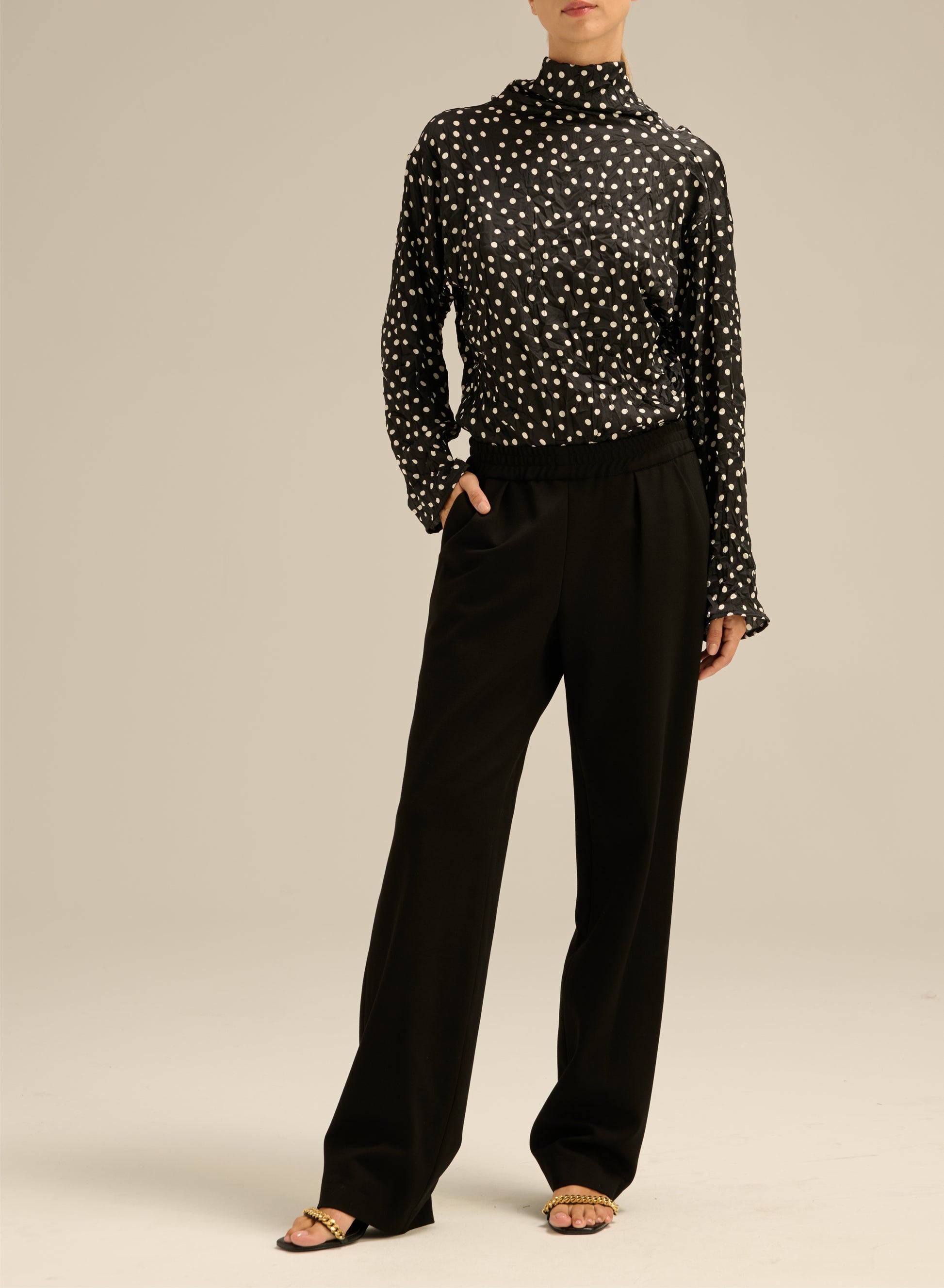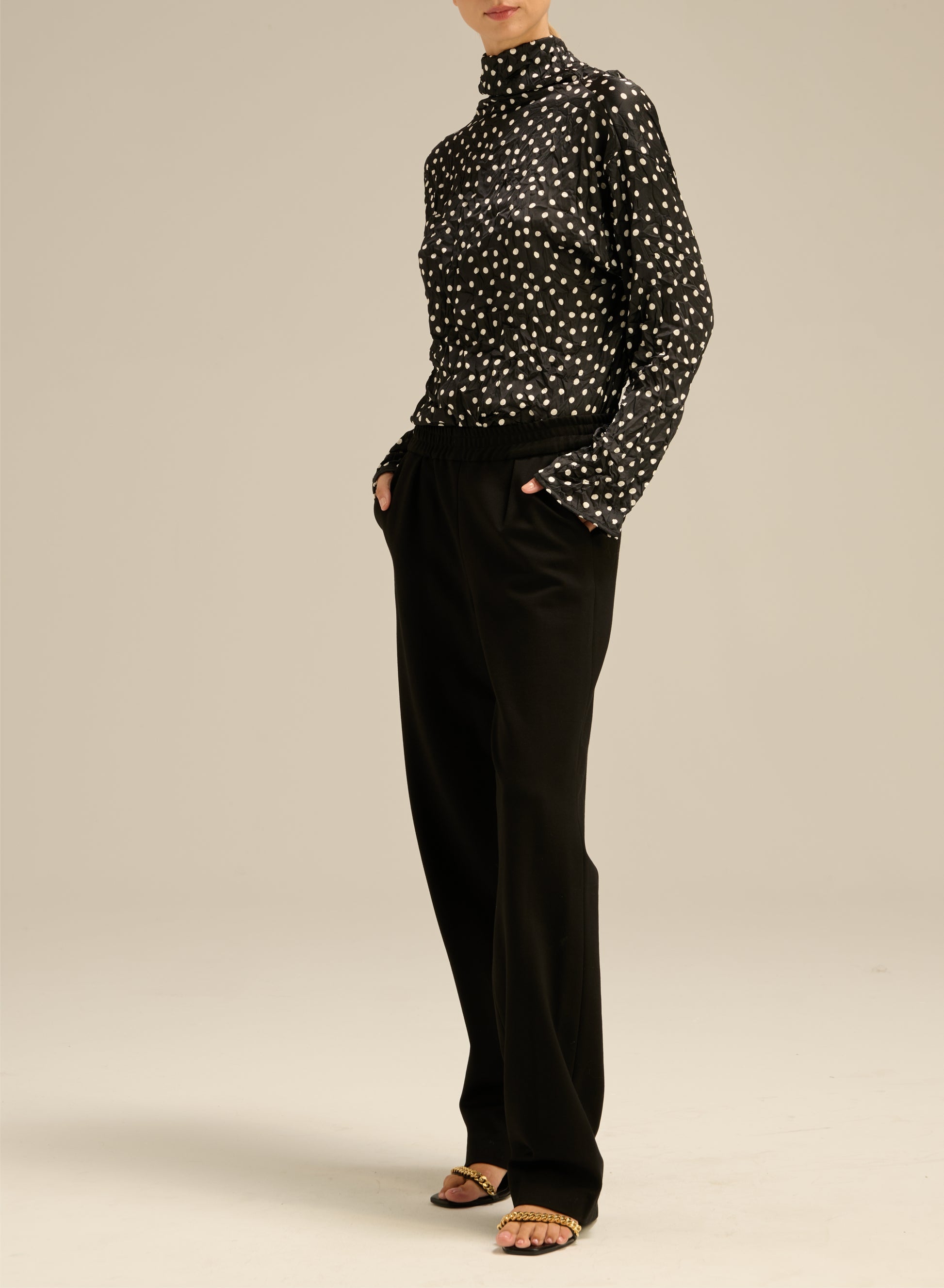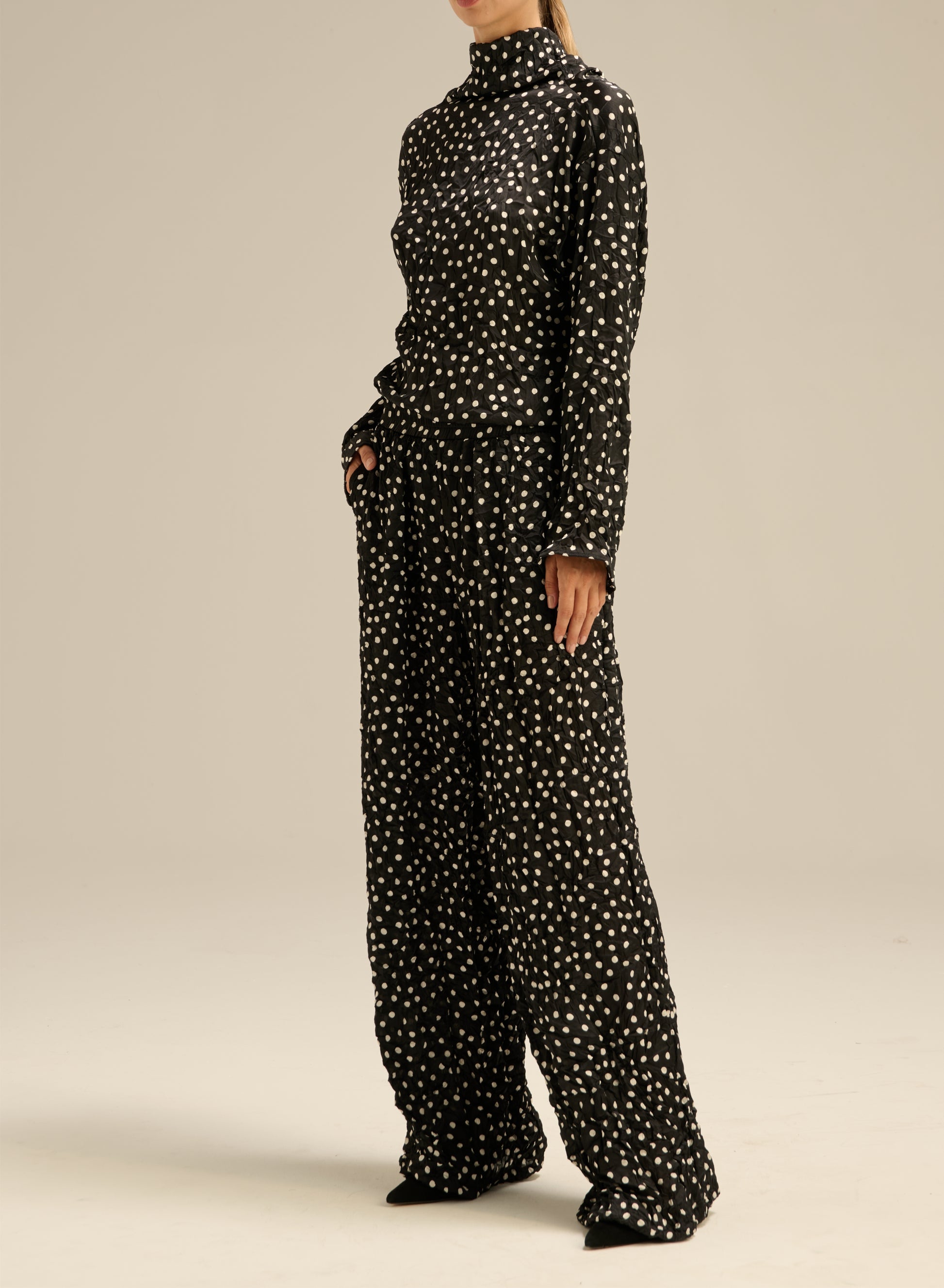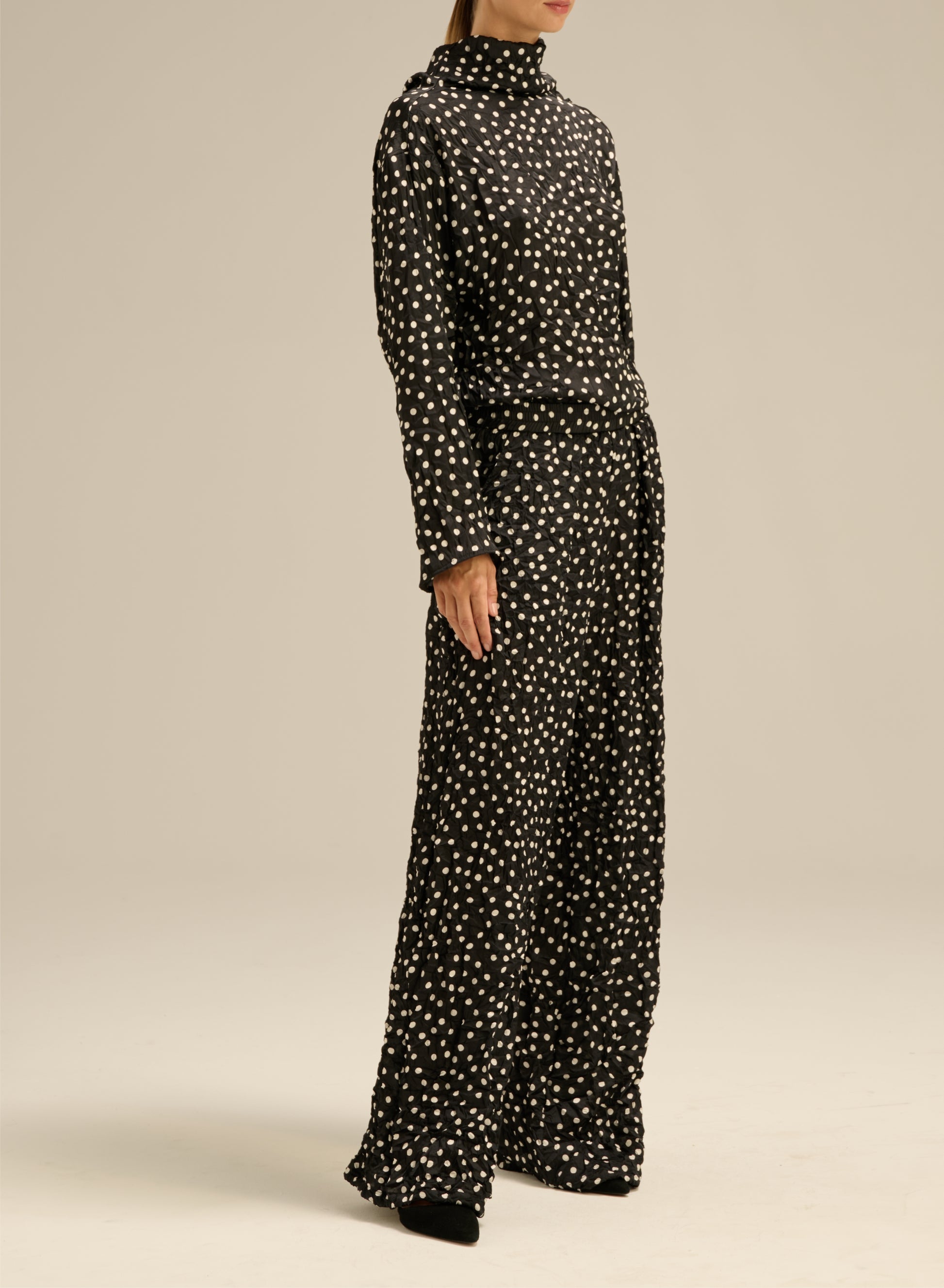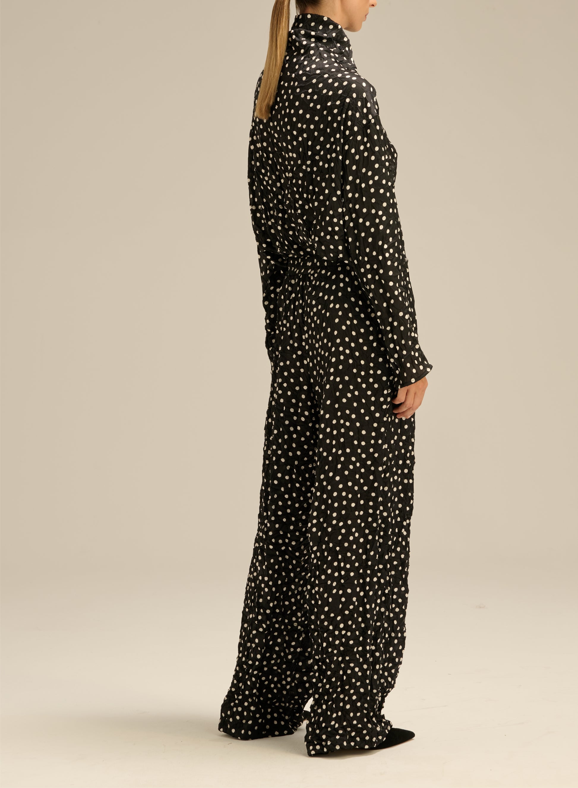 Luźna bluzka o kroju oversize z zabudowanym dekoltem w stylu woda. Posiada długie, szerokie rękawy. Wykonana z lekkiej, gniecionej tkaniny.