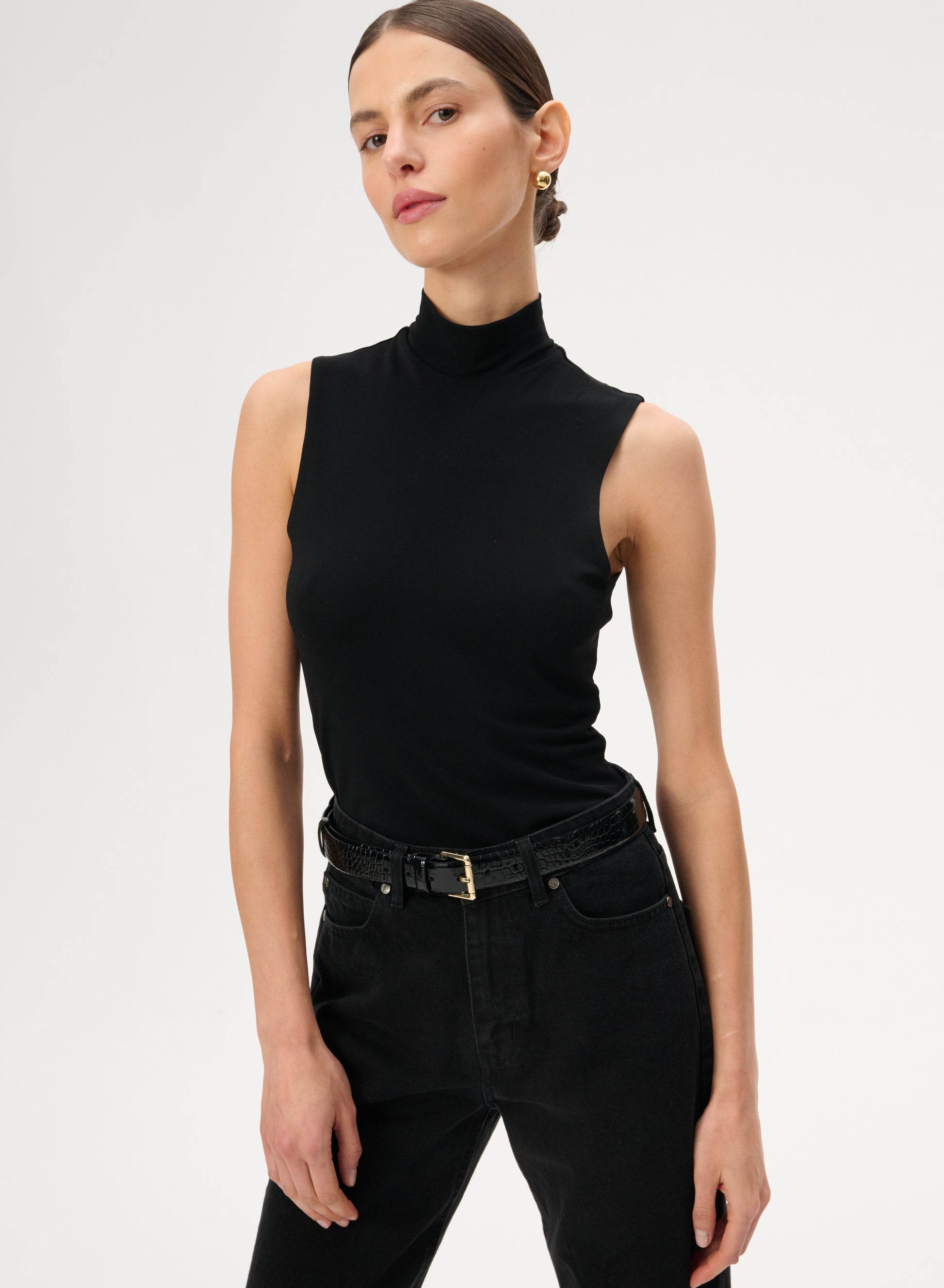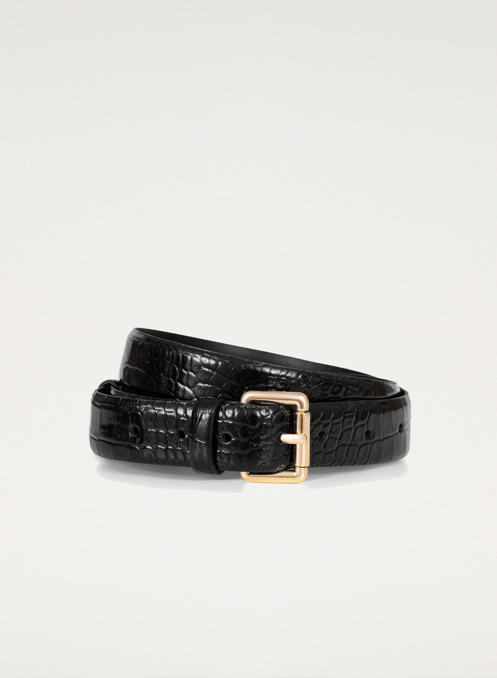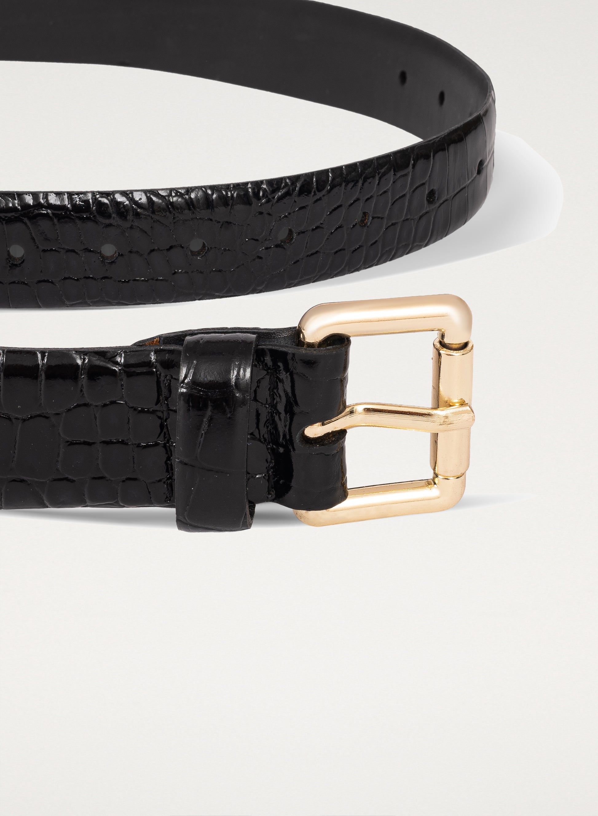 Klasyczny pasek wykonany z naturalnej, błyszczącej skóry tłoczonej we wzór skóry krokodyla w kolorze czarnym. Posiada kwadratową klamrę w złotym kolorze.
