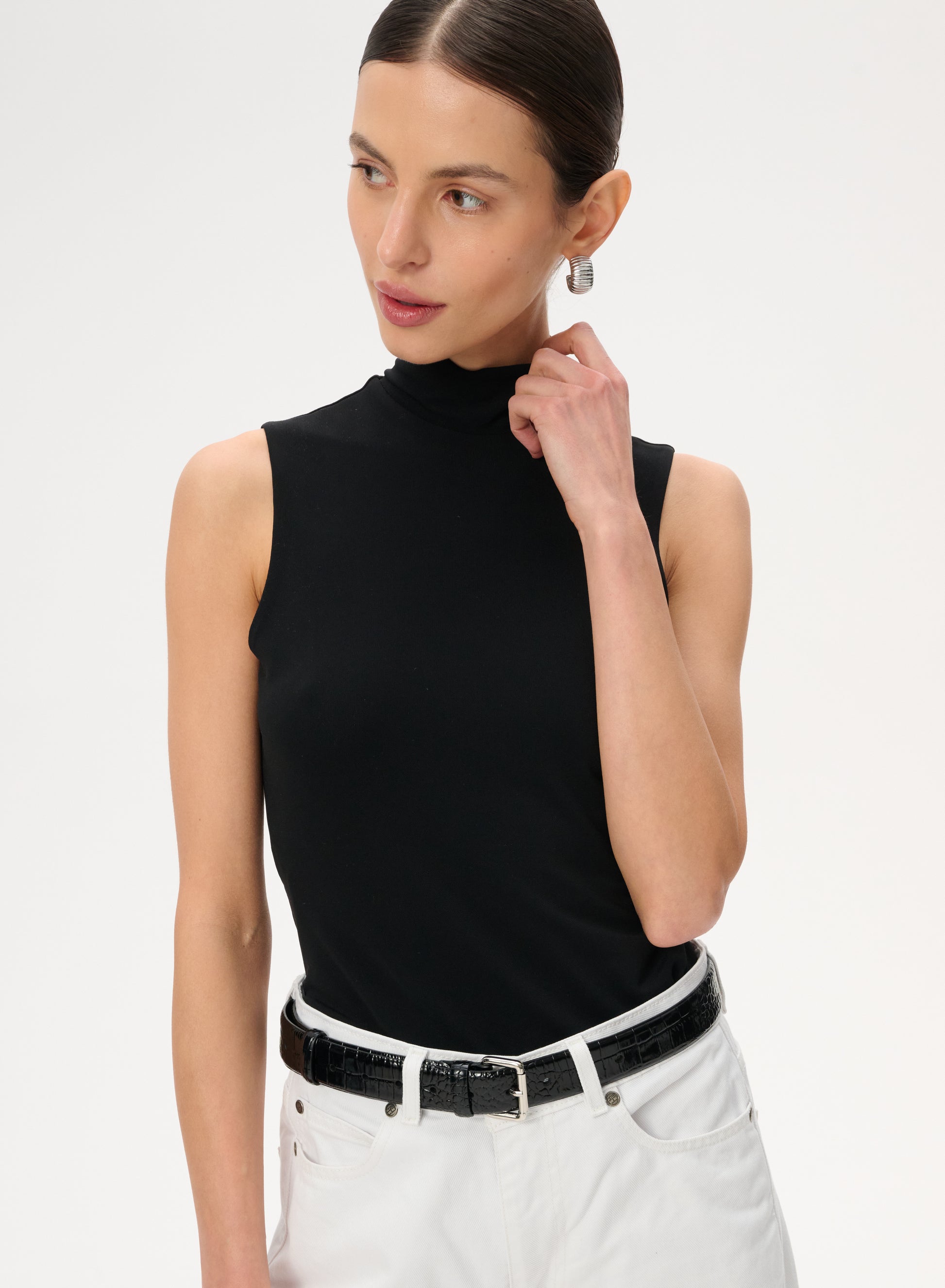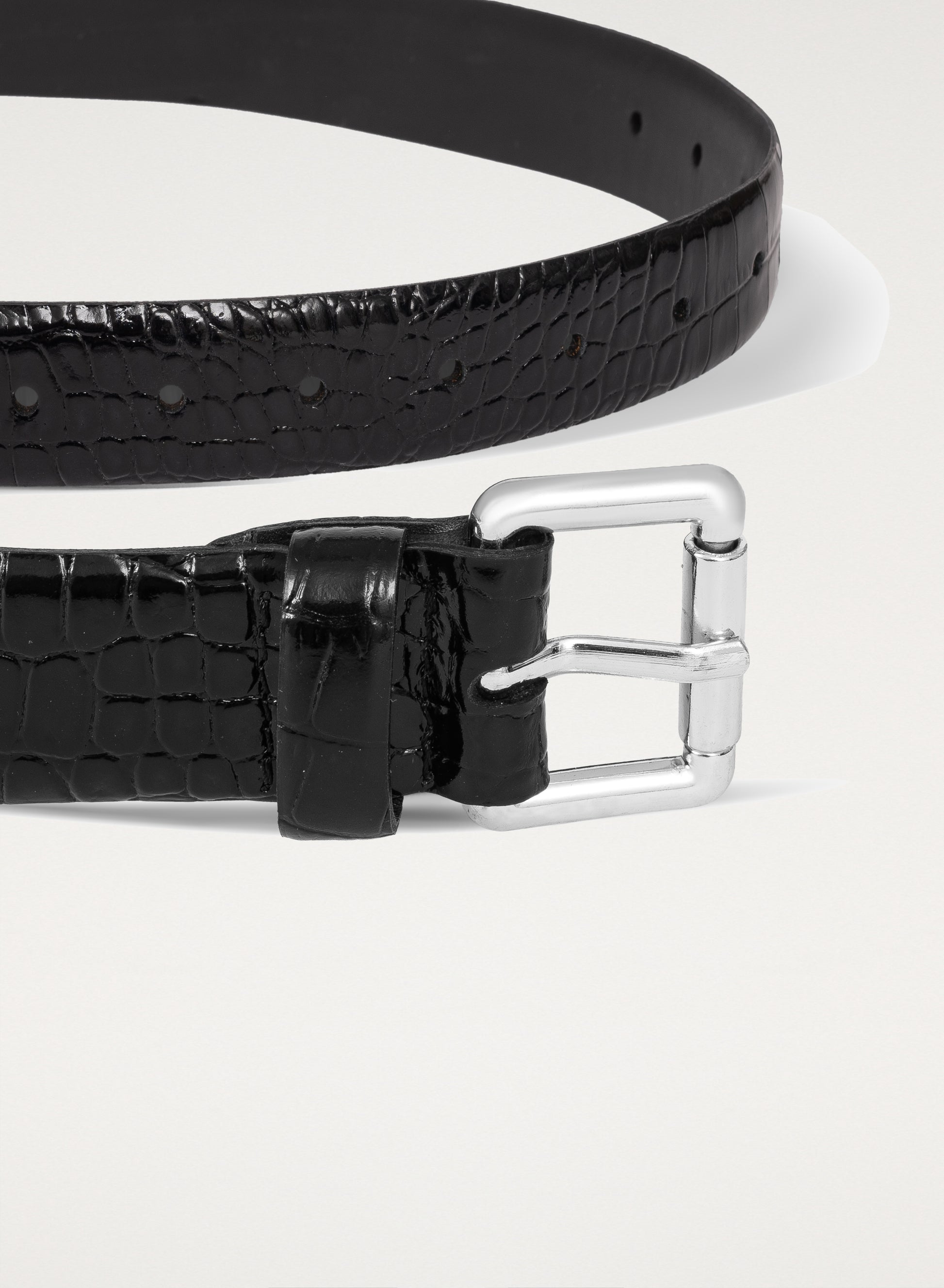 Klasyczny pasek wykonany z naturalnej, błyszczącej skóry tłoczonej we wzór skóry krokodyla w kolorze czarnym. Posiada kwadratową klamrę w srebrnym kolorze.
