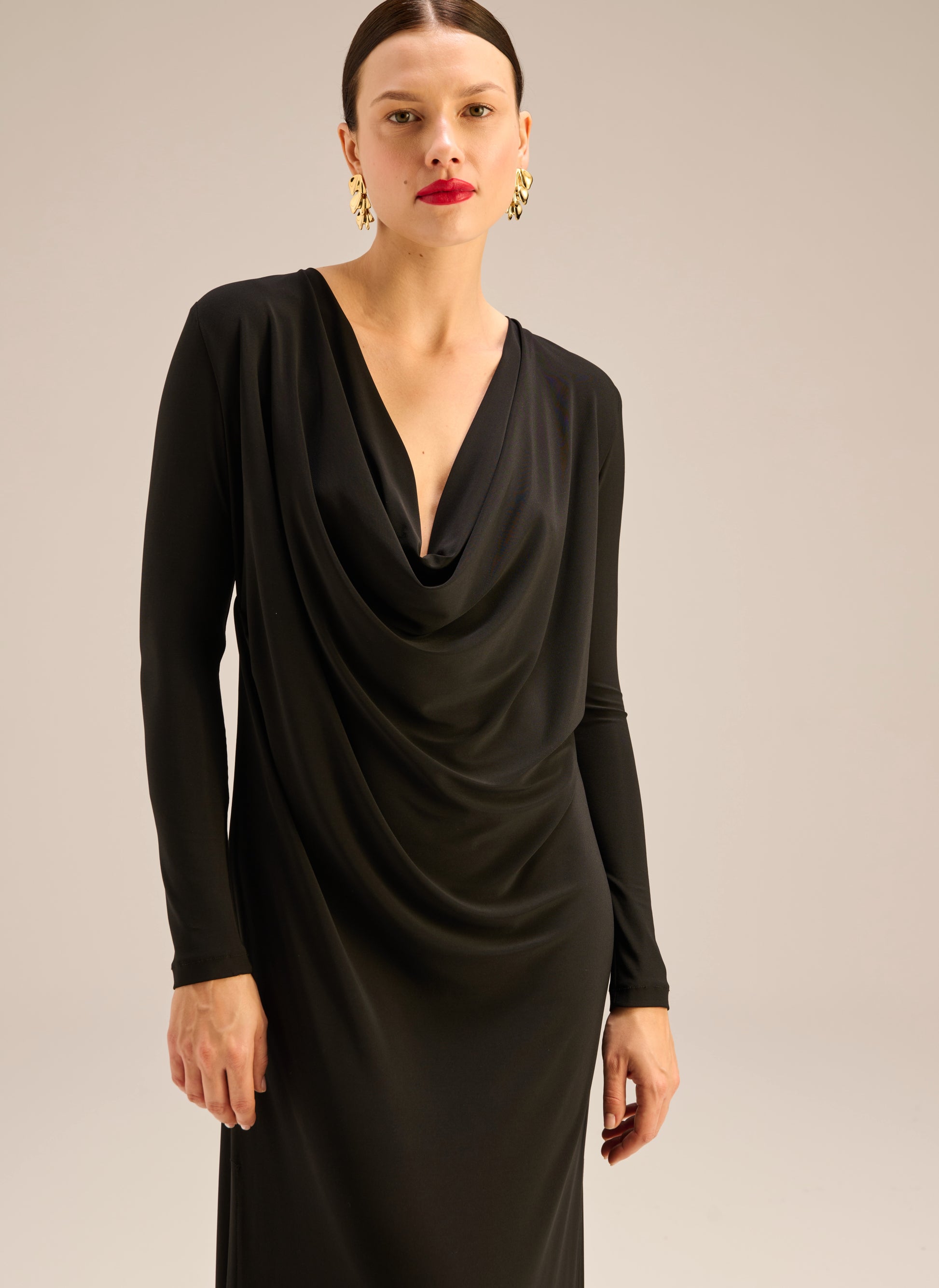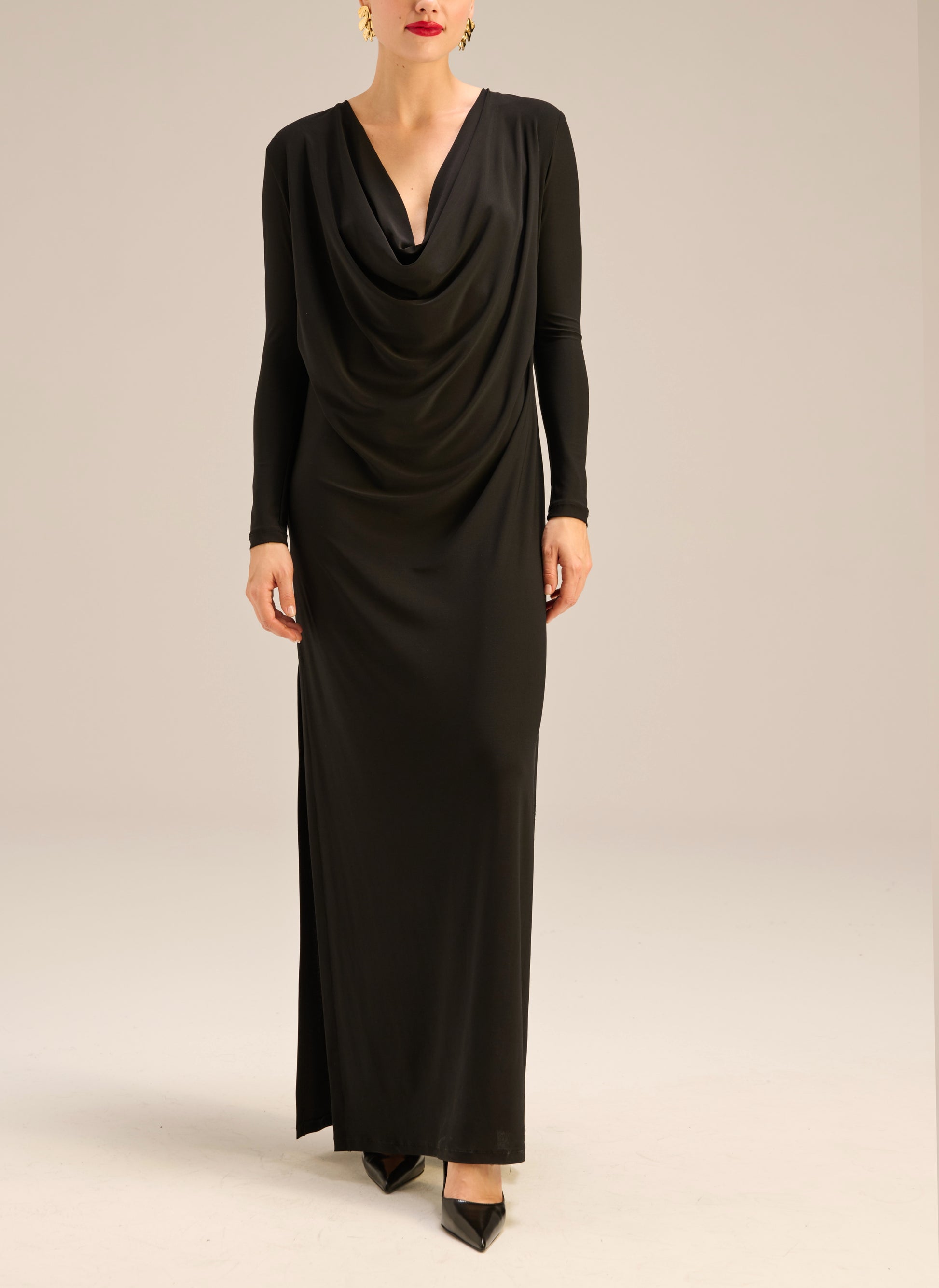 Dopasowana sukienka o długości maxi, wykonana z cienkiej dzianiny w czarnym kolorze. Jej minimalistyczną formę przełamuje miękko układający się dekolt typu woda.