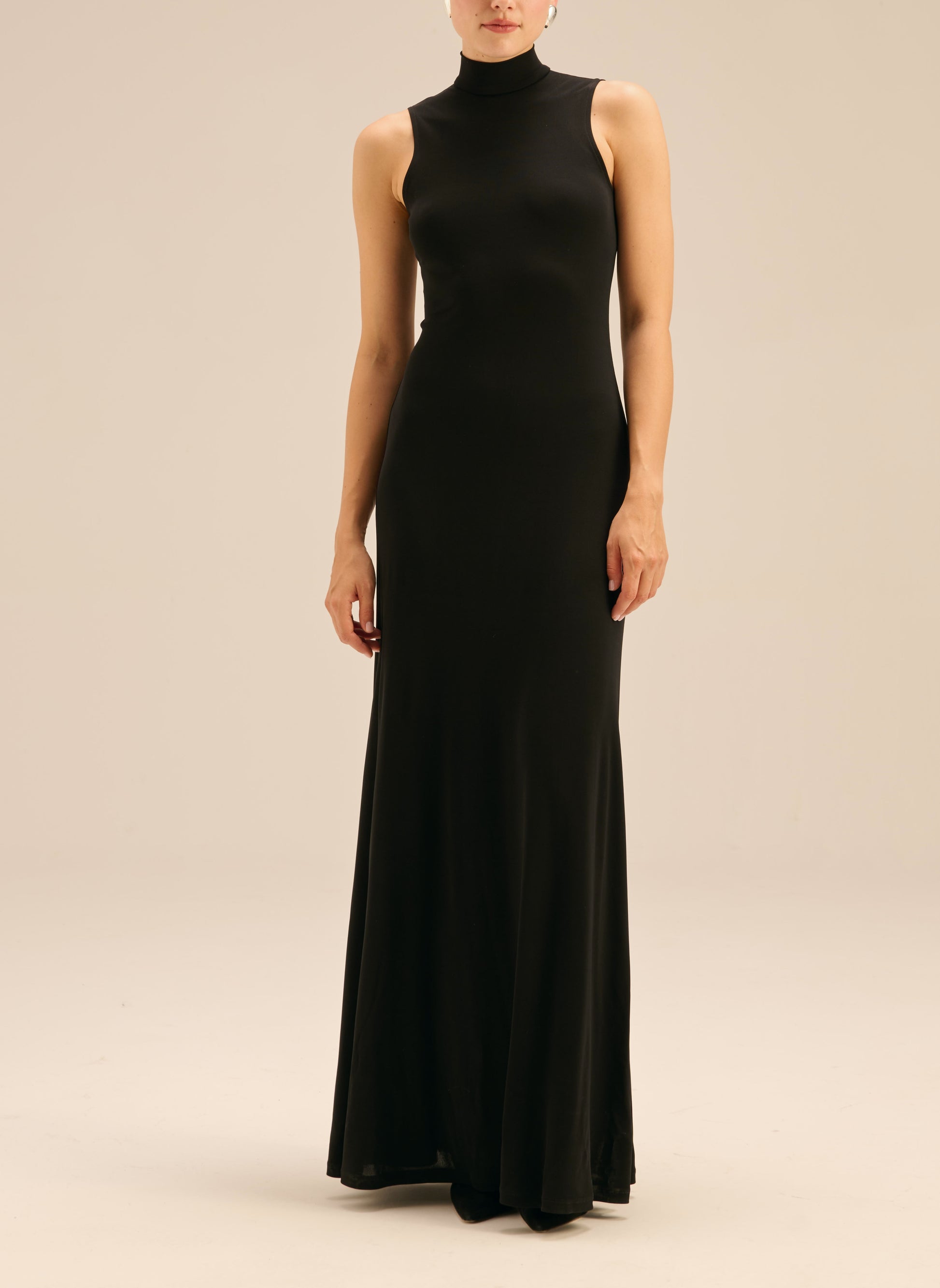 Minimalistyczna sukienka o długości maxi, wykończona krótkim golfem. Wykonana z cienkiej dzianiny w czarnym kolorze.