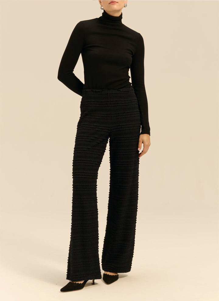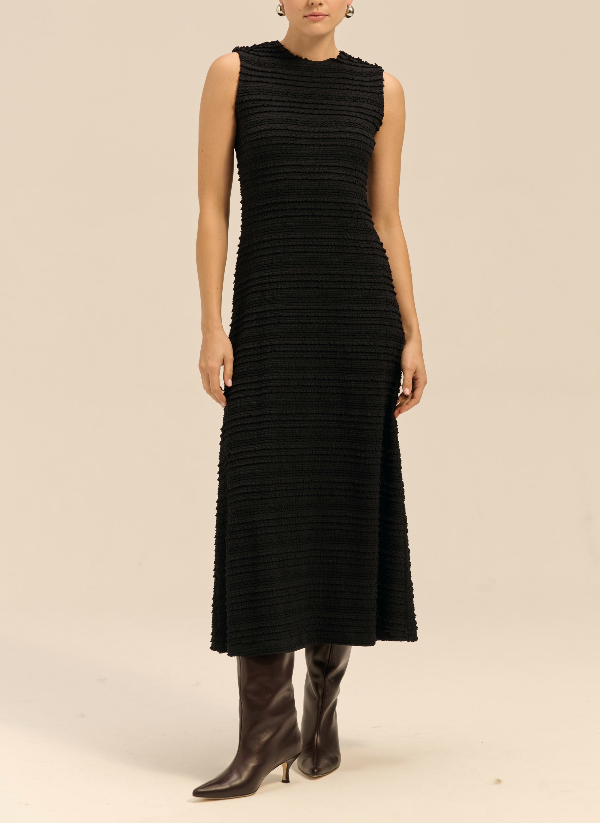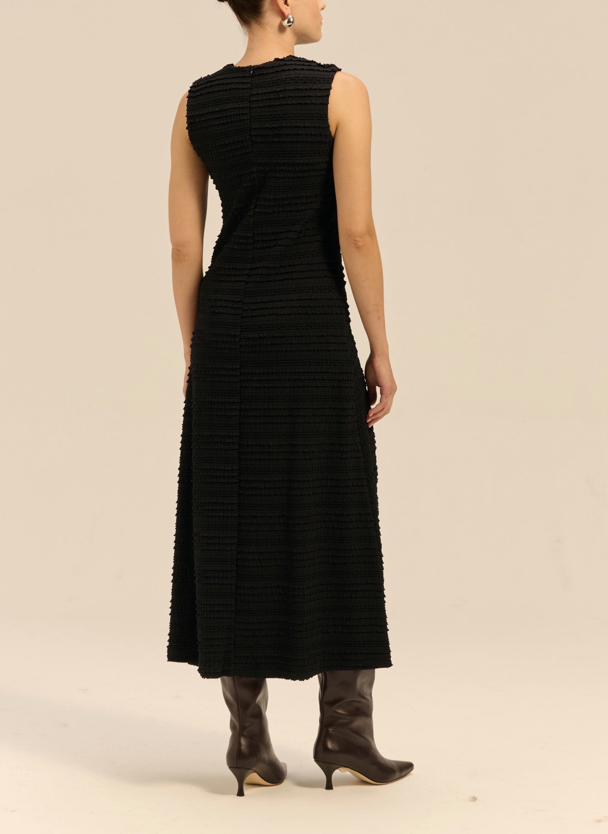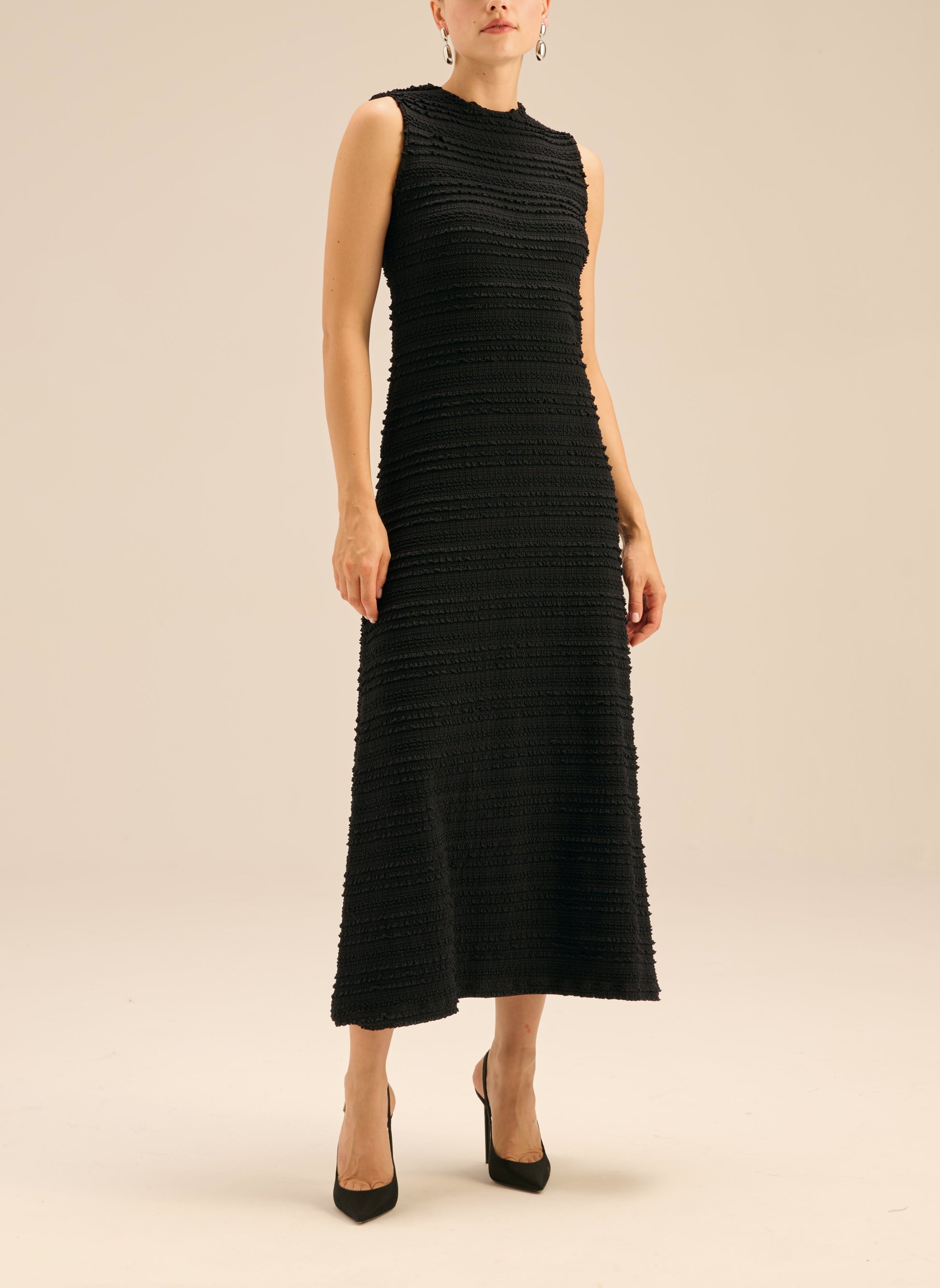 Sukienka o prostym kroju, rozszerzana ku dołowi, o długości do połowy łydki. Wykonana z miękkiej dzianiny, układającej się w falbanki wczarnym kolorze. Posiada zapięcie na kryty suwak oraz okrągły dekolt.