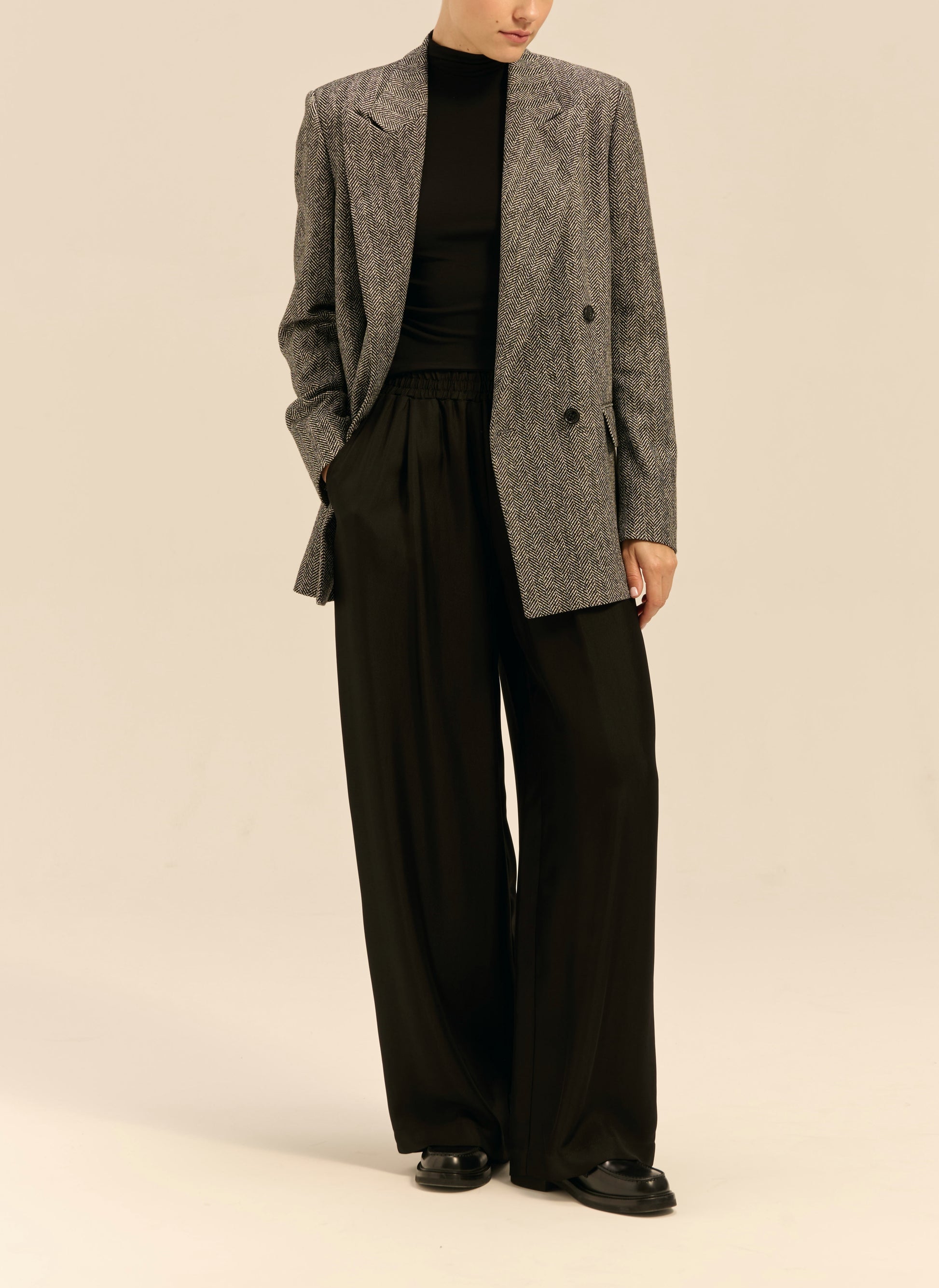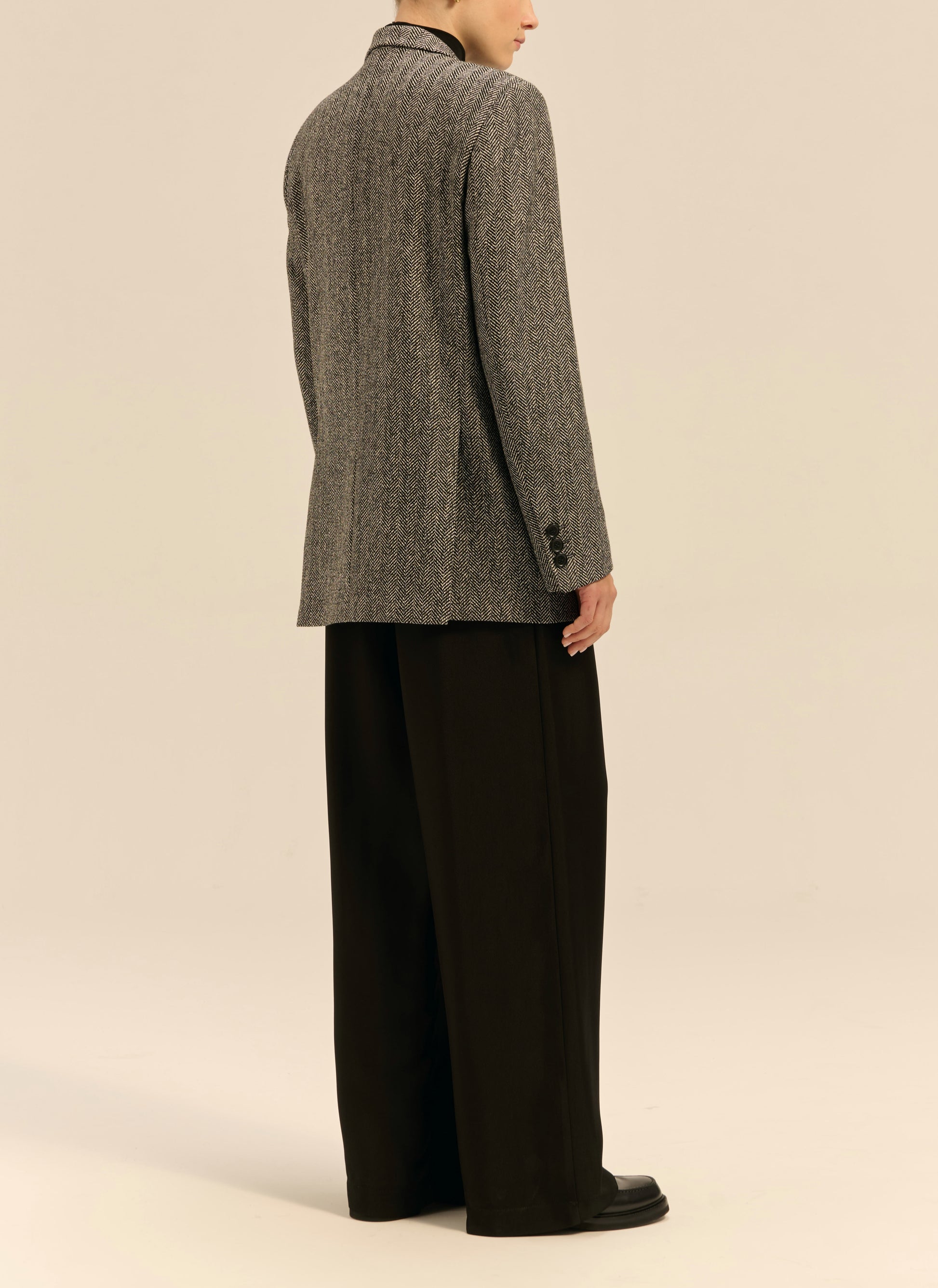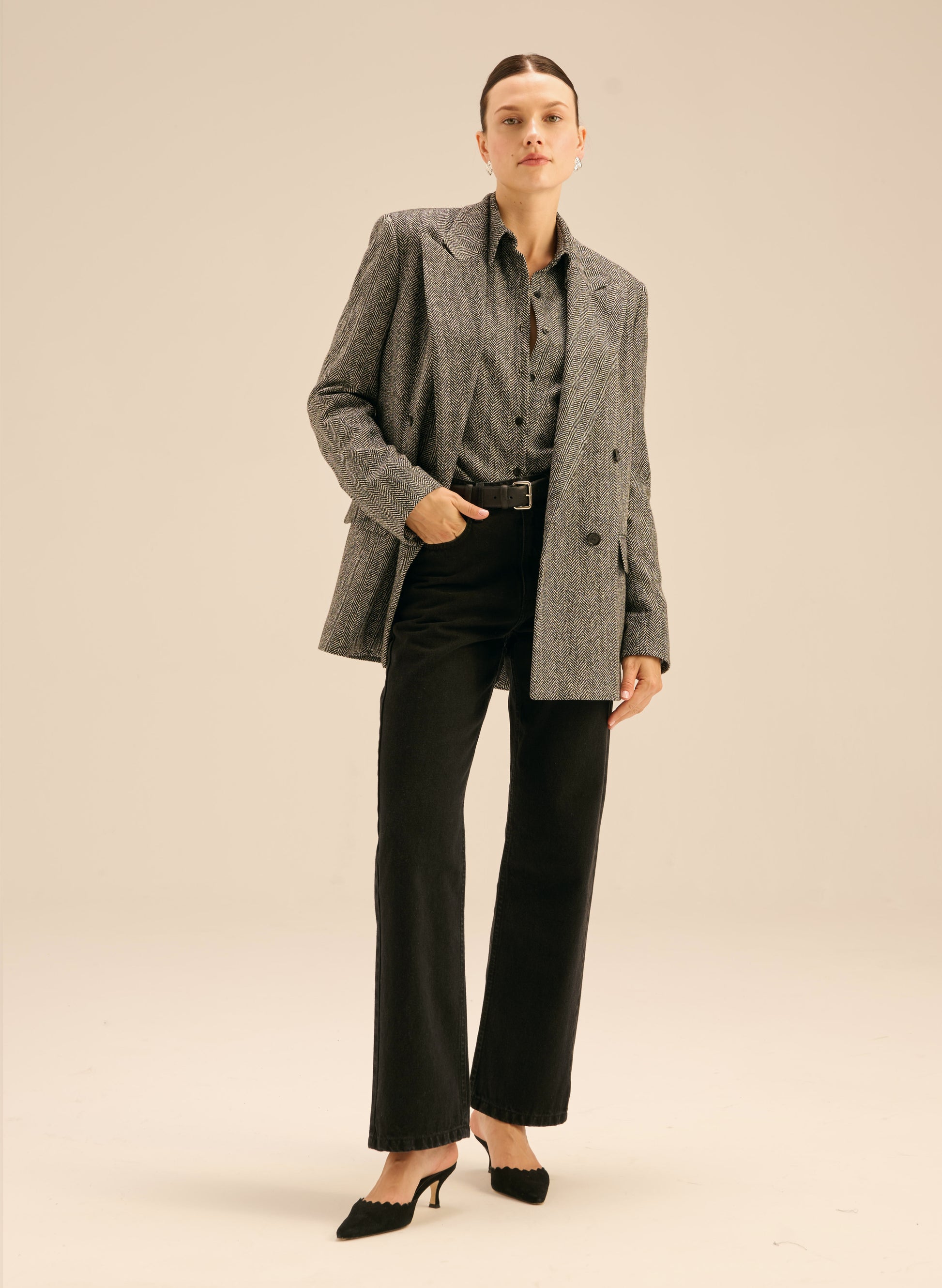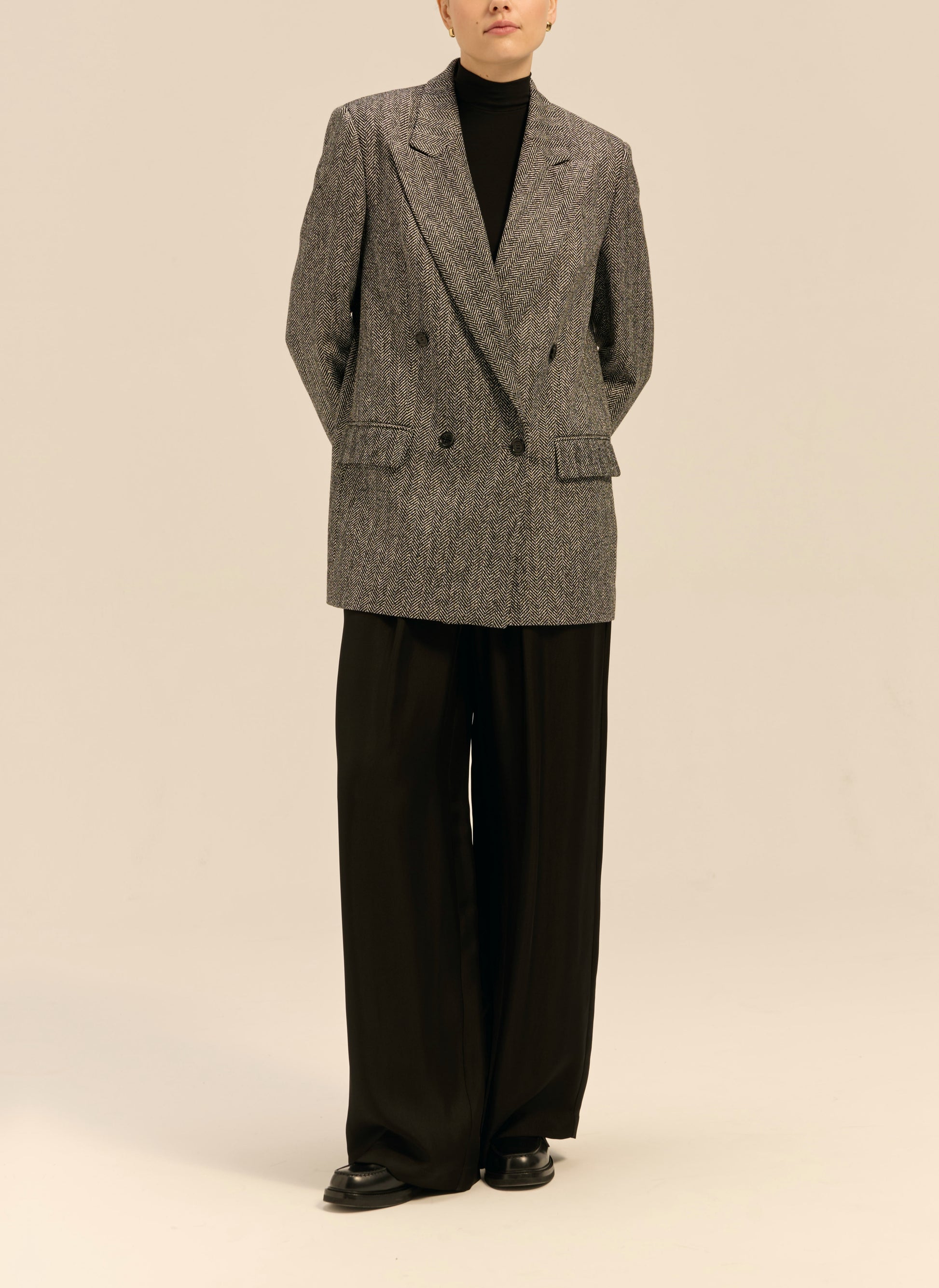 Marynarka o prostym kroju wykonana z miękkiej tkaniny we wzór jodełki w kolorze szarym. Posiada dwurzędowe zapięcie na guziki oraz kieszenie z klapami.