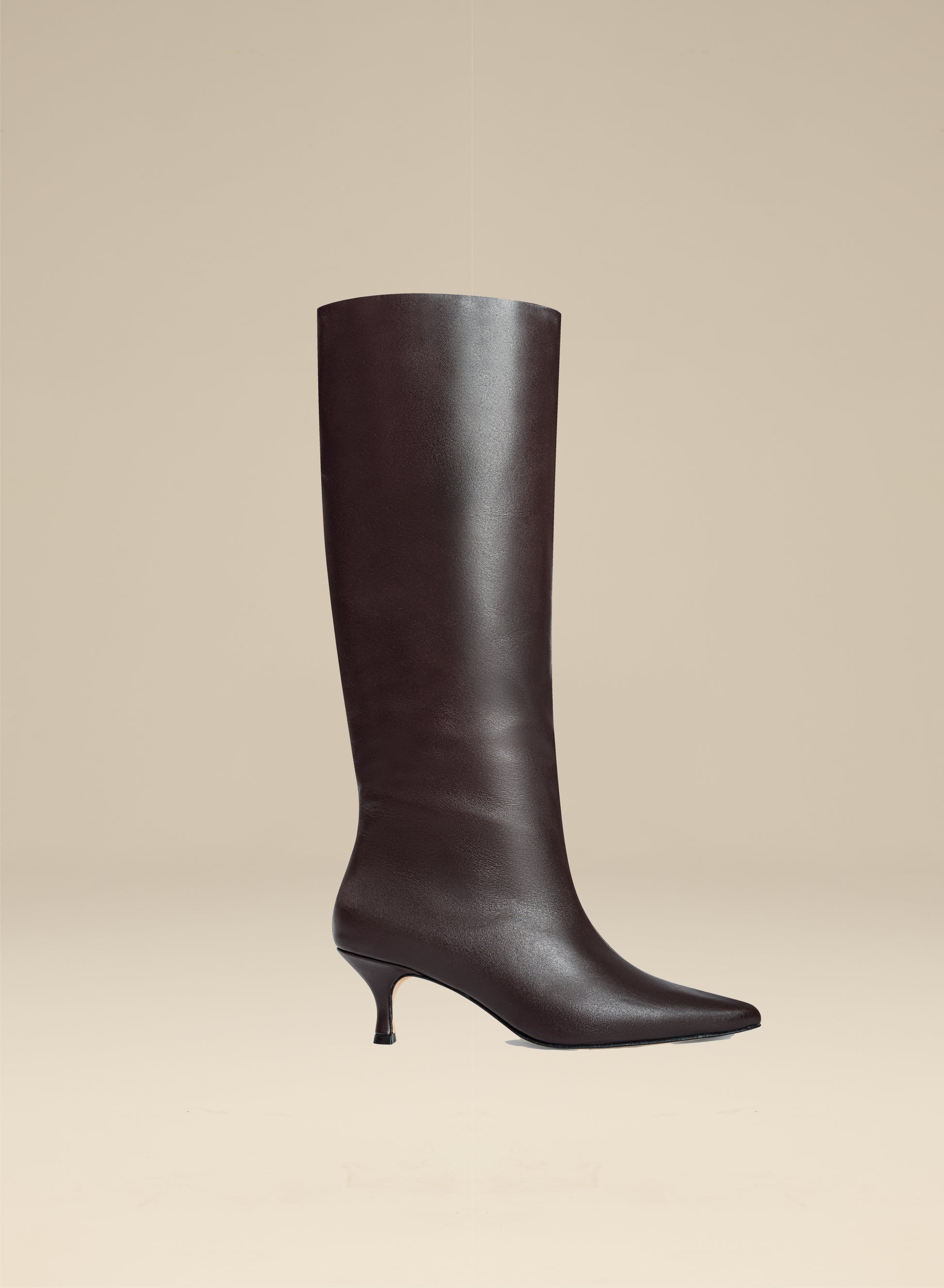 Długie kozaki na obcasie typu kaczuszka w kolorze głębokiego bordo. Wykonane ze skóry naturalnej. Posiadają sięgającą przed kolano cholewkę oraz wąski front ze spiczastym noskiem.