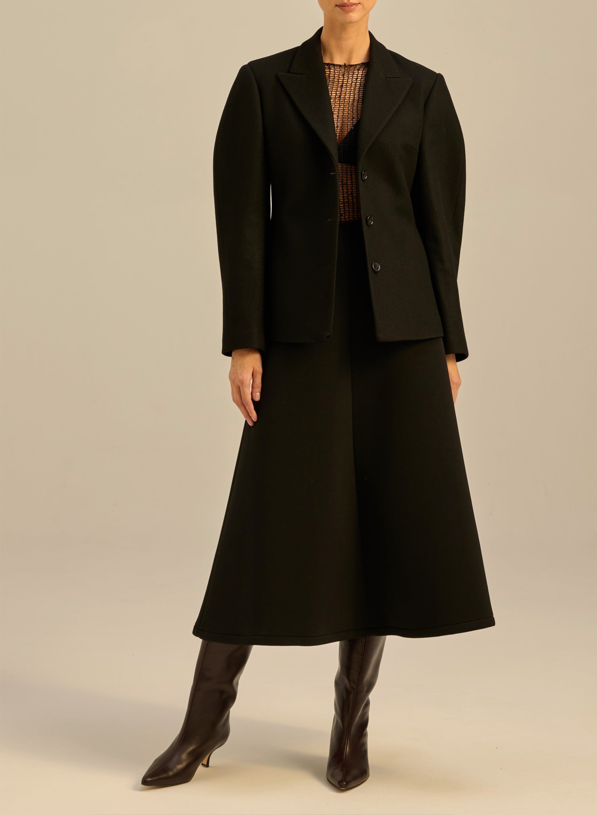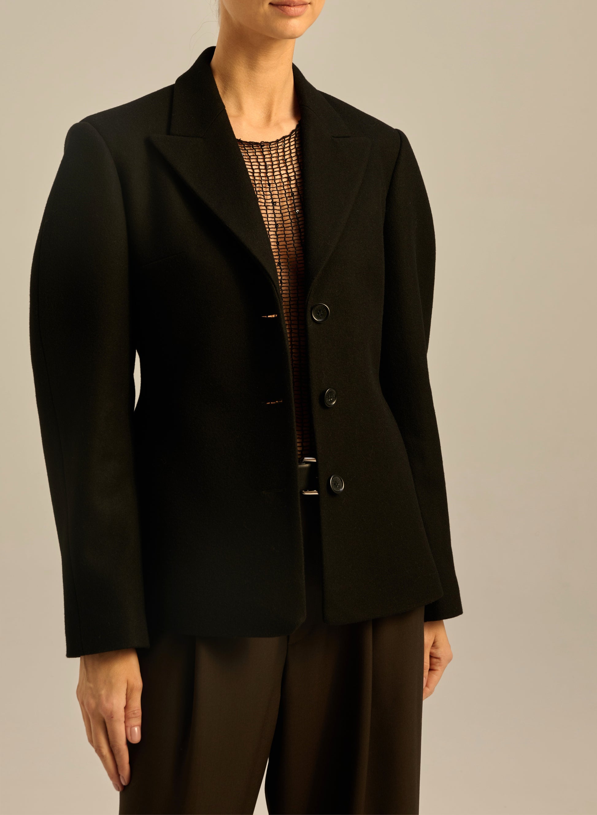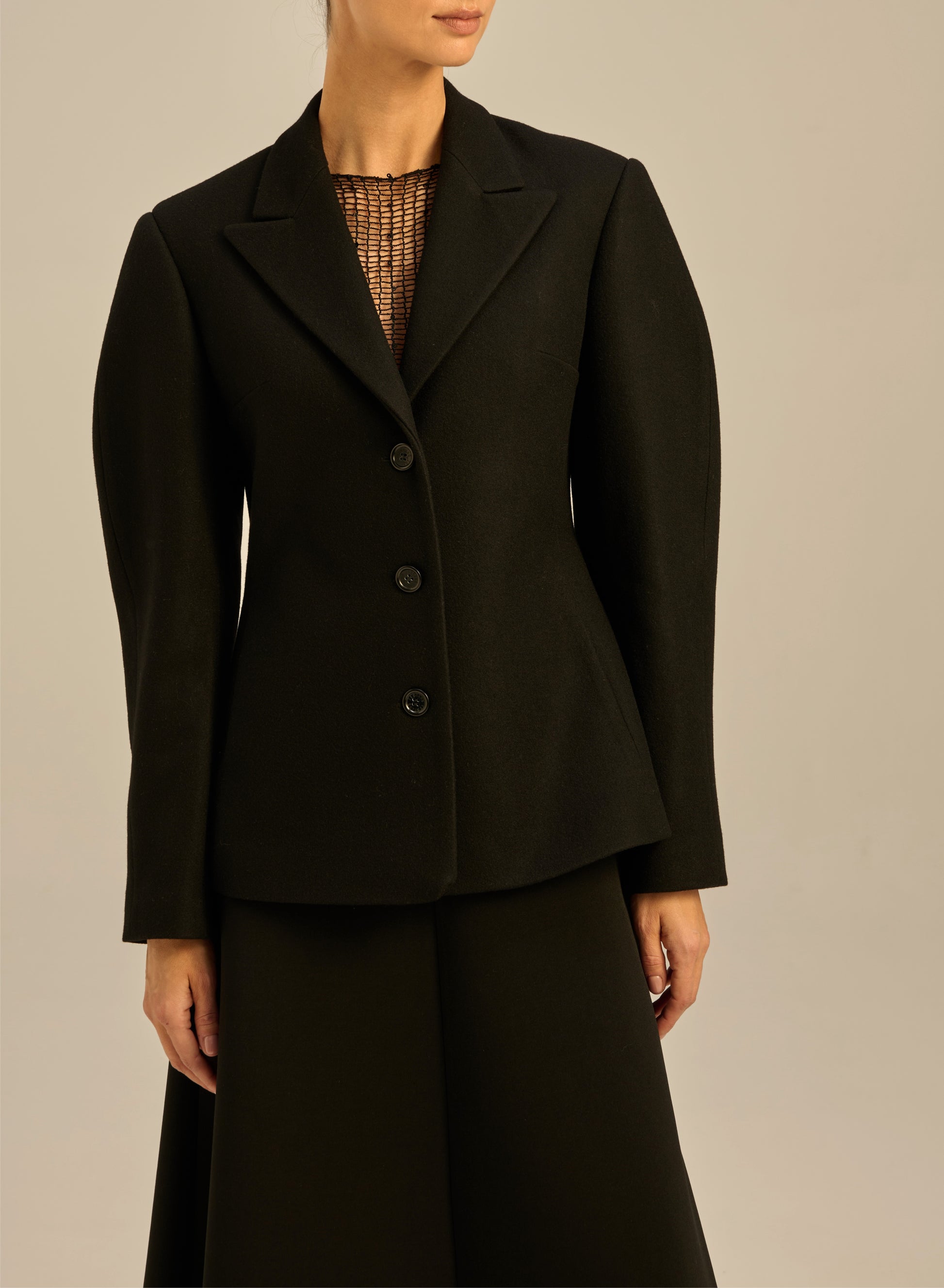 Taliowana marynarka wykonana z miękkiej wełny w czarnym kolorze. Posiada zaznaczone ramiona i rękaw o nietypowej, zaokrąglonej konstrukcji.