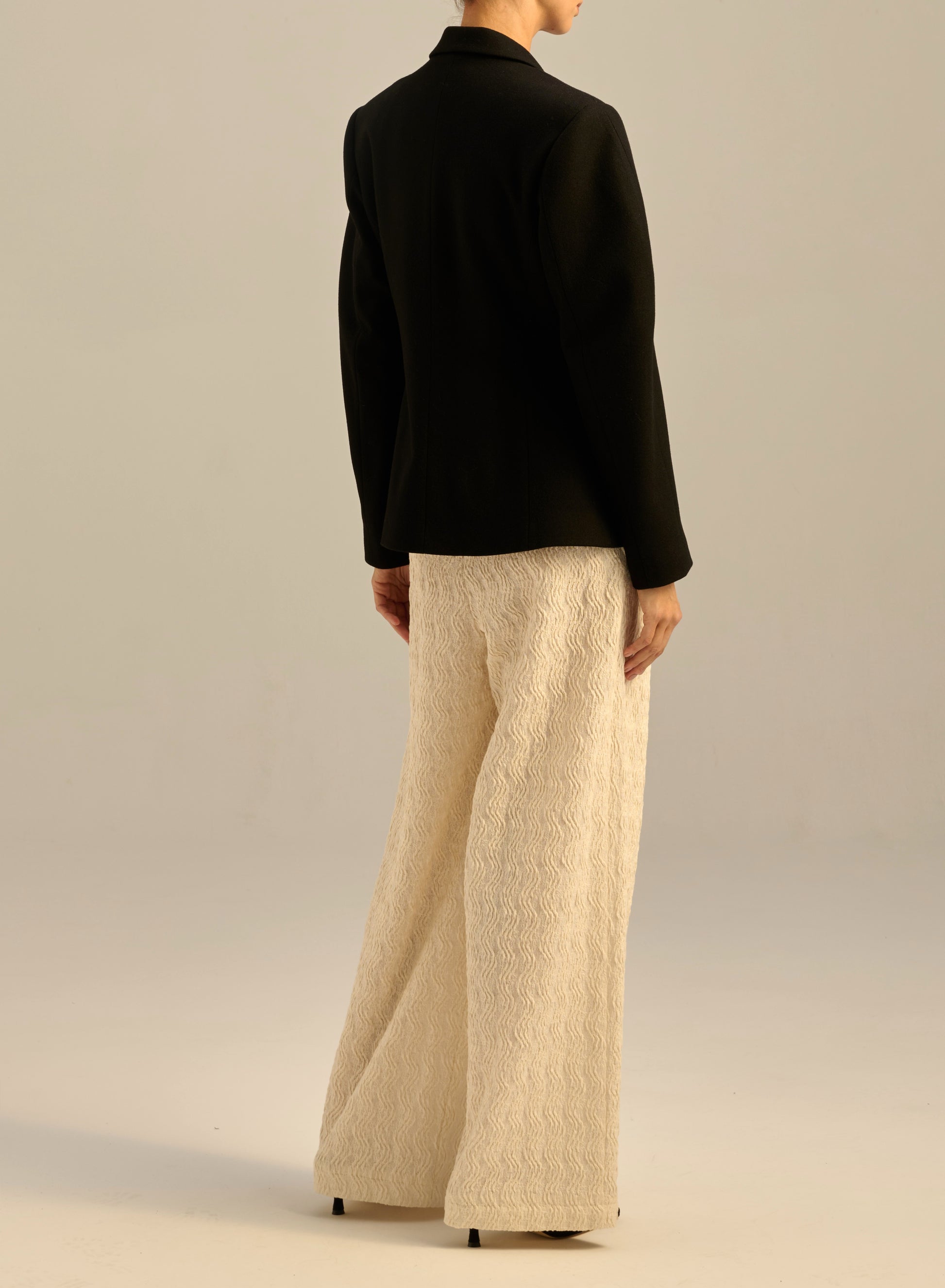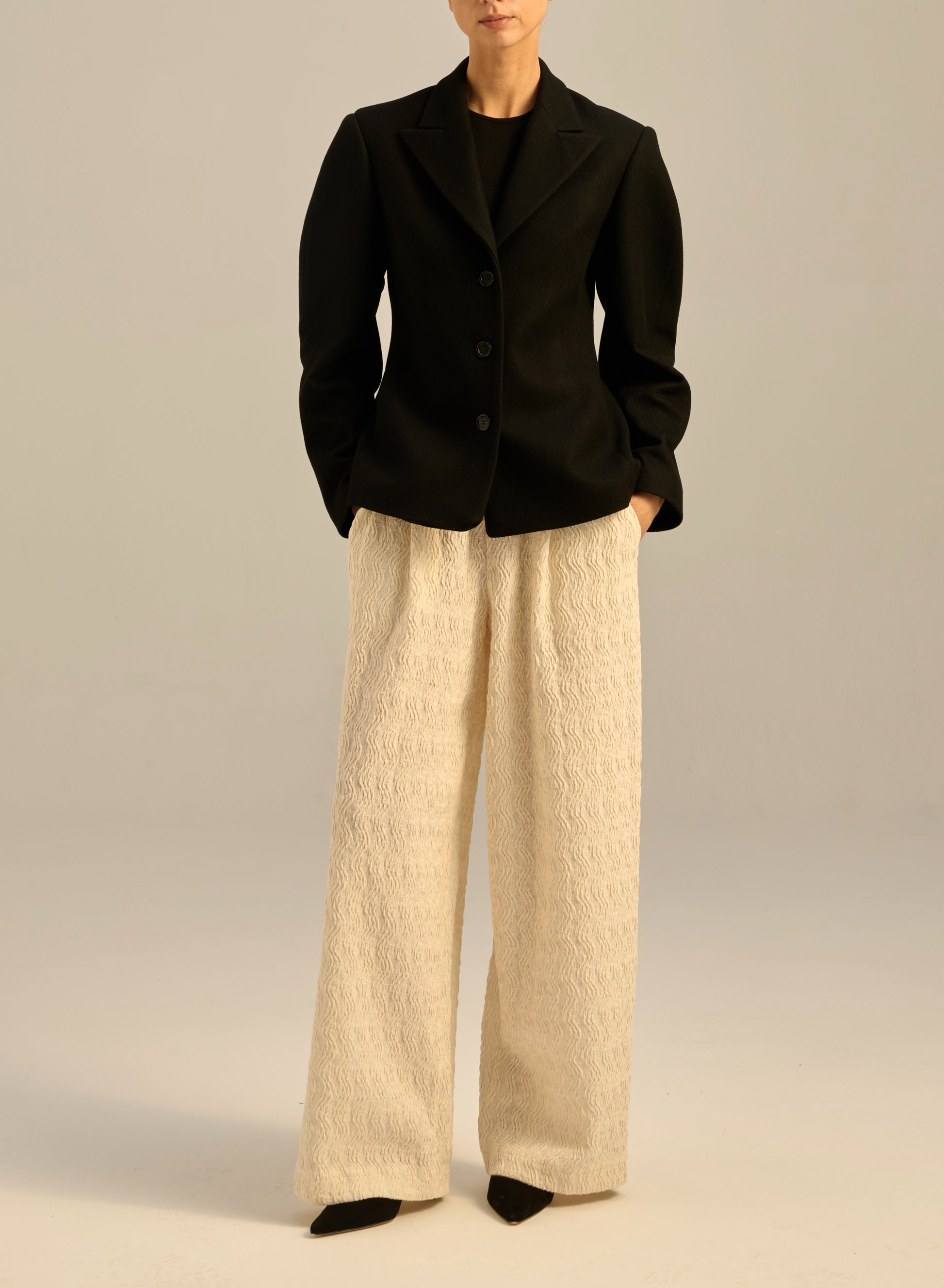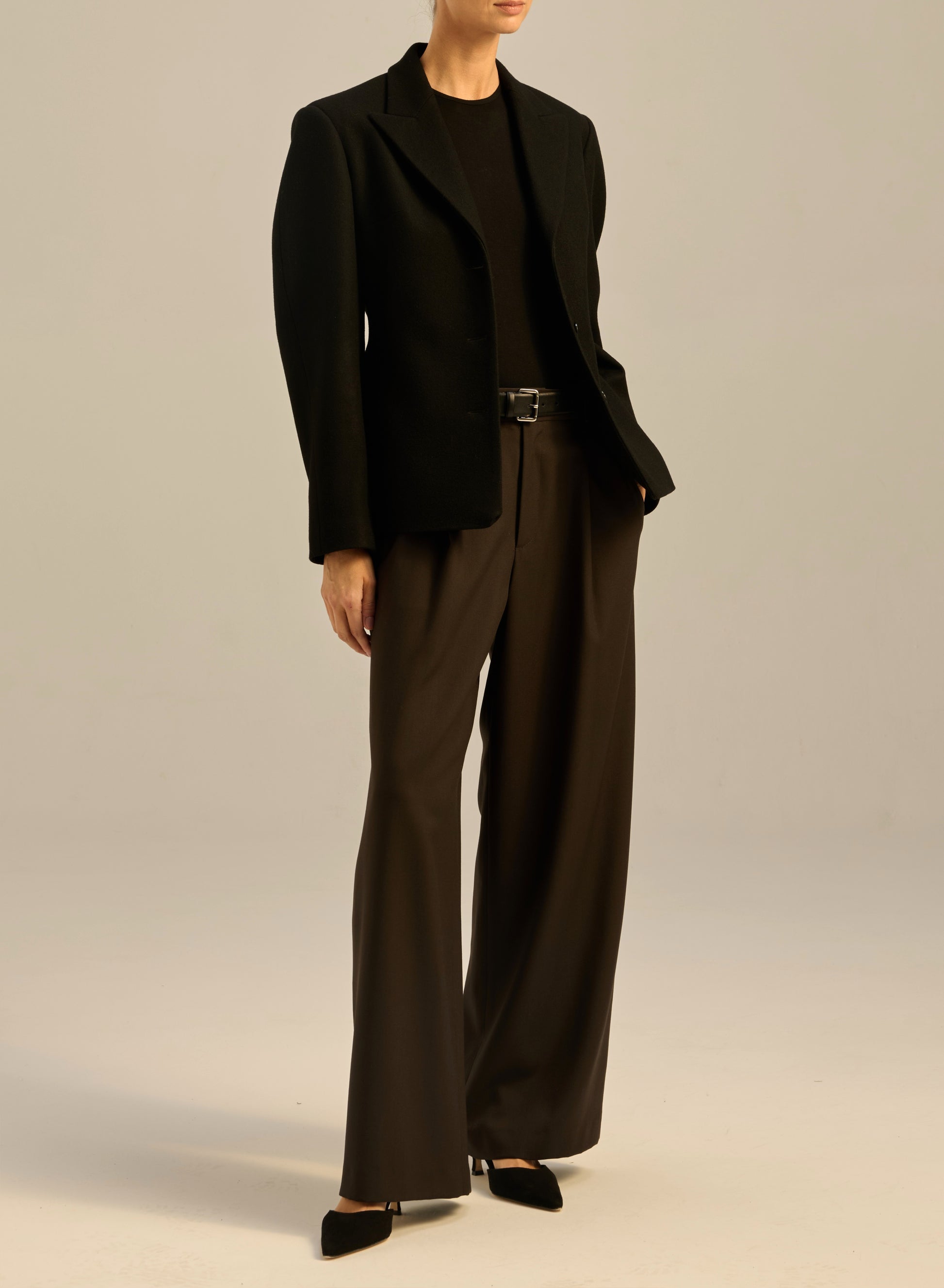 Taliowana marynarka wykonana z miękkiej wełny w czarnym kolorze. Posiada zaznaczone ramiona i rękaw o nietypowej, zaokrąglonej konstrukcji.