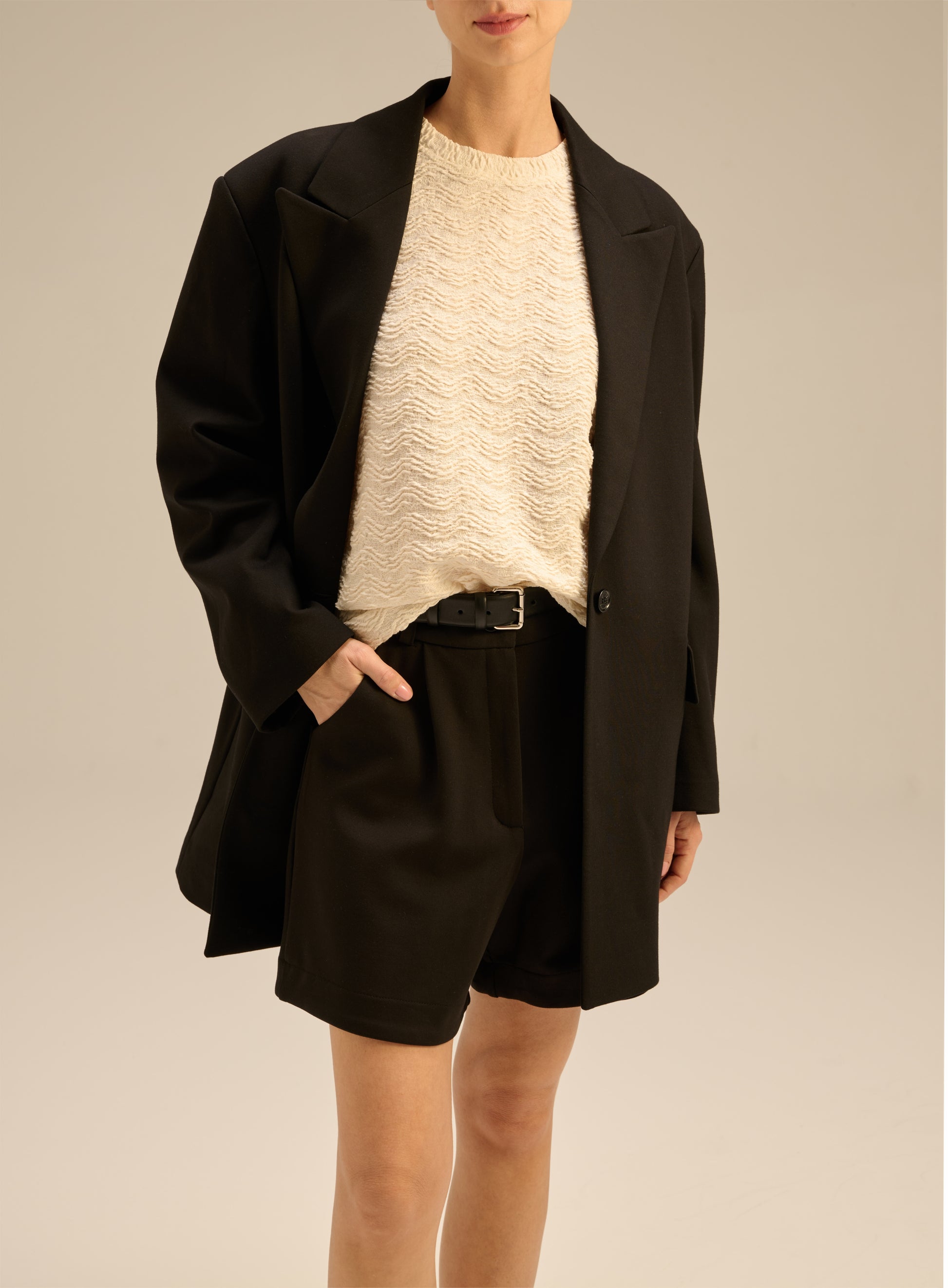 Oversize'owa marynarka z mięsistego jersey'u w czarnym kolorze. Posiada długie zamknięte klapy i zapięcie na pojedynczy guzik.