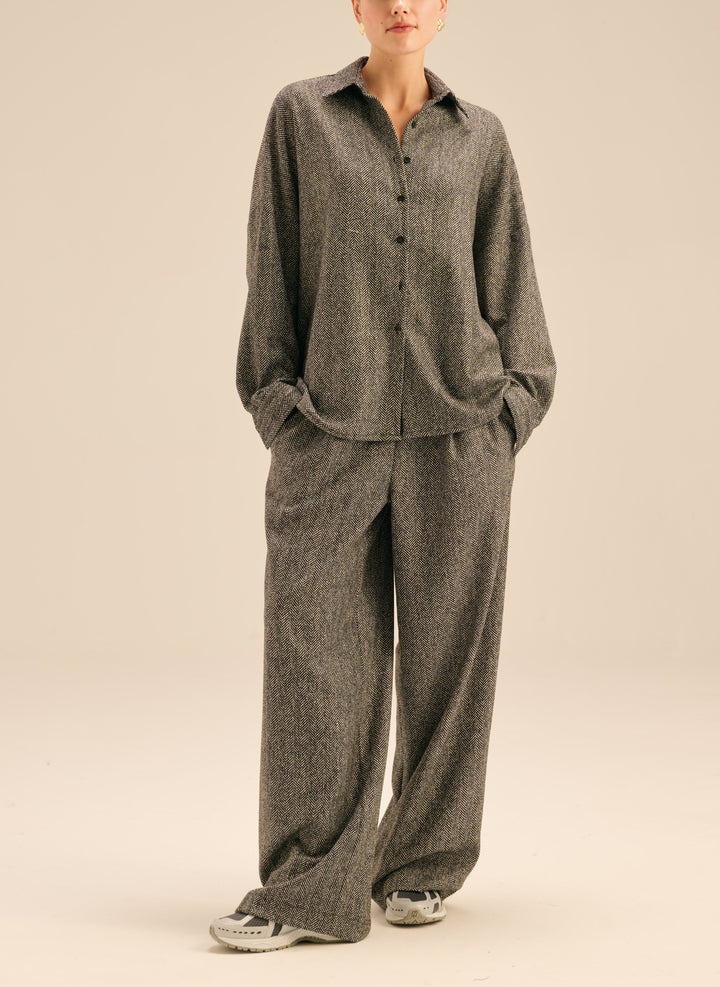 Marynarka o prostym kroju wykonana z miękkiej tkaniny we wzór jodełki w kolorze szarym. Posiada dwurzędowe zapięcie na guziki oraz kieszenie z klapami.
