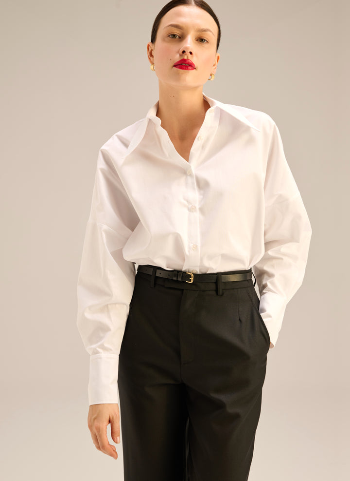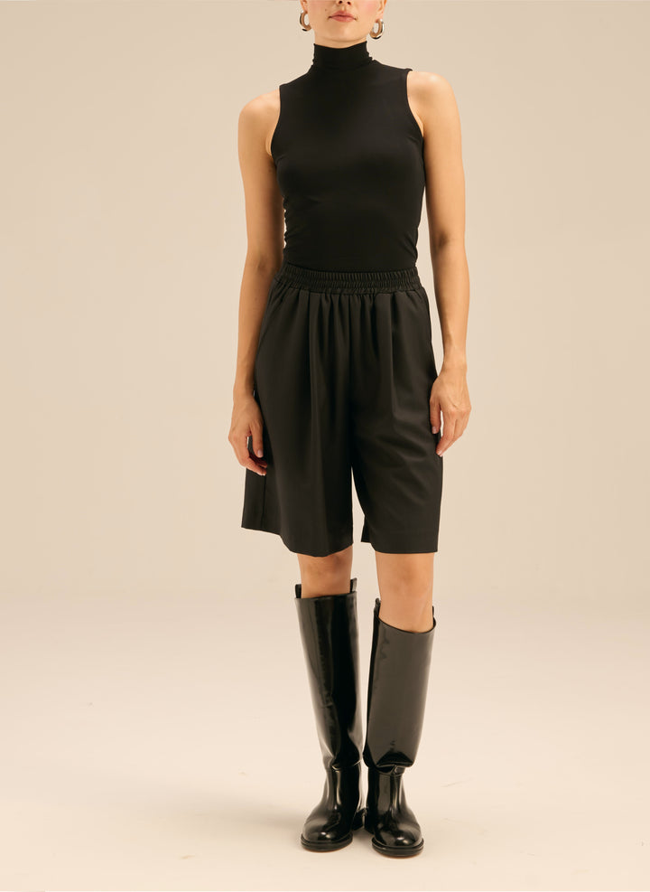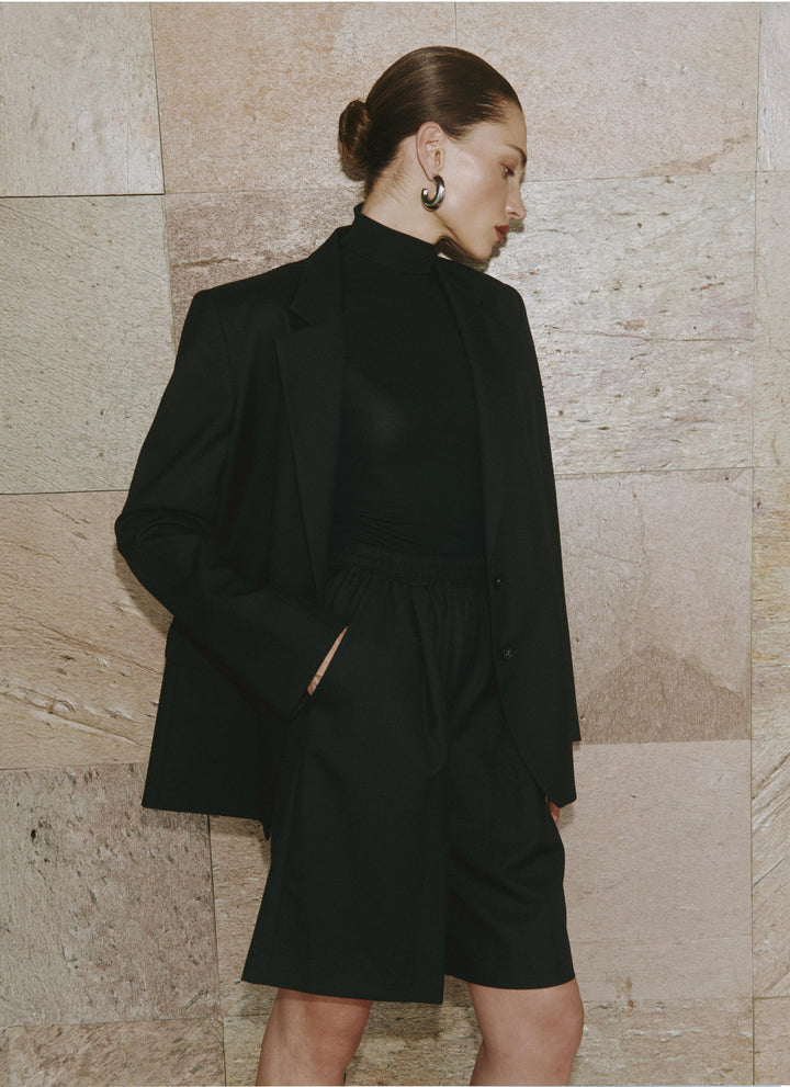 Ponadczasowy model wełnianej marynarki o luźnym kroju i szerokich ramionach, w czarnym kolorze. Zapinana na dwa guziki, posiada trójkątne klapy, kieszenie z patkami i pełną podszewkę.
