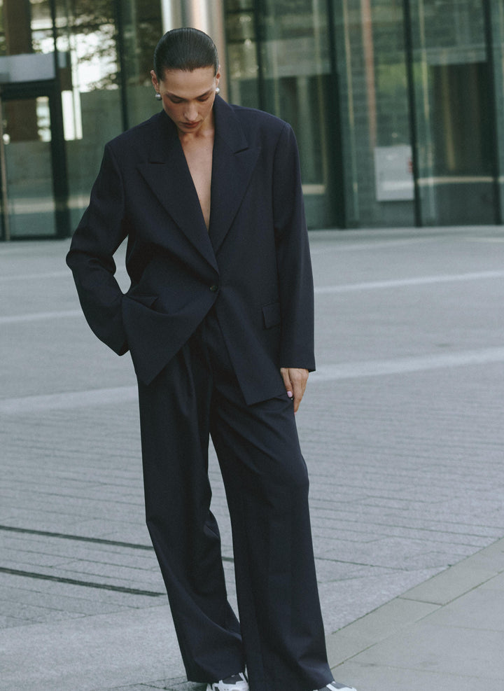 Lekka marynarka o kroju oversize. Posiada długie zamknięte klapy i zapięcie na pojedynczy guzik. Wykonana w całości z miękkiej wełny dziewiczej w kolorze granatowym.