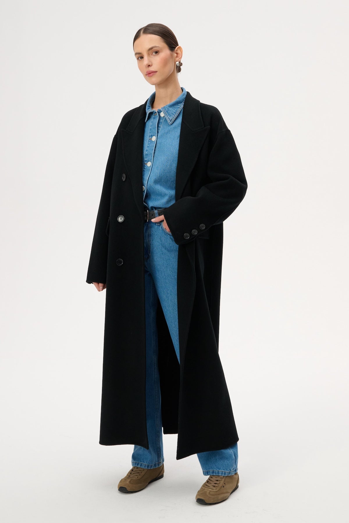 Płaszcz maxi z wełny dziewiczej z dwurzędowym zapięciem czarny - Joel