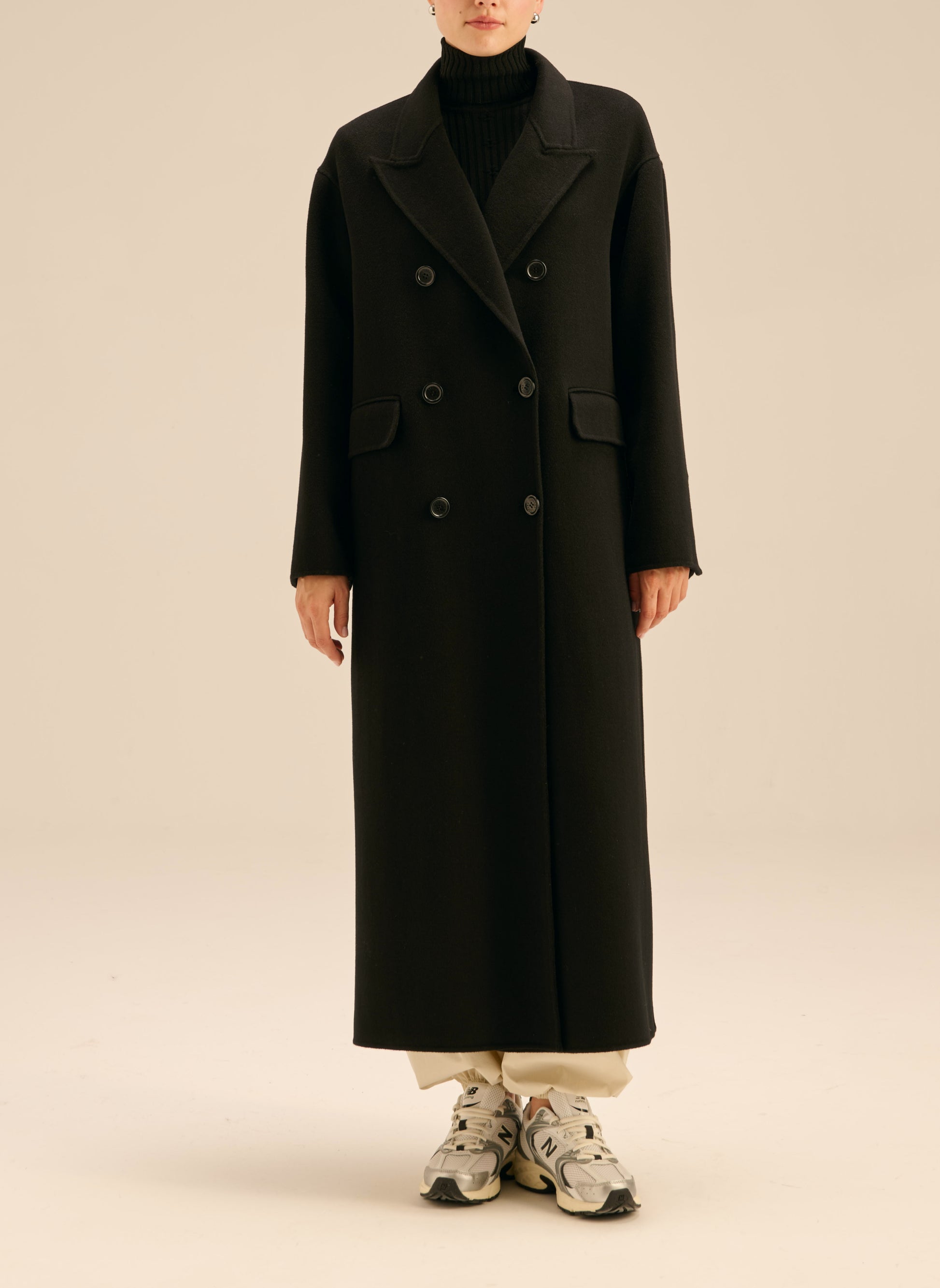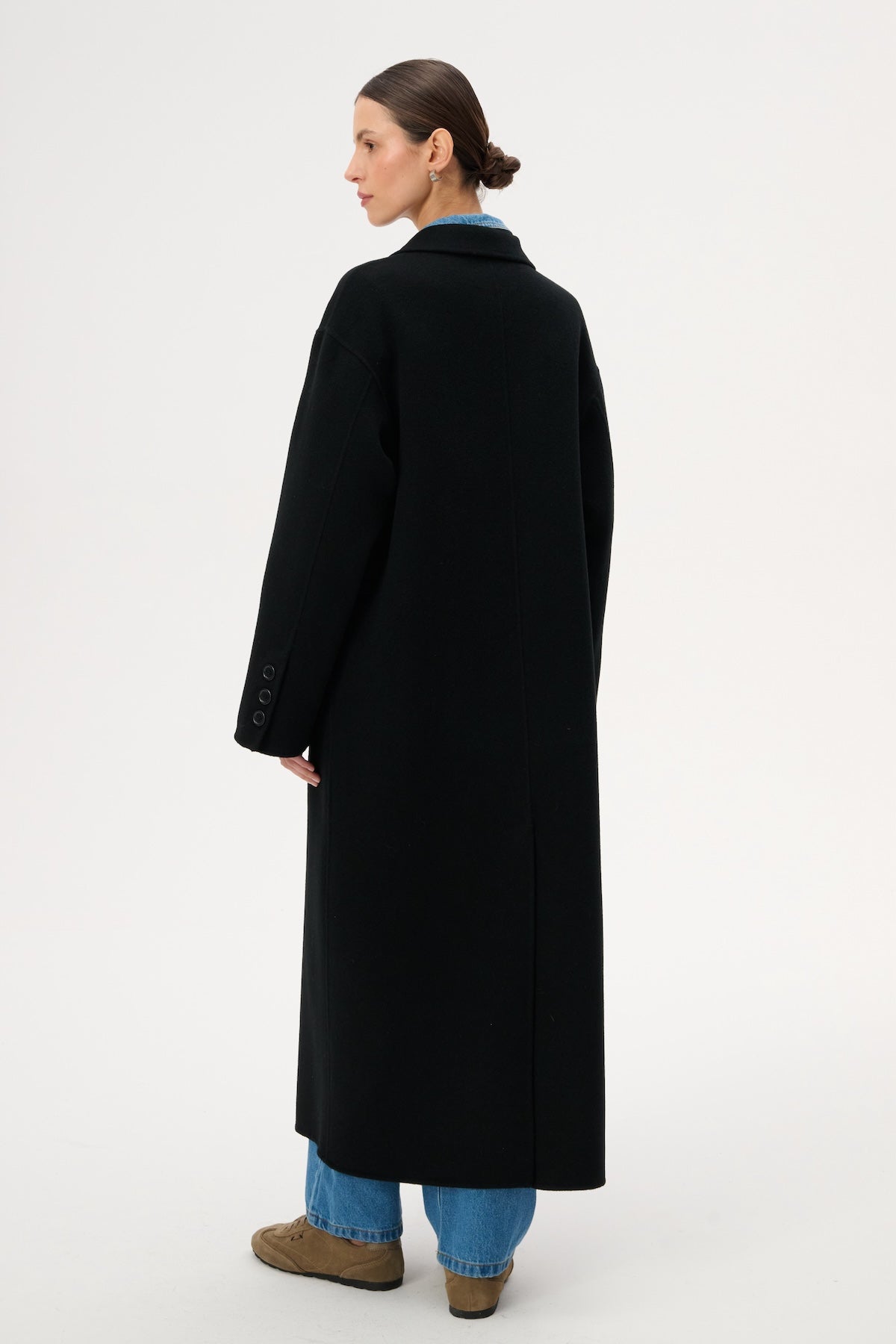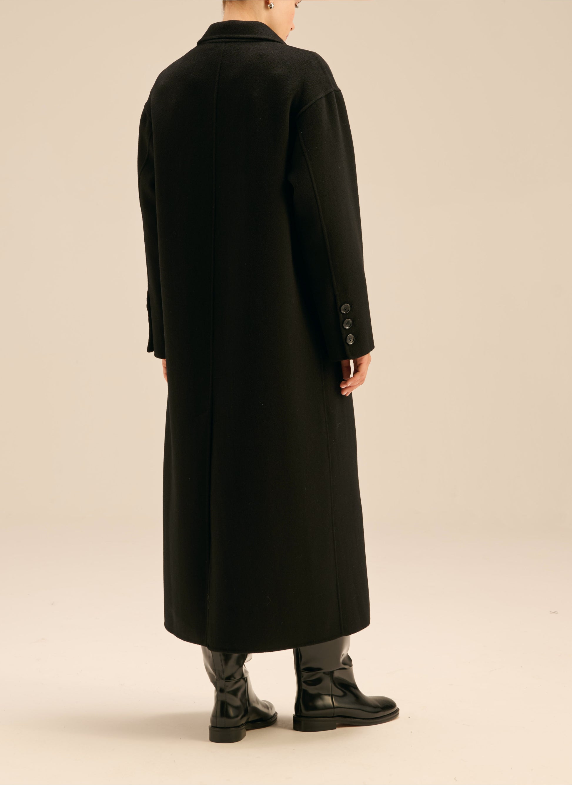 Długi płaszcz o kroju oversize. Wykonany w 100% z miękkiej wełny w czarnym kolorze. Posiada dwurzędowe zapięcie na guziki, szerokie klapy oraz dwie kieszenie. Model bez podszewki/ double face.
